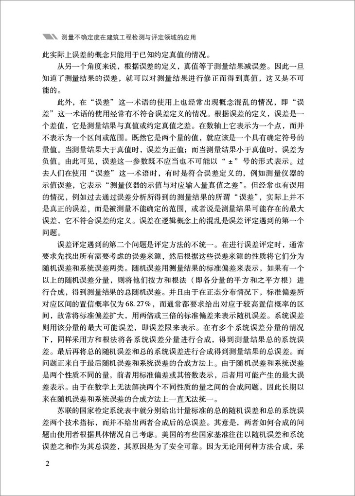 在国家经济建设、科学研究和日常社会生活中,人们每天都在进行大量的测量。在具体的建筑质量检测与评定方面,测量工作起着关键作用。测量者最为关心的是测量是否有效、测量结果是否可信,或者说测量的质量(品质)如何。但是,回答这些问题有一定的难度,因为影响测量结果的因素很多,测量数据与被测真值相比会产生误差,误差的大小或限度代表所测数据的准确程度。科学上不但要求对物理性质用量化来表现,同样对数据的准确程度也要求用量化表现出来,这个数字当今被称为测量的不确定度,它具有概率的意义。利用测量不确定度来评定测量水平或质量,是在总结大量测量实践和误差理论的基础上得出的一个重要成果。