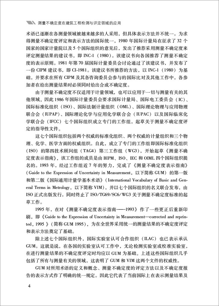 目前,工程技术人员在建筑工程检测工作中对测量不确定度尚未引起足够的重视。对土建专业而言,尚缺乏一本阐明测量不确定度理论在工程中具体应用的书籍。因而,作者编著此书,对这一理论及其在房屋建筑工程检测中的应用作了较系统全面的论述,同时列举了工程质量检测过程中一些常用检测参数的不确定度评定实例,并以此抛砖引玉,望有关工程技术人员做更深入的探讨和推广。