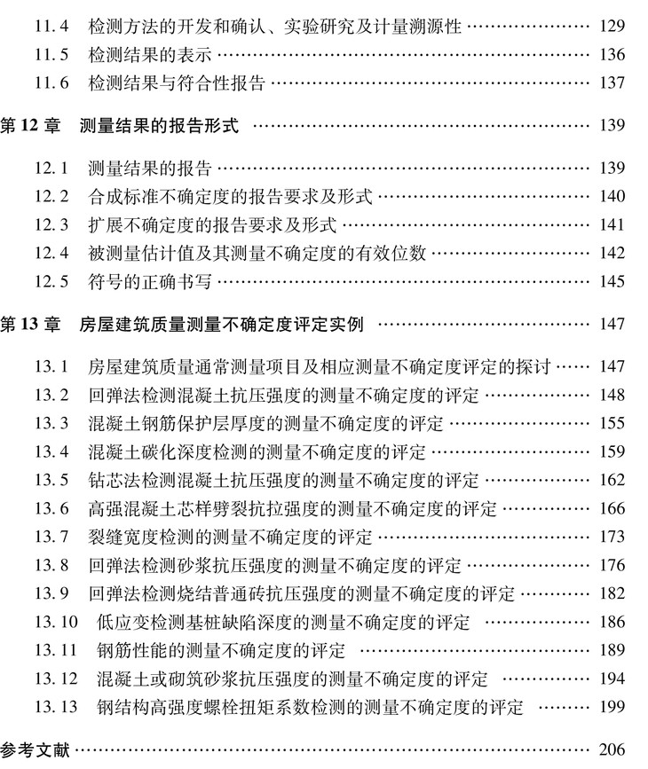 本书针对测量不确定度评定在建筑工程质量检测中的应用需求,详细介绍了一些常用检测项目的不确定度评定方法。本书主要内容有:测量不确定度的基本概念,测量不确定度的来源、分类及其数学模型的建立,计算合成标准不确定度,扩展不确定度,自由度和正态分布时的安全因子等;同时,对检测结果的测量不确定度评定和测量结果的报告形式进行了介绍;最后,对混凝土结构、砌体结构、桩基础和钢结构主体检测中常见的检测项目进行了测量不确定度的评定。全书内容丰富、逻辑清晰、指导性强,方便读者学习参考。