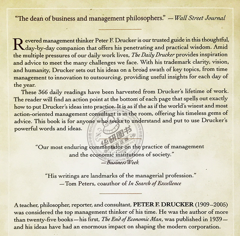 “Drucker... is the original management guru. Many still consider him the best...The short, snappy format will be appreciated by today’s time-challenged business readers: one page with an idea for every day of the year... Overall, it is accomplished admirably.” —USA Today