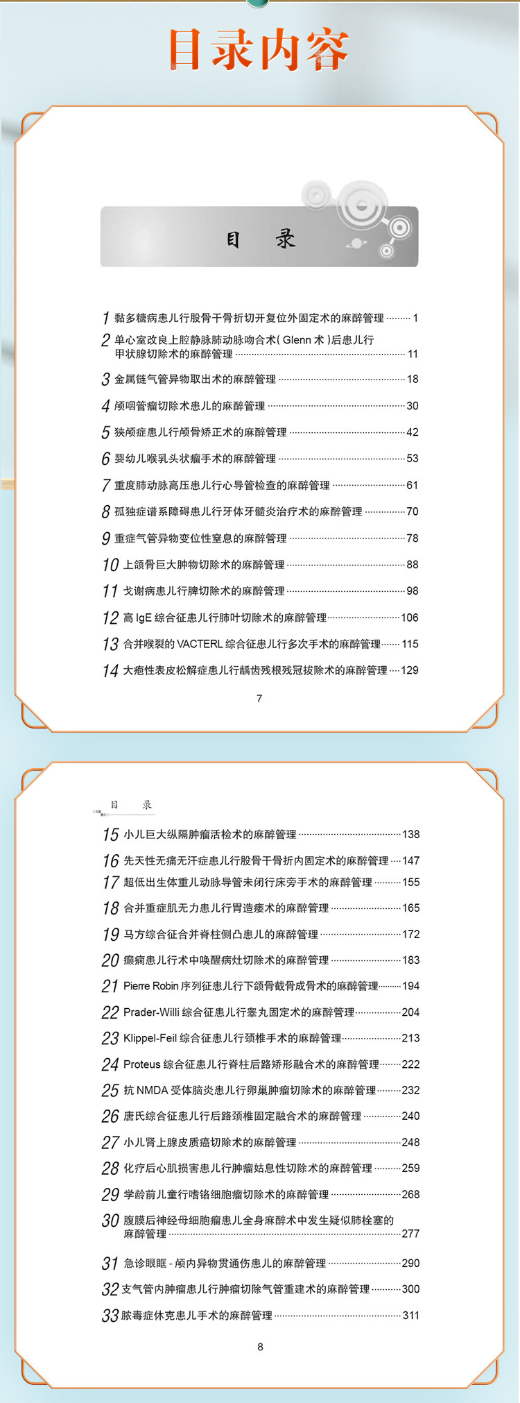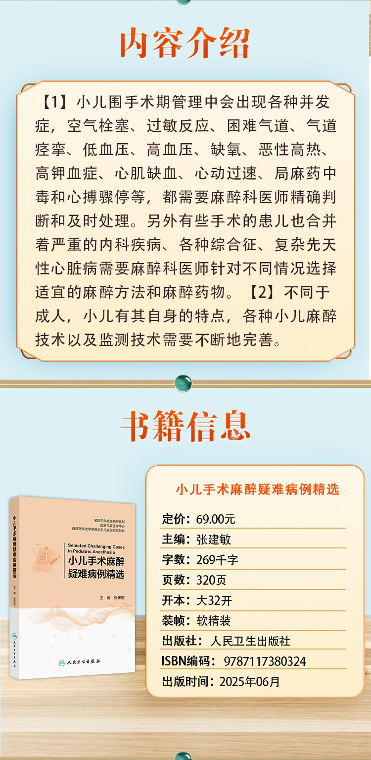 【1】小儿围手术期管理中会出现各种并发症,空气栓塞、过敏反应、困难气道、气道痉挛、低血压、高血压、缺氧、恶性高热、高钾血症、心肌缺血、心动过速、局麻药中毒和心搏骤停等,都需要麻醉科医师精确判断和及时处理。另外有些手术的患儿也合并着严重的内科疾病、各种综合征、复杂先天性心脏病需要麻醉科医师针对不同情况选择适宜的麻醉方法和麻醉药物。