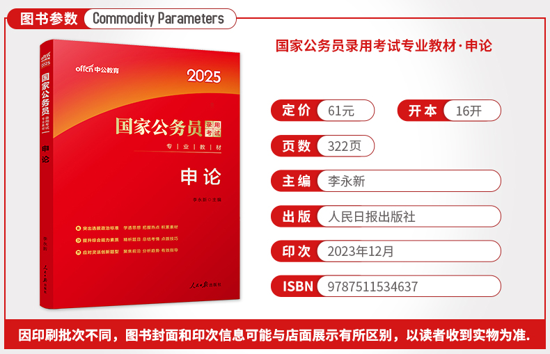《中公版2025国家公务员录用考试专业教材:申论》能满足考生的备考需要,是备考申论的一本好的辅导教材。本书内容科学、体系完备,有三大特色,助力您轻松备考:1.突出国考考情。本书突出生国考申论考情,让考生从整体上了解申论试卷的构成、考查的主题、题型等,助力考生认知国考,做到有针对性的备考。2.讲解实用方法。本书系统介绍;审清题意提炼要点加工要点的答题步骤与方法,再分别讲解五大题型,传授实用简便的解题方法。3.汇集政策热点。精编习近平新时代中国特色社会主义思想的重要知识内容,提升考生政治综合素养。同时,精选高频热点话题共8个,全方位帮助考生积累知识。