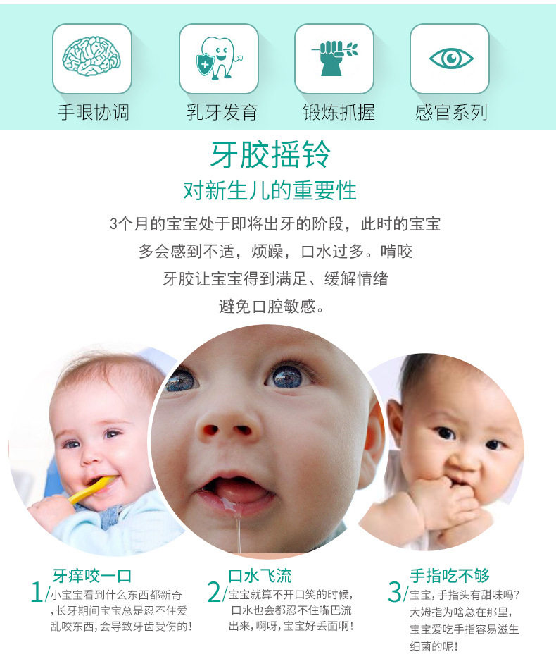 第二,肢体协调及活动机制:在把握玩的时候,锻炼宝宝的小肌肉的发展,刺激宝宝的抓握能力。