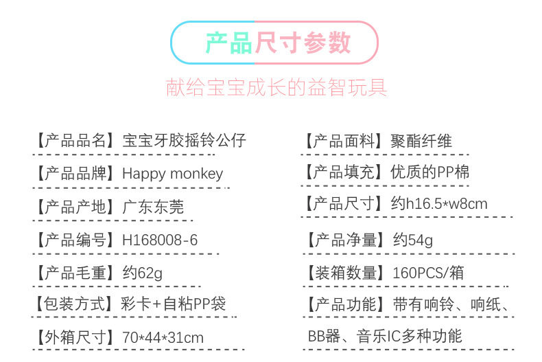 HAPPY MONKEY 品牌宝宝牙胶摇铃针对于婴幼儿的成长给予全方面的促进与提高.