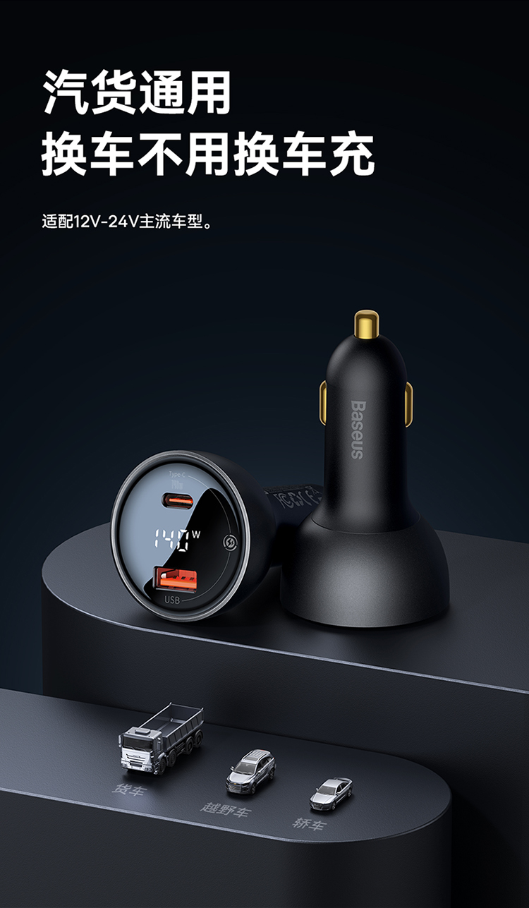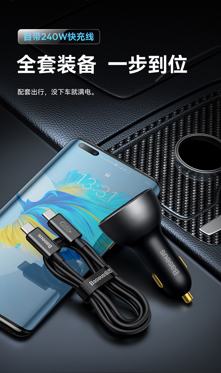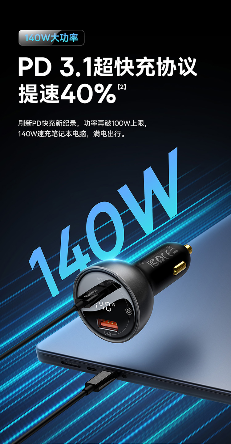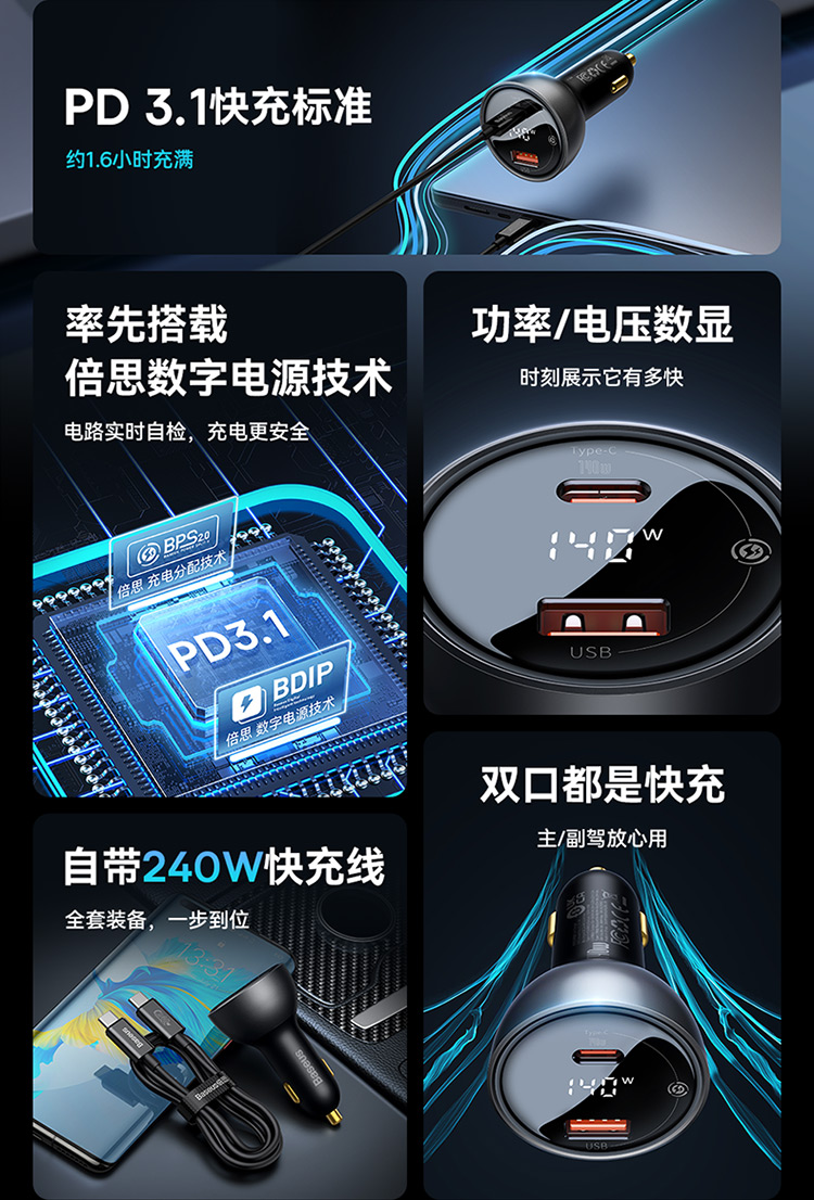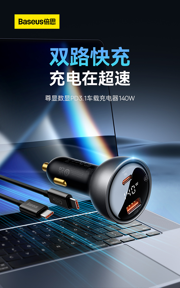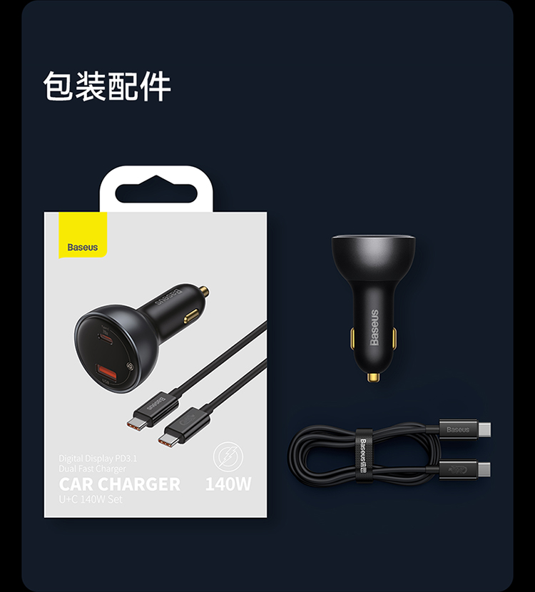倍思 尊显数显PD3.1双路快充车载充电器U+C 140W 套装