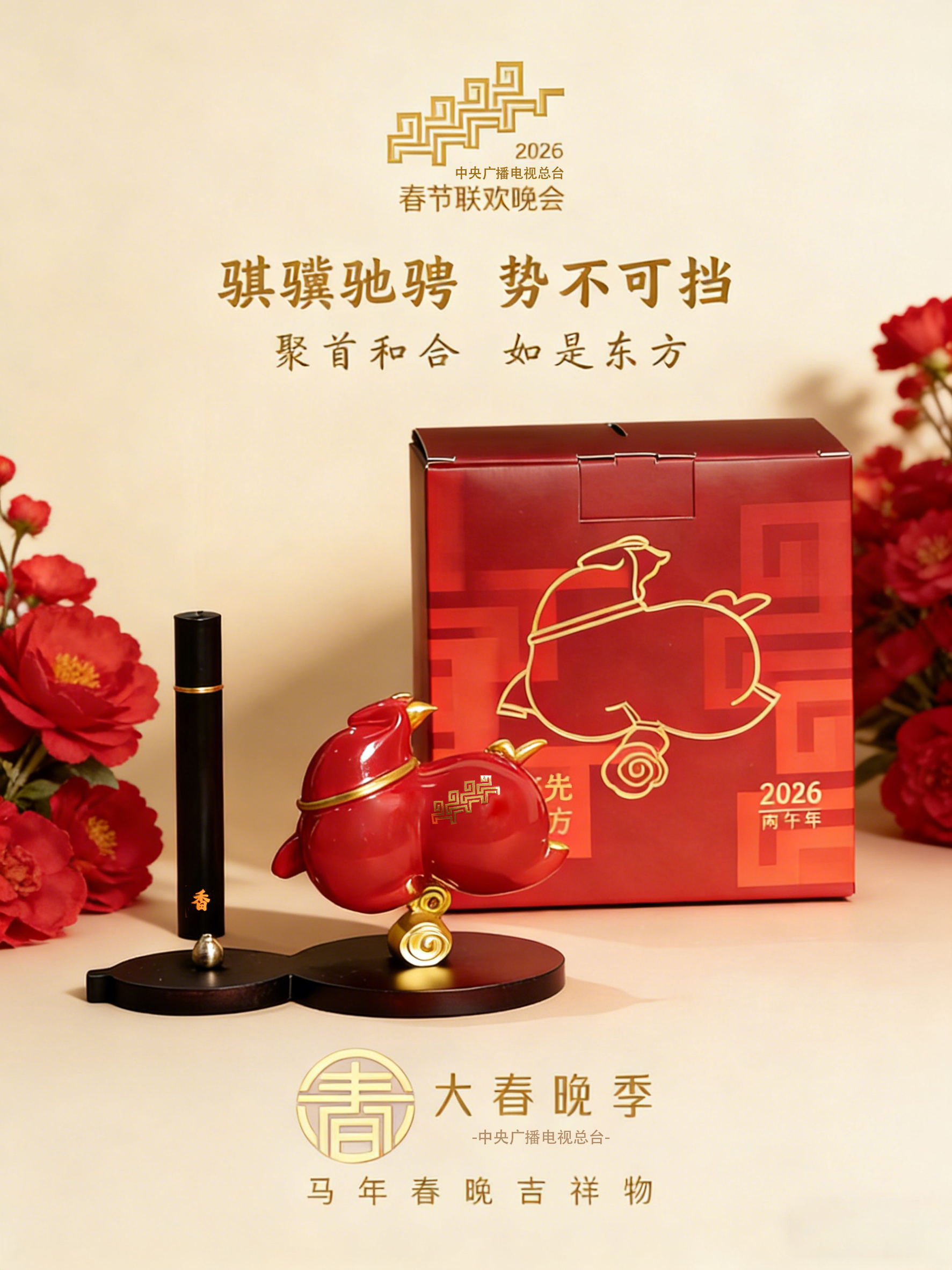 我们取其 “一马当先、马上来财” 的吉意核心🐎,呼应春晚 “骐骥驰骋” 传递的昂扬向前、福气临门,与东方红金的雅致美学融为一体