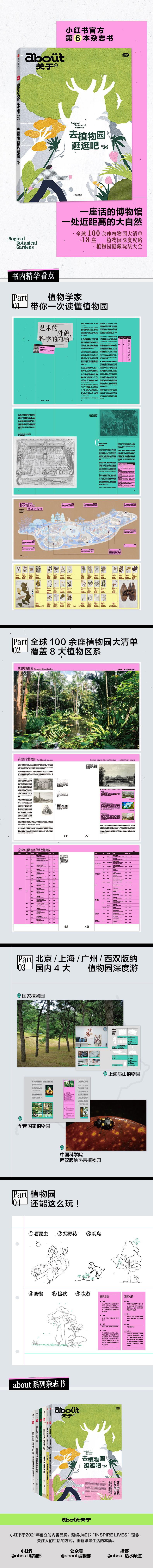 本书为“about关于”系列第六册,以植物园为主题,追溯了历史植物园的形态及功能变迁,介绍了世界各地著名的植物园,重点介绍了中国植物园的发展及有代表性的植物园,并介绍了如何将植物园作为一种亲近自然的生活方式。介绍了包括国家植物园、华南植物园、昆明植物园、香格里拉植物园等在内的“名园”。 本书对植物园这个话题的挖掘兼具深度和广度,可读性和科普性俱佳。