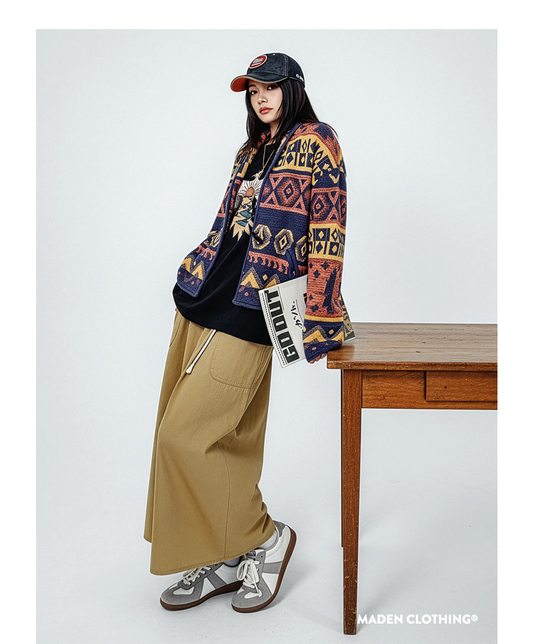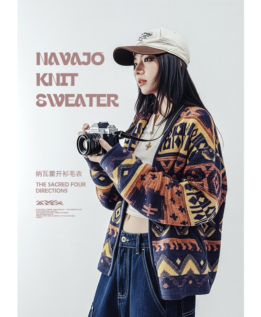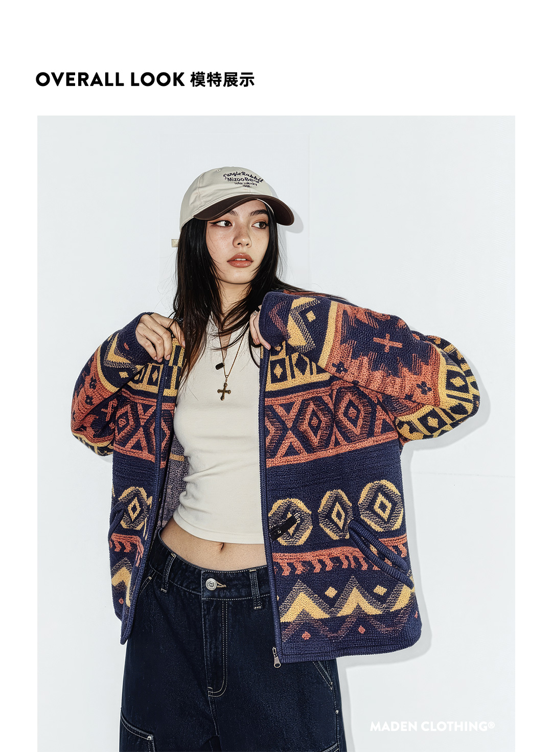 马登复古翻V领纳瓦霍牛角扣宽松提花针织开衫毛衣外套上衣女士秋