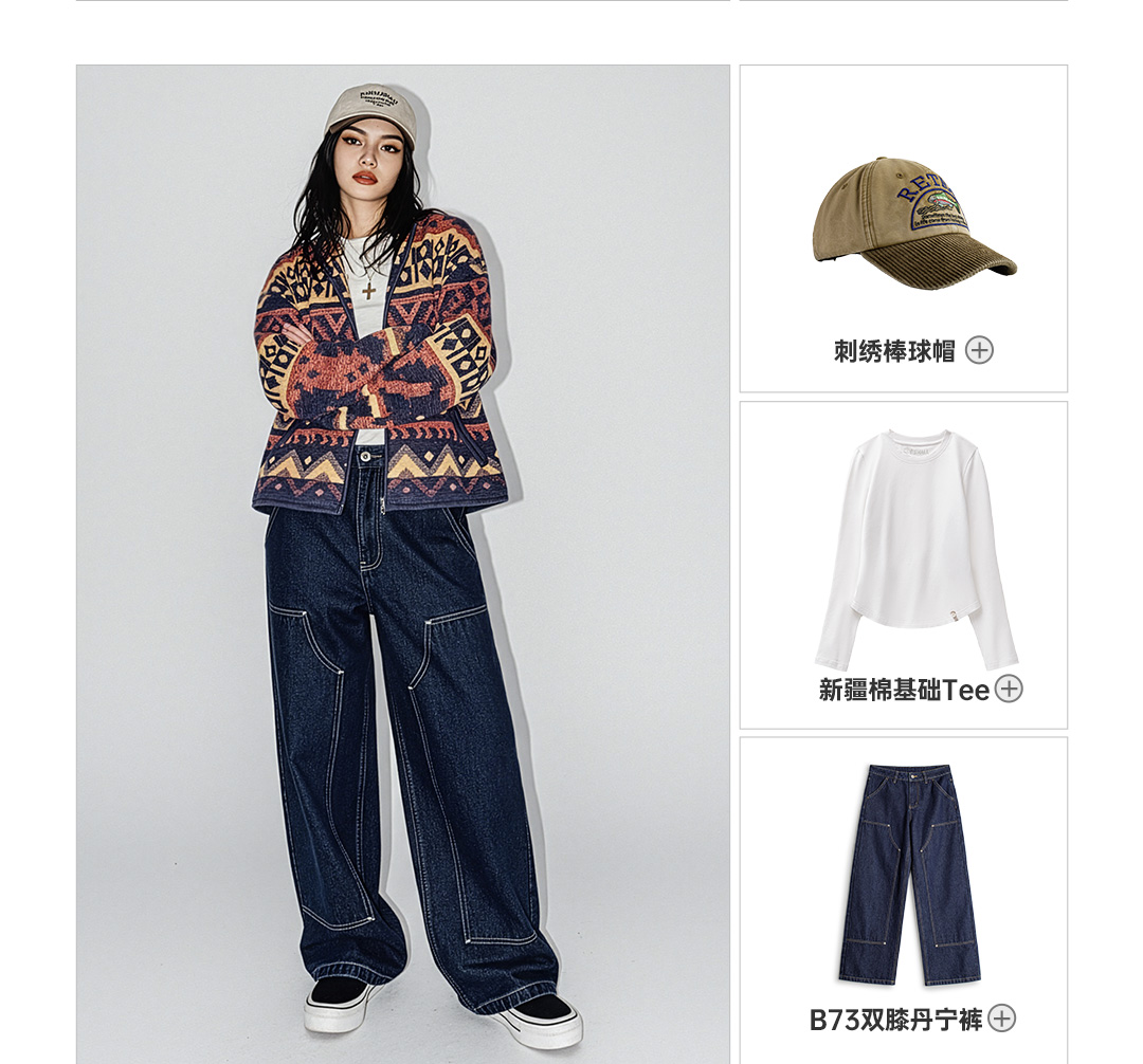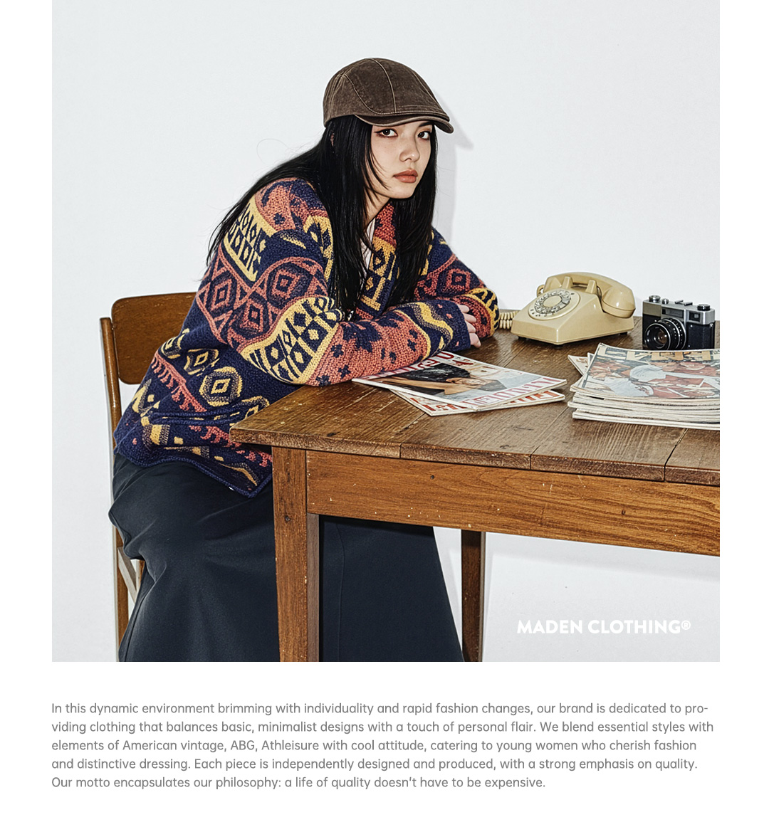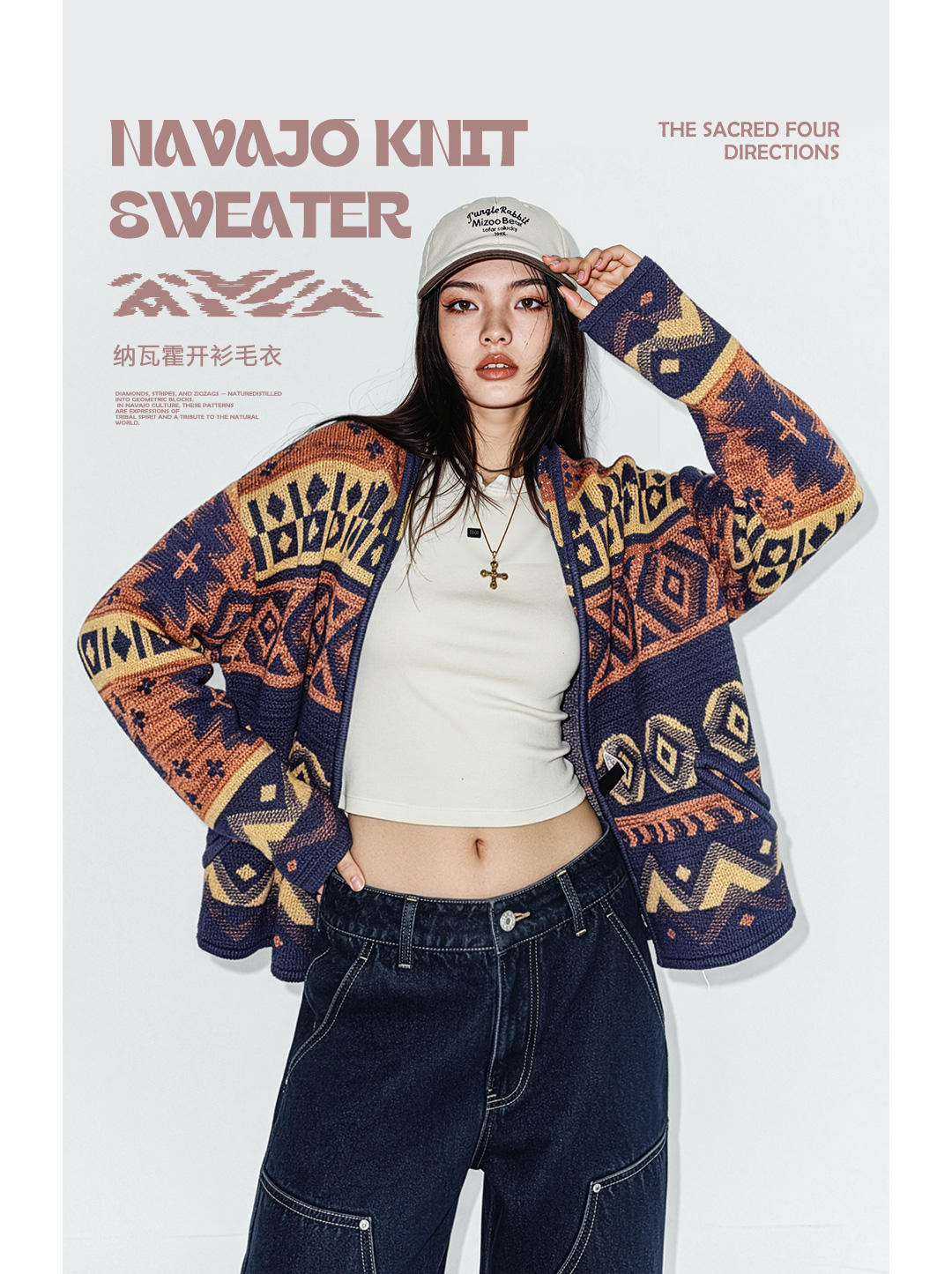 马登复古翻V领纳瓦霍牛角扣宽松提花针织开衫毛衣外套上衣女士秋