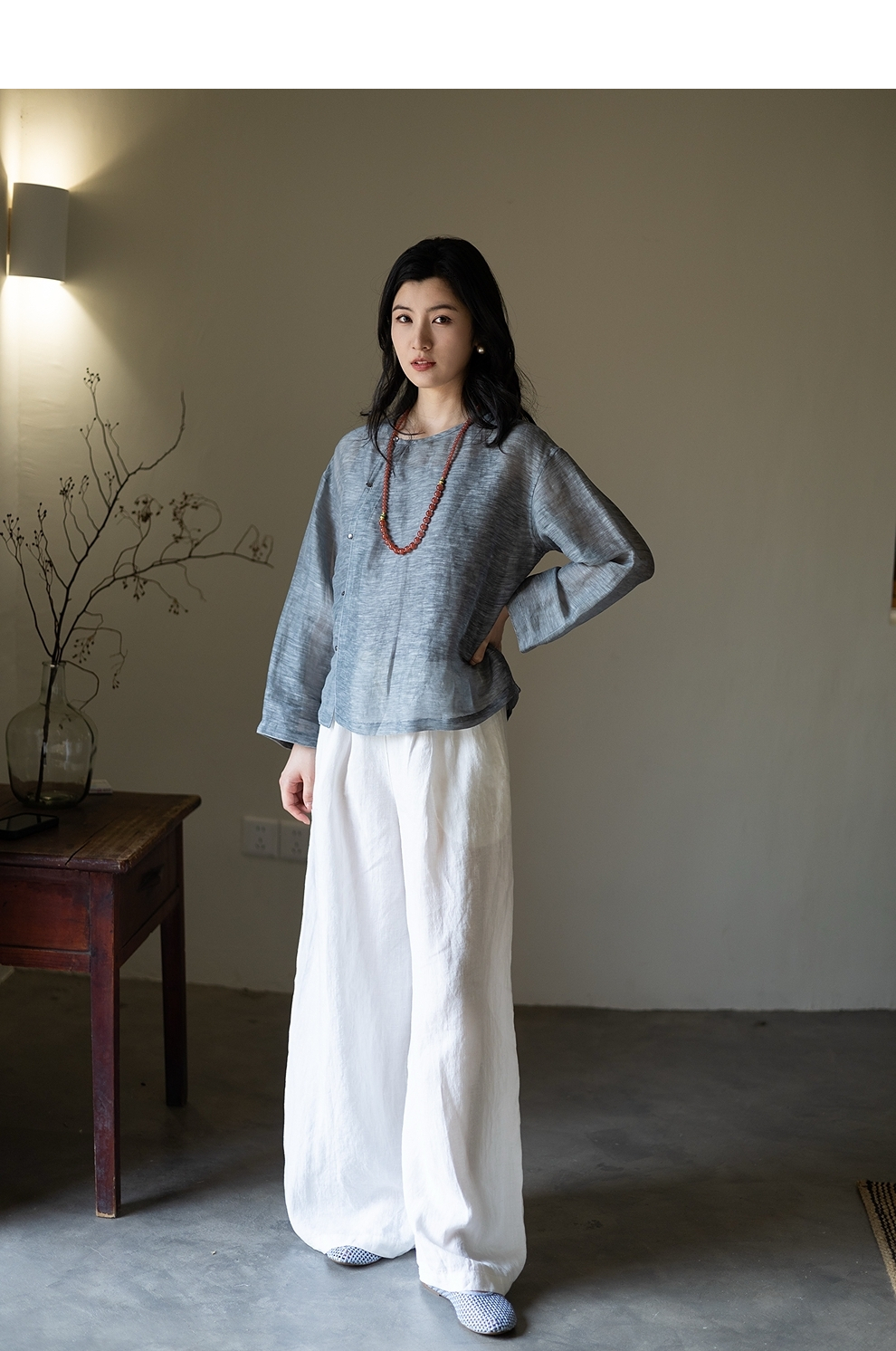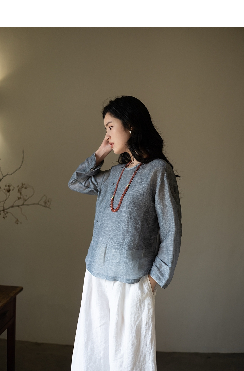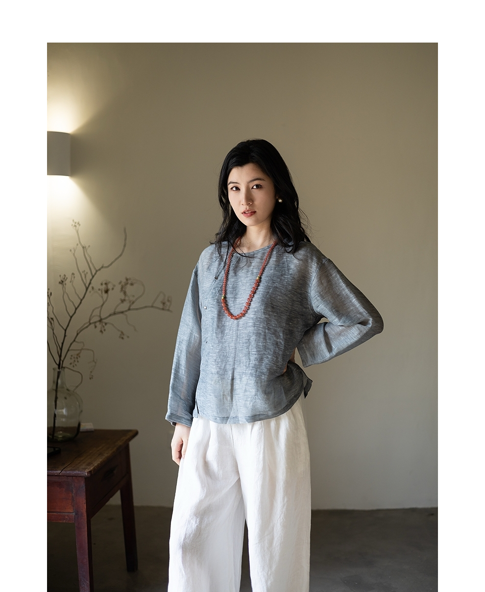 绽放旅行女装362朵/蚕丝亚麻中式斜襟圆领长袖小衫文艺气质衬衫女