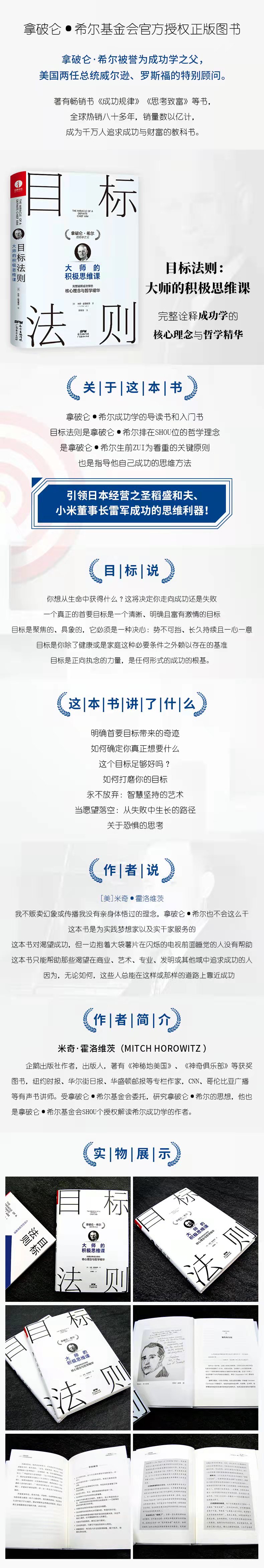 本书特别强调希尔的理念中与 21 世纪读者关联更强的那些部分,比如说失败后的重振,或是在必要时修改首要目标。每一章都包含了一个以上模块化的“行动步骤”——一些锻炼你的精神或情绪肌肉的额外练习,让你更全面地应用作者探索的那些理念。