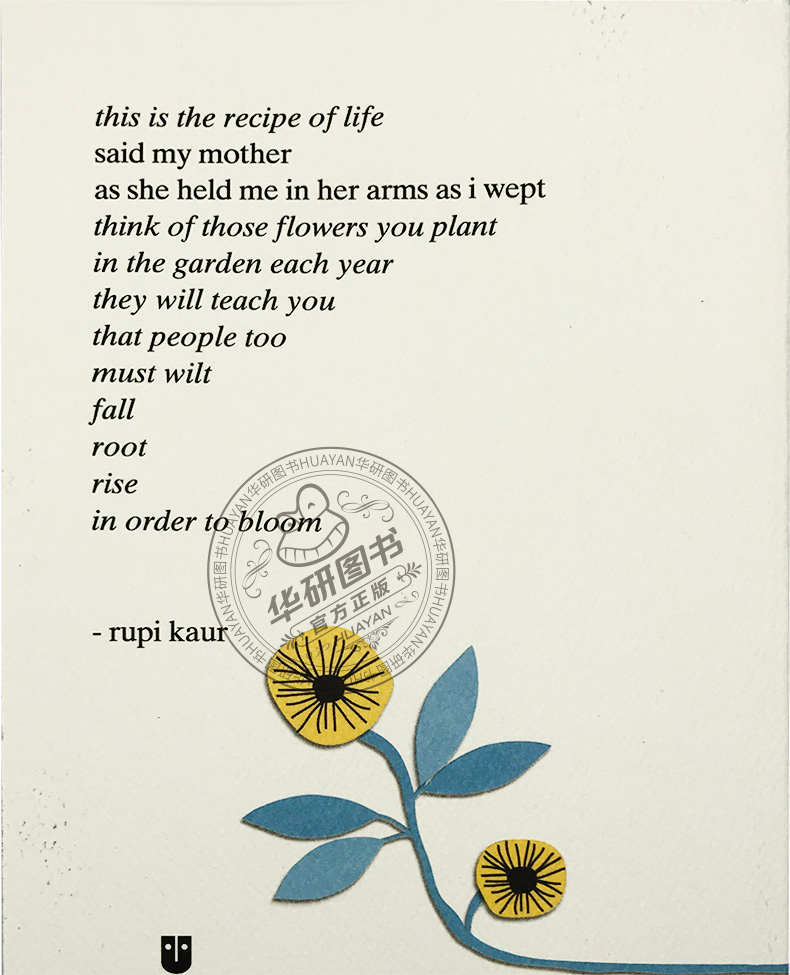 露比·考尔,印度裔加拿大人,作家,艺术家,现居住于多伦多。五岁时,她的母亲送给她一支画笔,鼓励她画出心中所想,从此考尔开始用绘画和诗歌记录自己经历的一切。她的作品主要让很多创伤中的人获得治愈,并有勇气再度出发,考尔的作品被多家知名美术馆收藏,并被杂志广泛刊载。