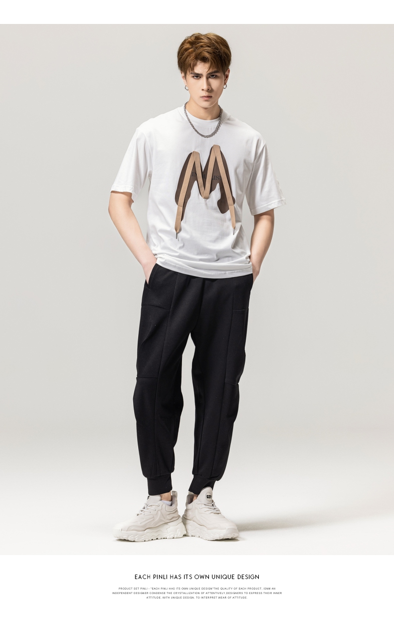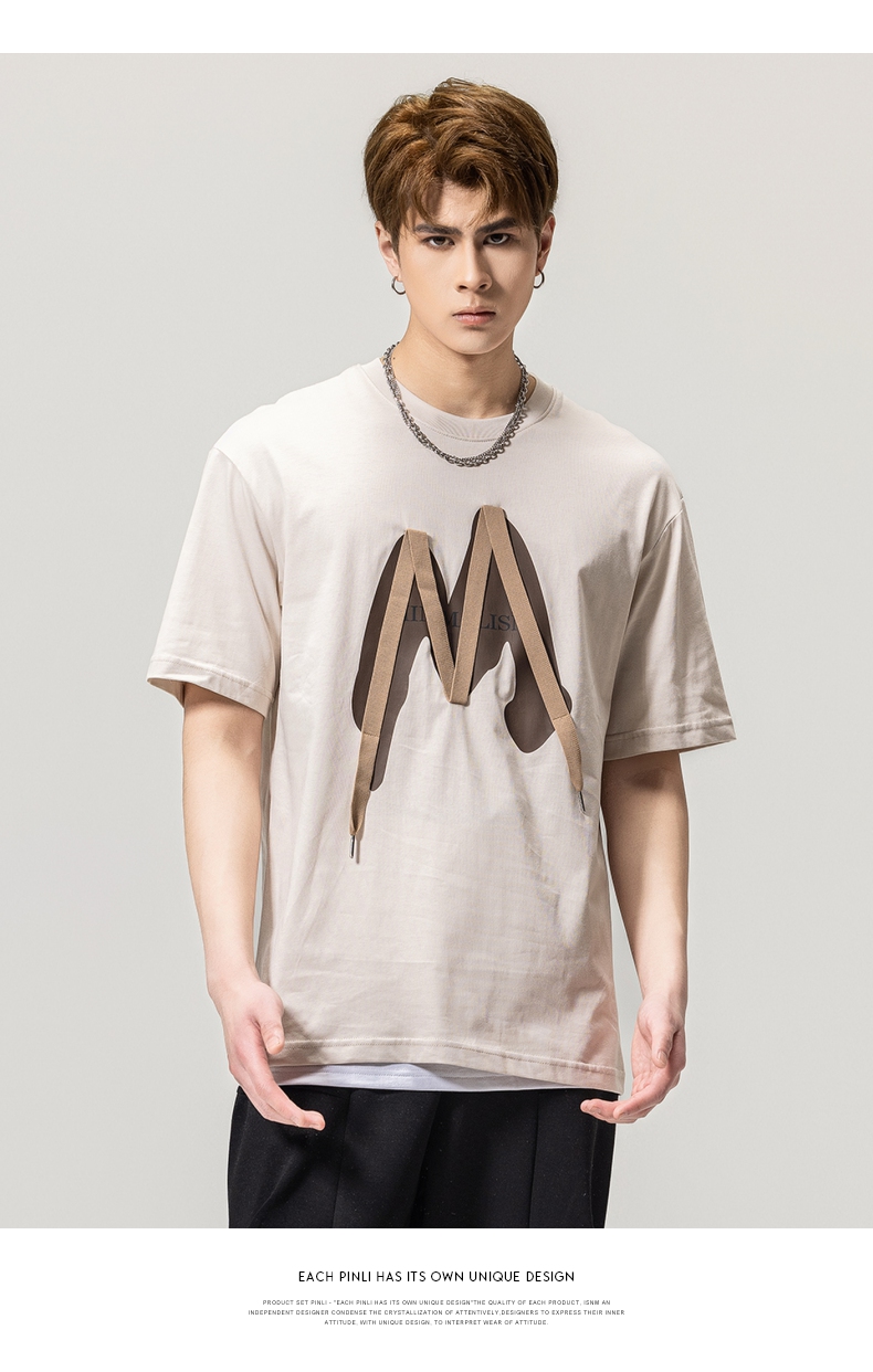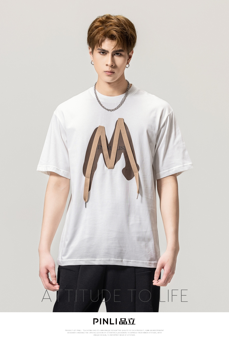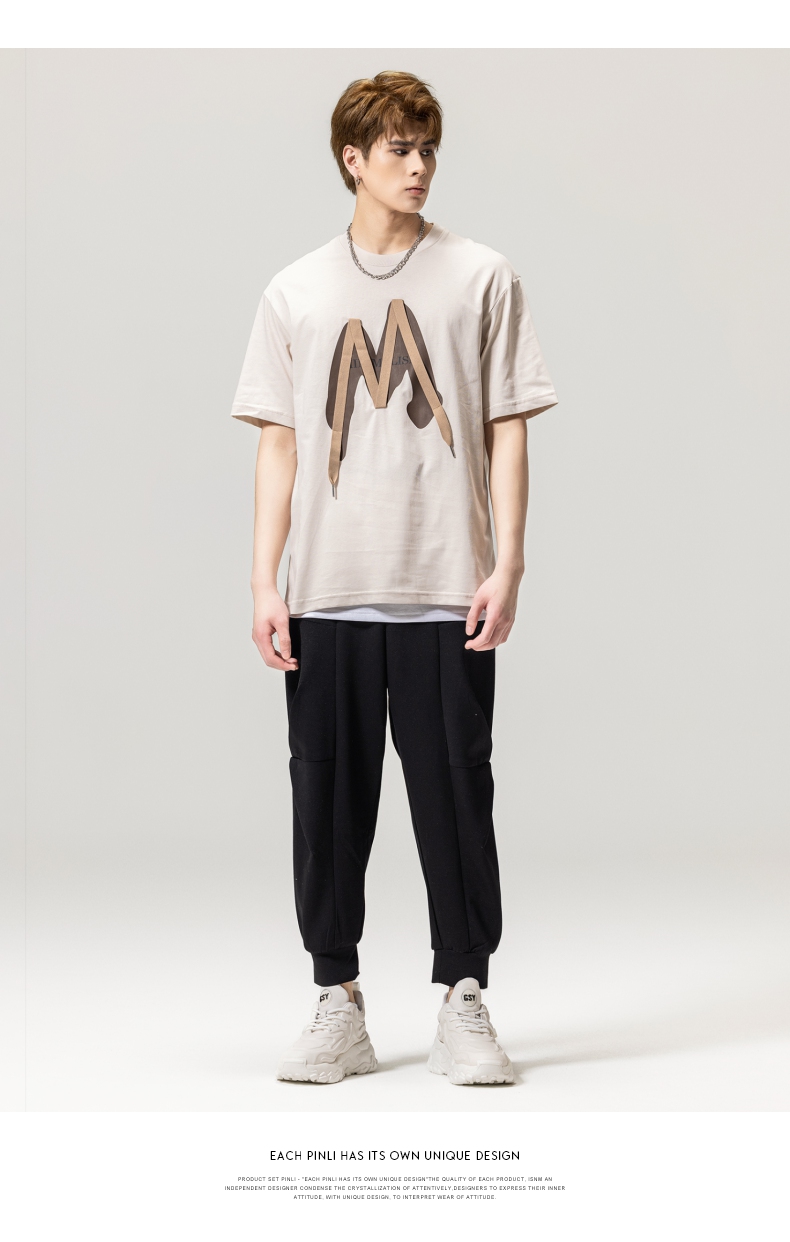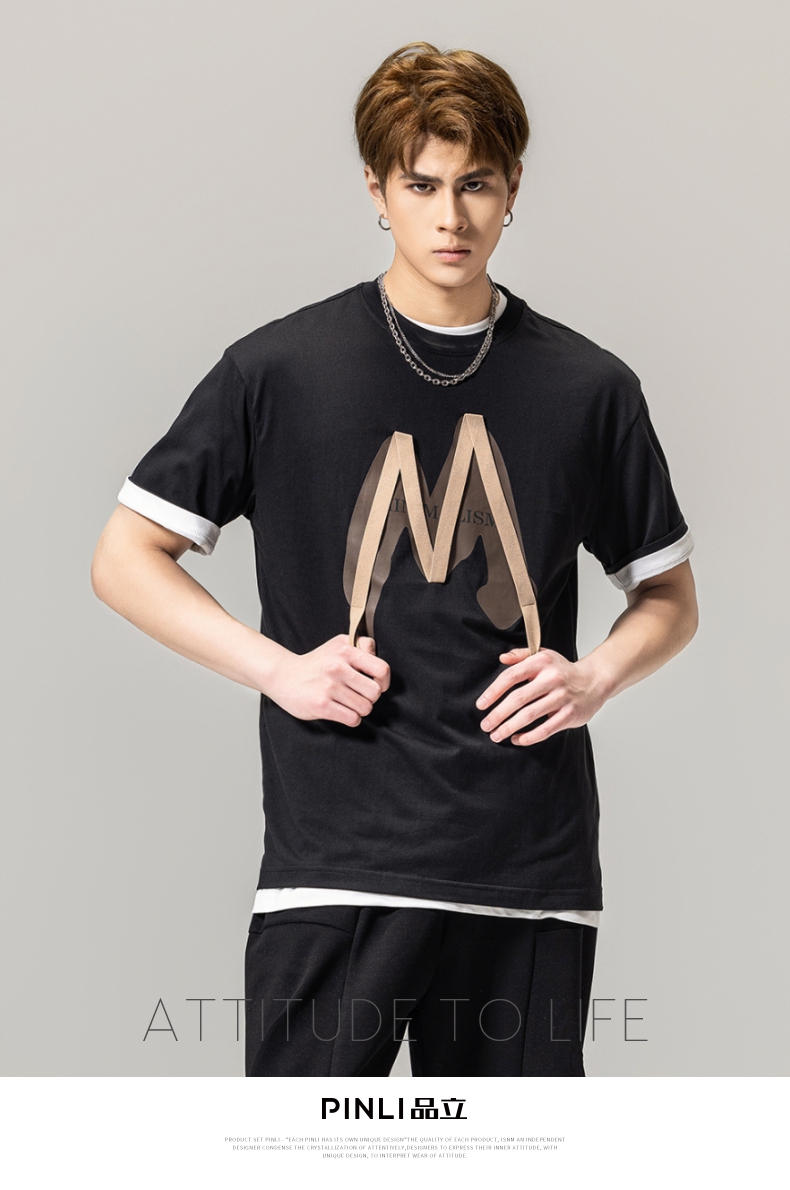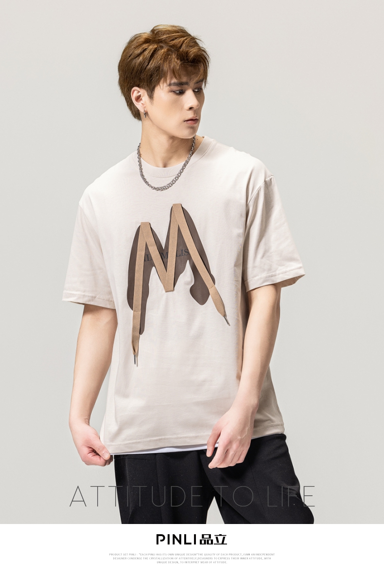 PINLI品立春季新款贴布印花T恤男士圆领短袖体恤BG231111042