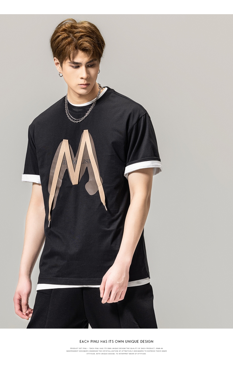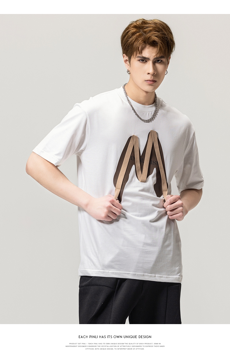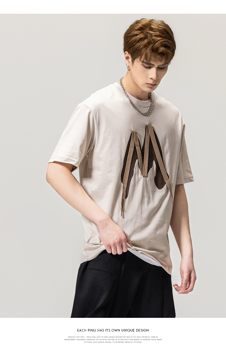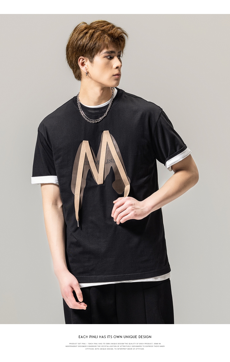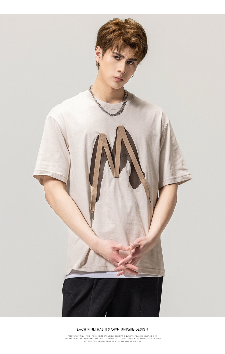 PINLI品立春季新款贴布印花T恤男士圆领短袖体恤BG231111042