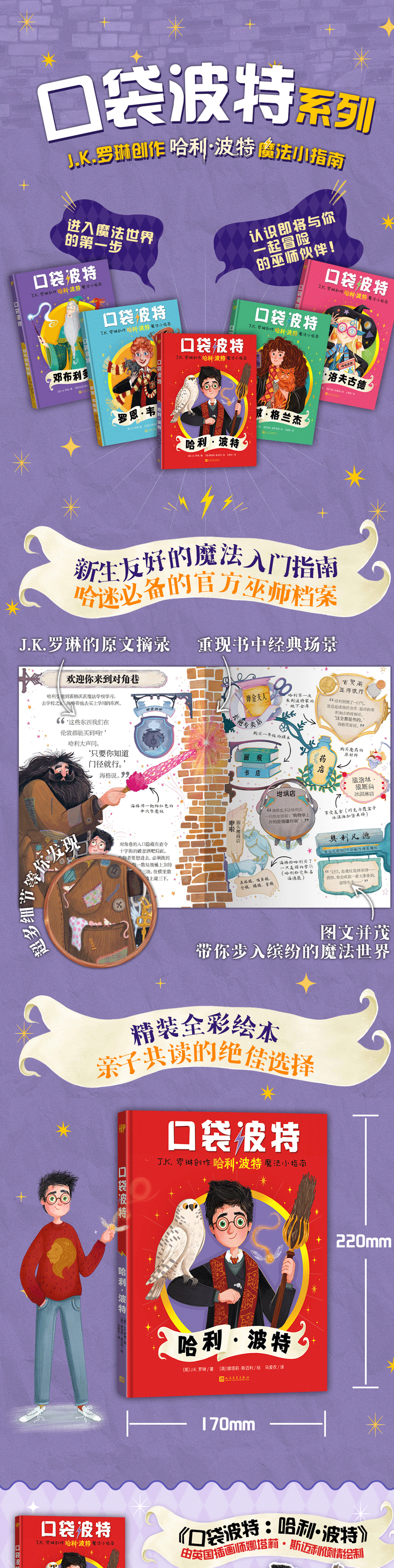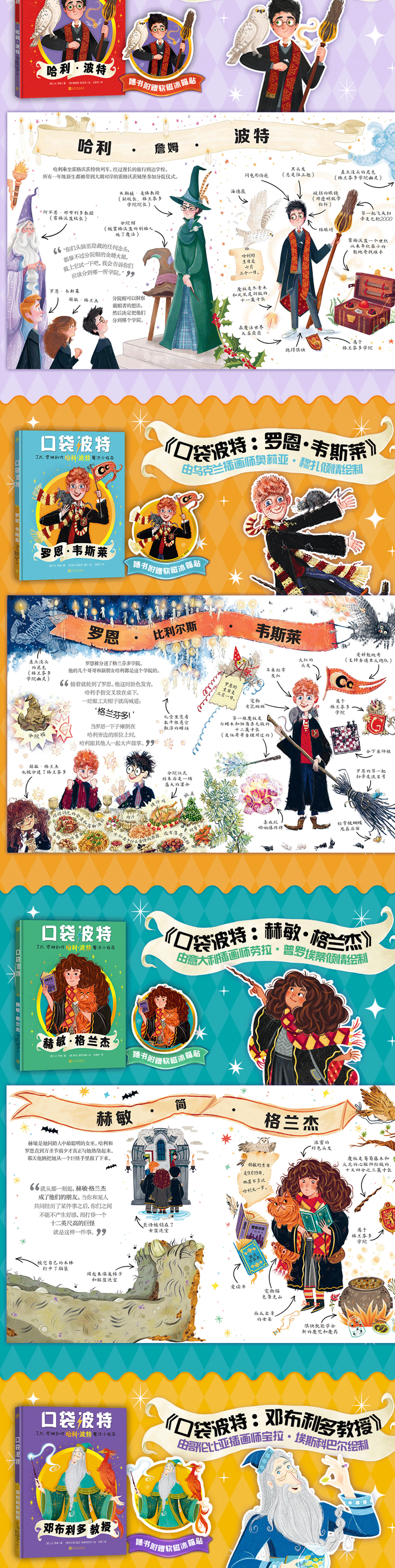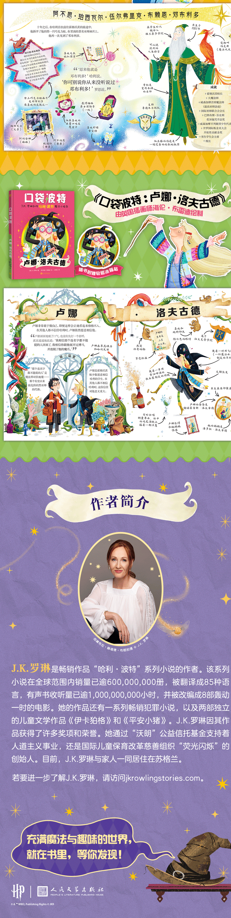 ;口袋波特系列是一套由英国女作家J.K.罗琳创作的;哈利波特魔法小指南。J.K.罗琳笔下的;哈利波特故事风靡全球,一个重要原因就是塑造了众多令人难忘的角色和神奇生物,形象鲜活独特,让读者深深着迷。此次推出的;口袋波特系列的两本介绍了深受读者喜爱的邓布利多和卢娜,每一本都由来自不同国家的插画师精彩绘制,每一页都闪耀着魔法世界的神奇光彩。无论你是初次入门的新生,还是想要重温童年魔法的毕业生,这套小书都能让你随时随地开启魔法冒险!