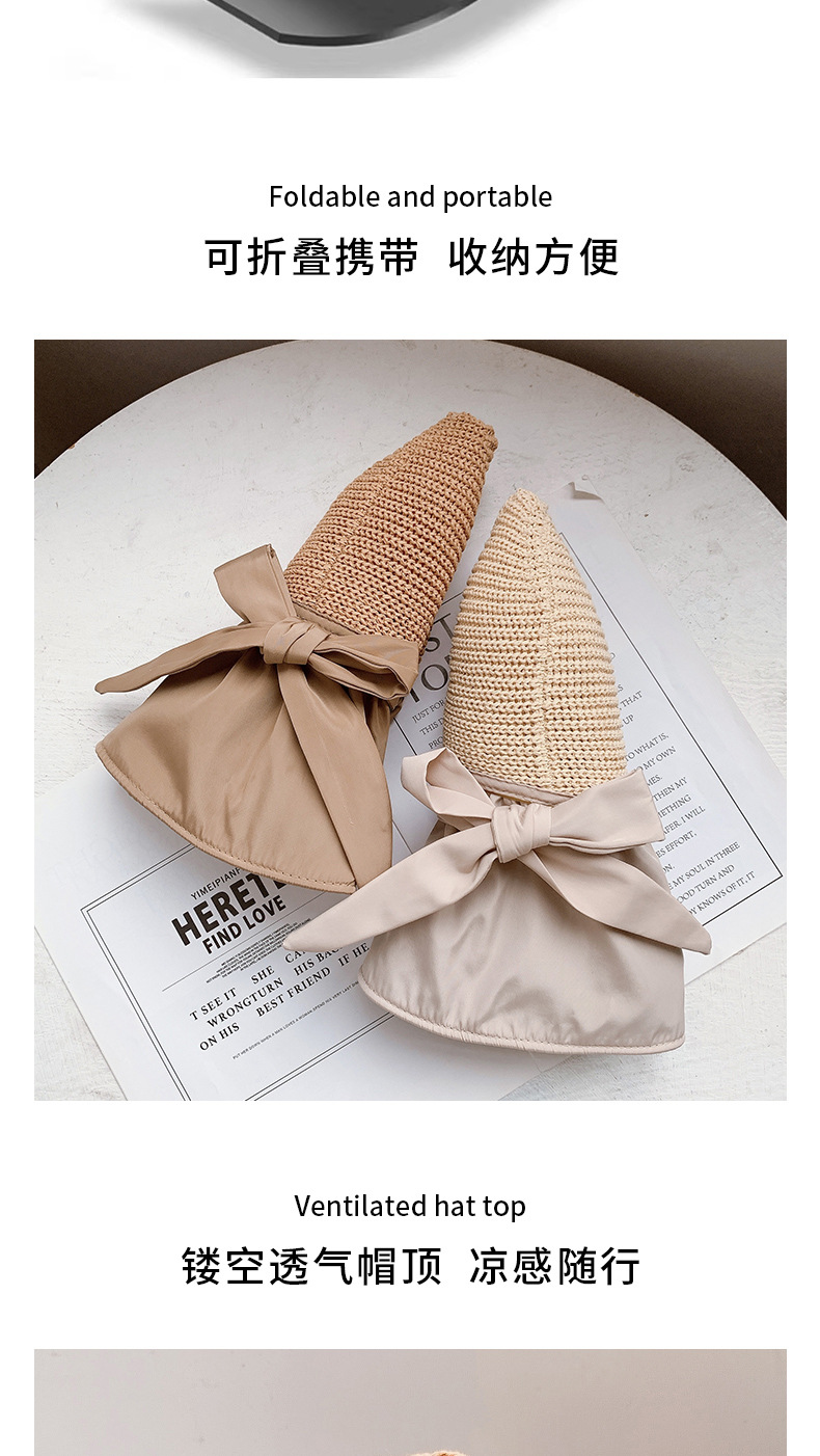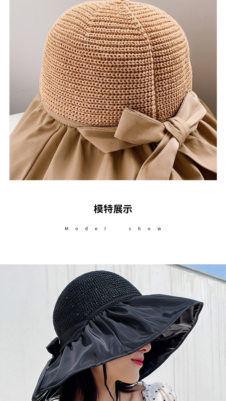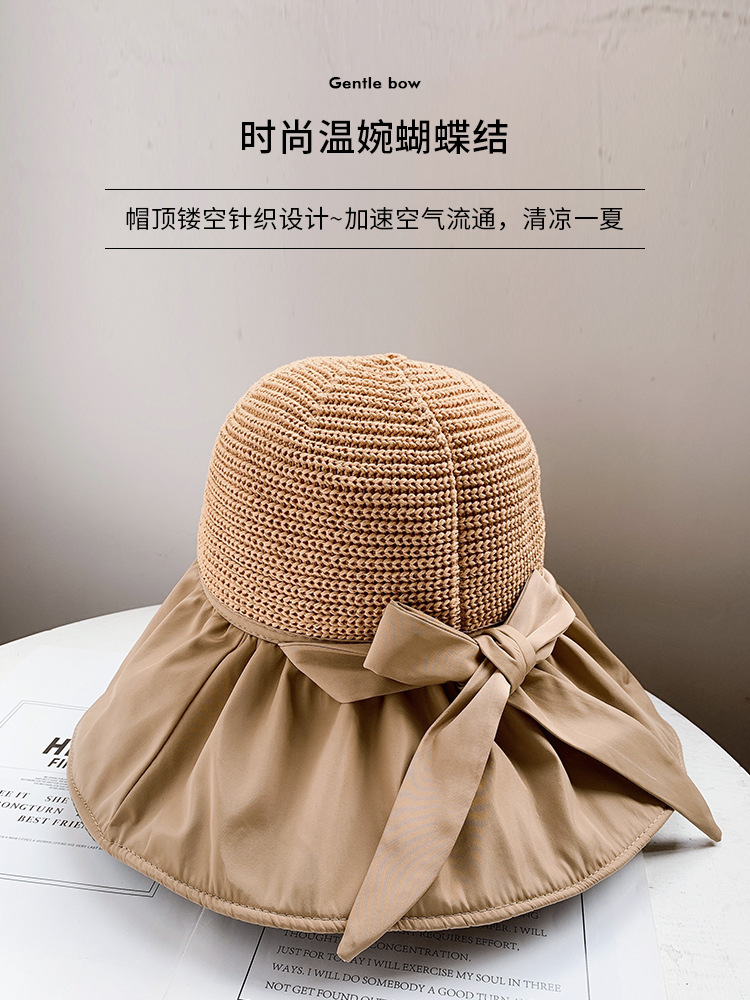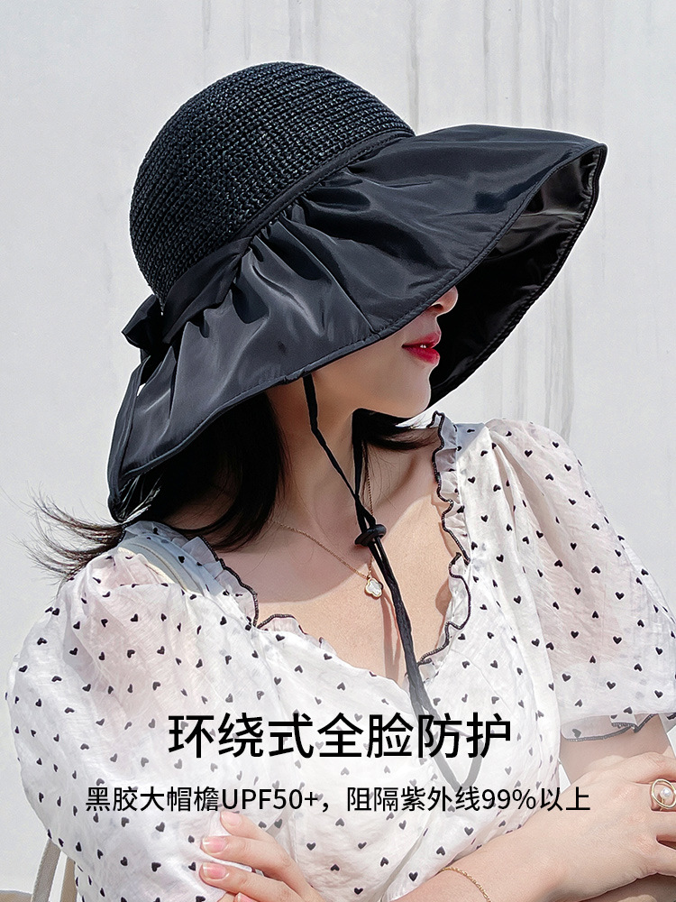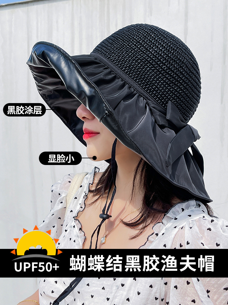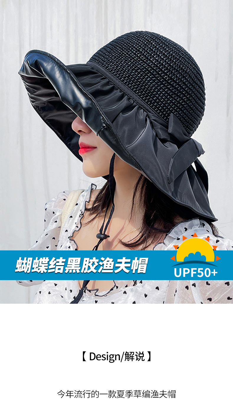 【百搭利器!双倍防晒显脸小】黑胶蝴蝶结遮阳帽女夏季镂空草帽紫外线大檐遮脸防晒太阳渔夫 帽子