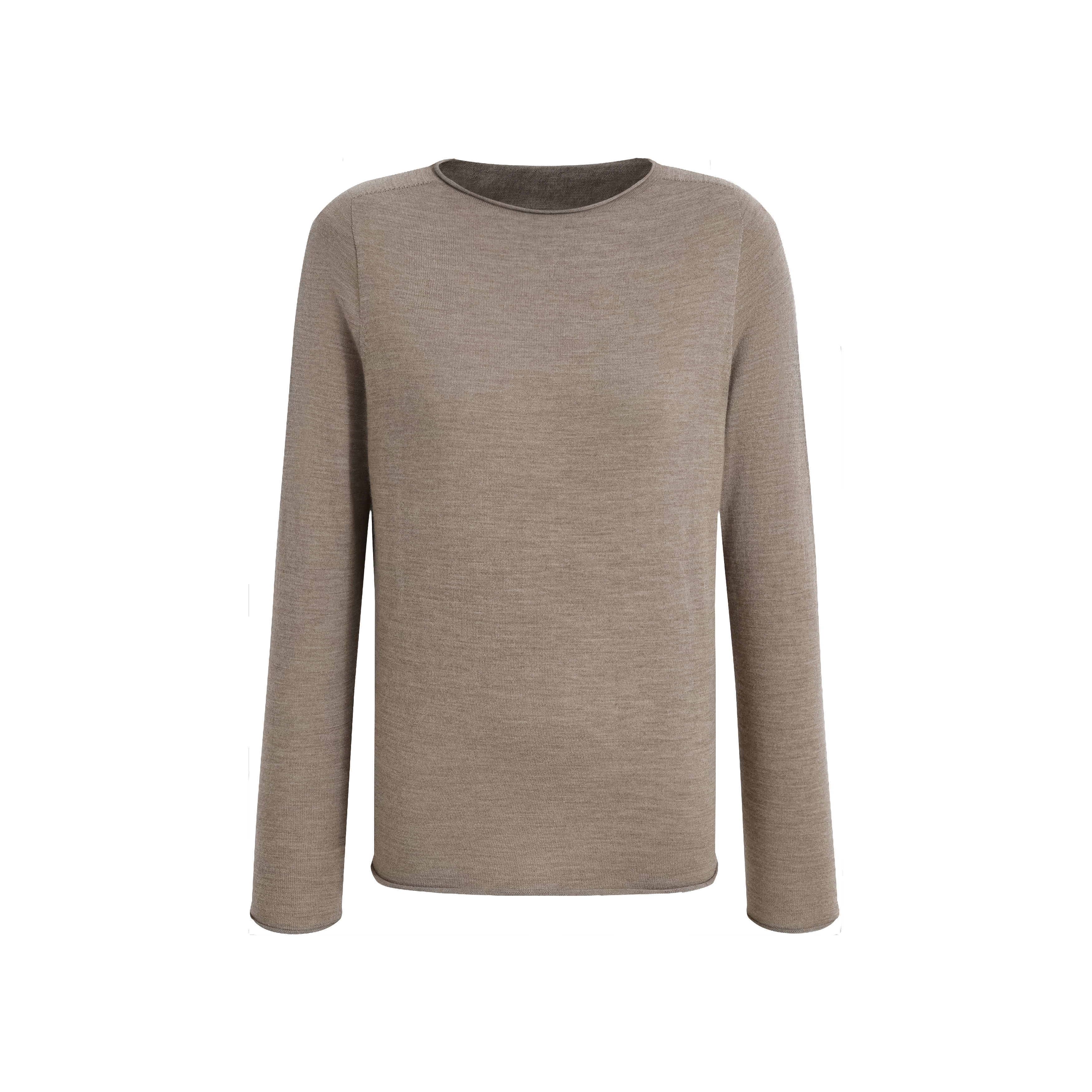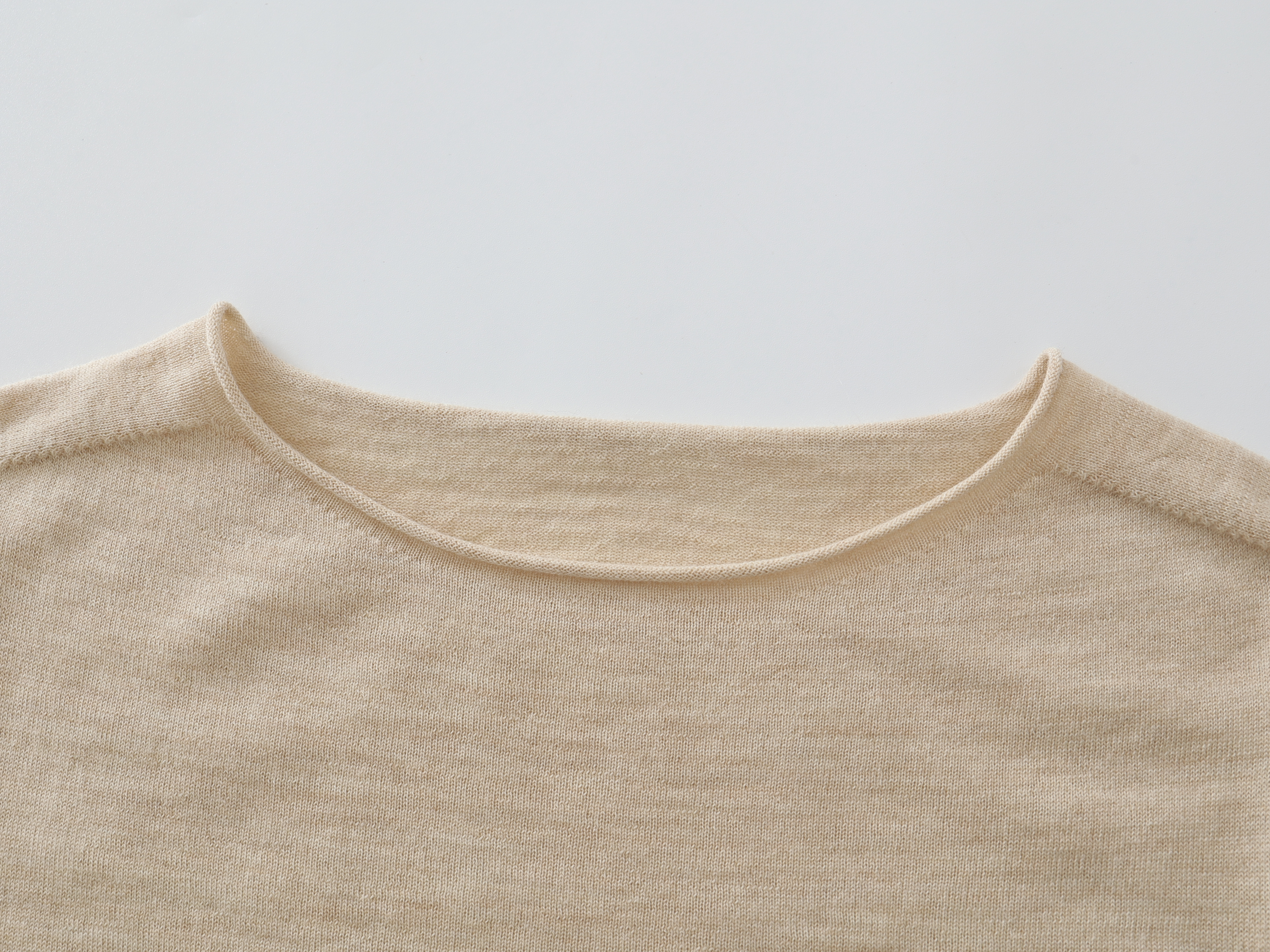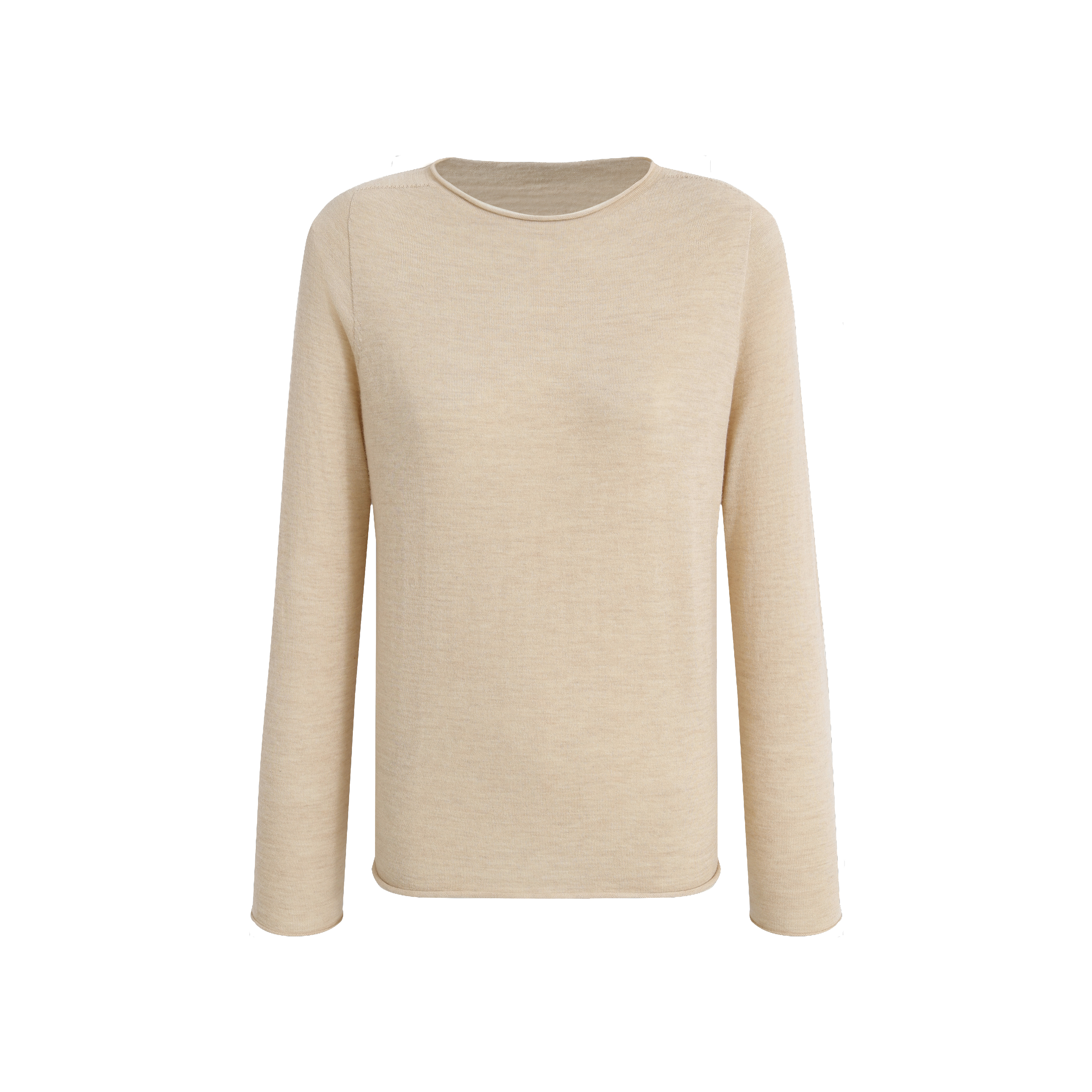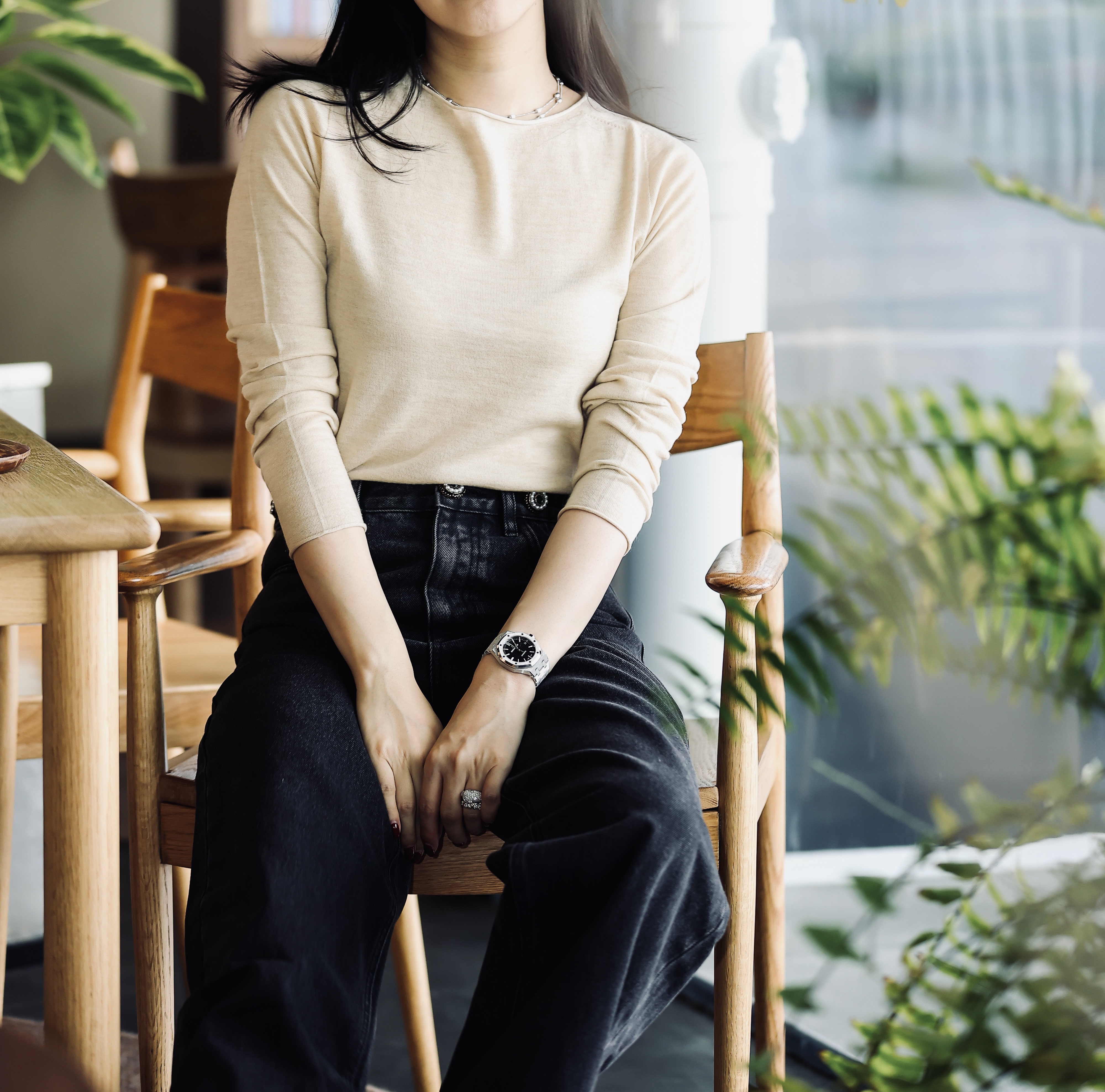 这款长袖船领针织衫采用羊毛结合羊绒纱线