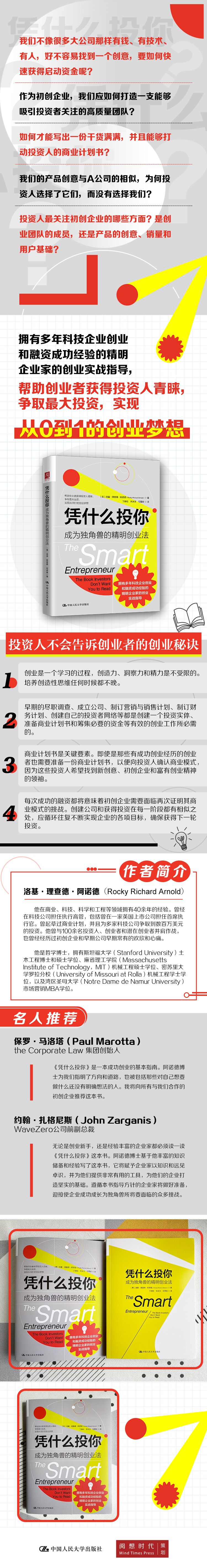 本书作者罗基·阿诺德立足于初创企业筹备、成立和早期运营的流程和可采取的具体行动,为有抱负的创业者们提供了一套系统性的方法,帮助他们避免初创企业可能会遇到的众多陷阱,解决创业初期可能遇到的、可能会导致他们遭受挫折的管理问题,为公司奠定坚实的基础。创业者若能遵循本书的建议,将能做好更充足的准备,*大限度提高初创企业的初始价值,游刃有余地同潜在投资人打交道和进行谈判,并在成功获得所需资金的同时尽可能多地争取到股权,逐步成长为独角兽。