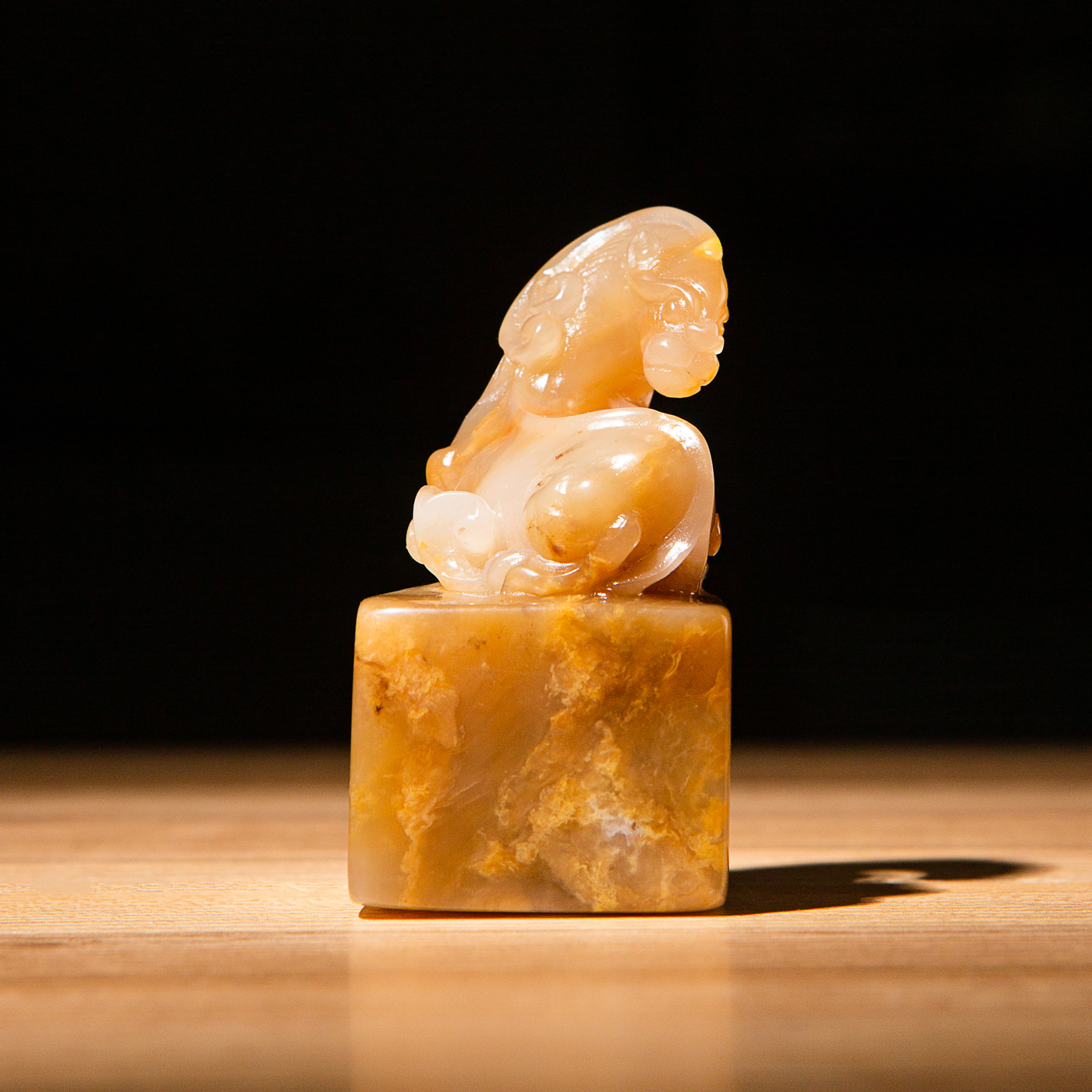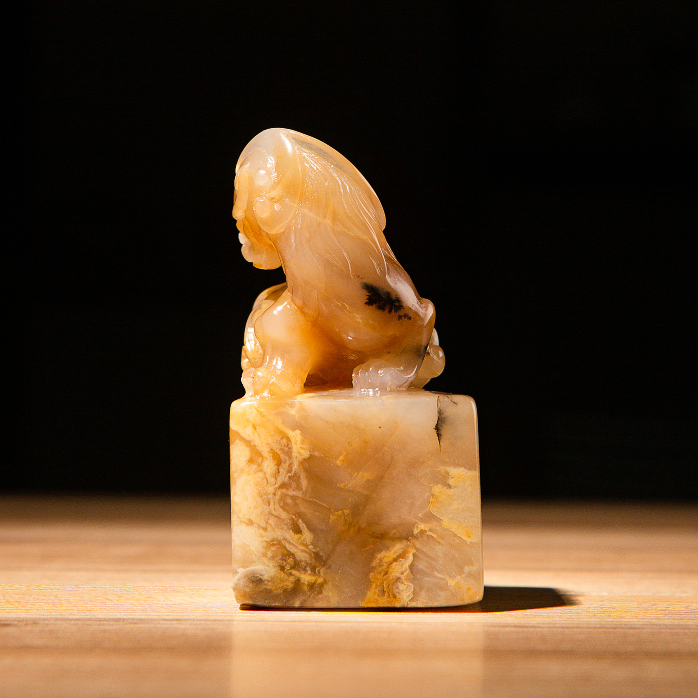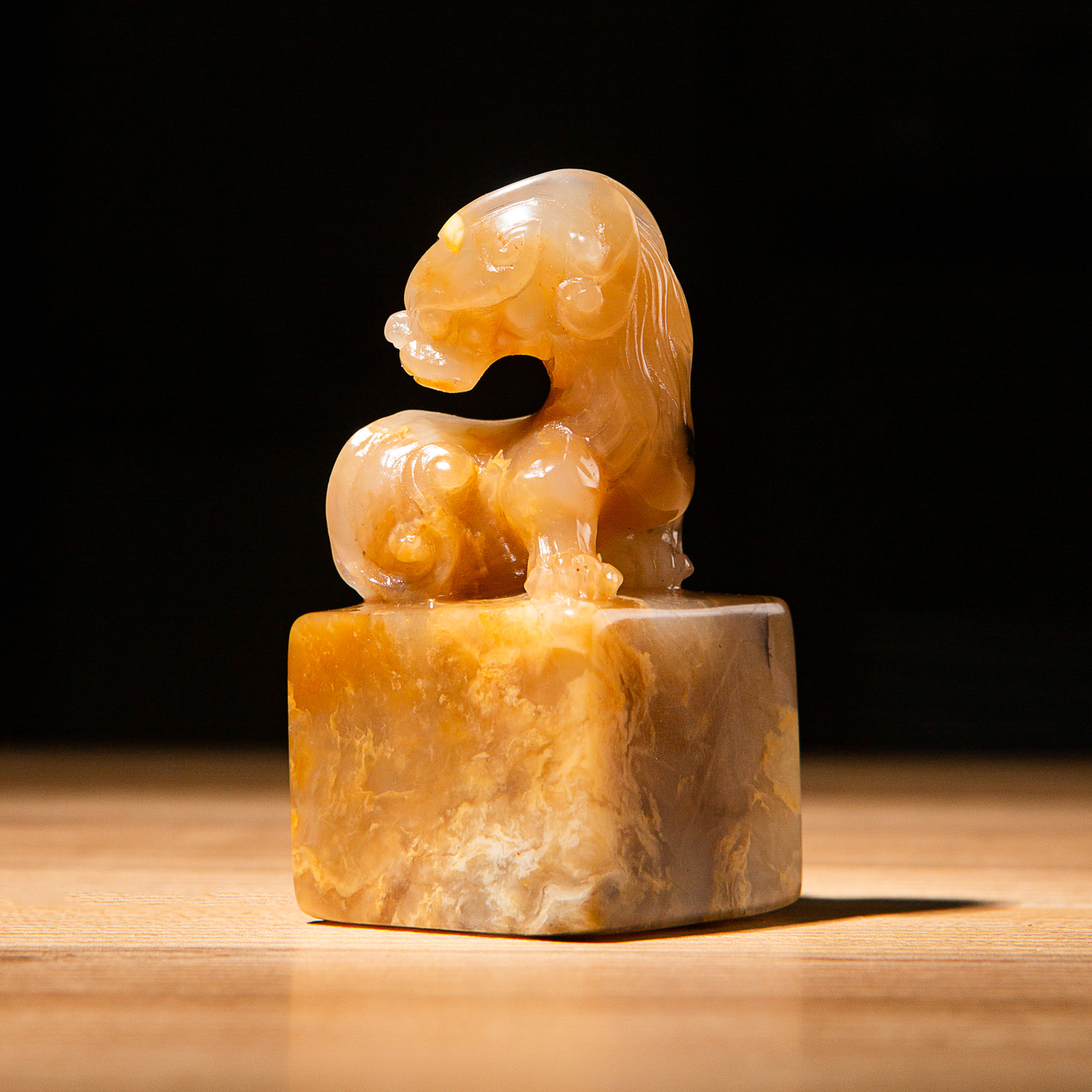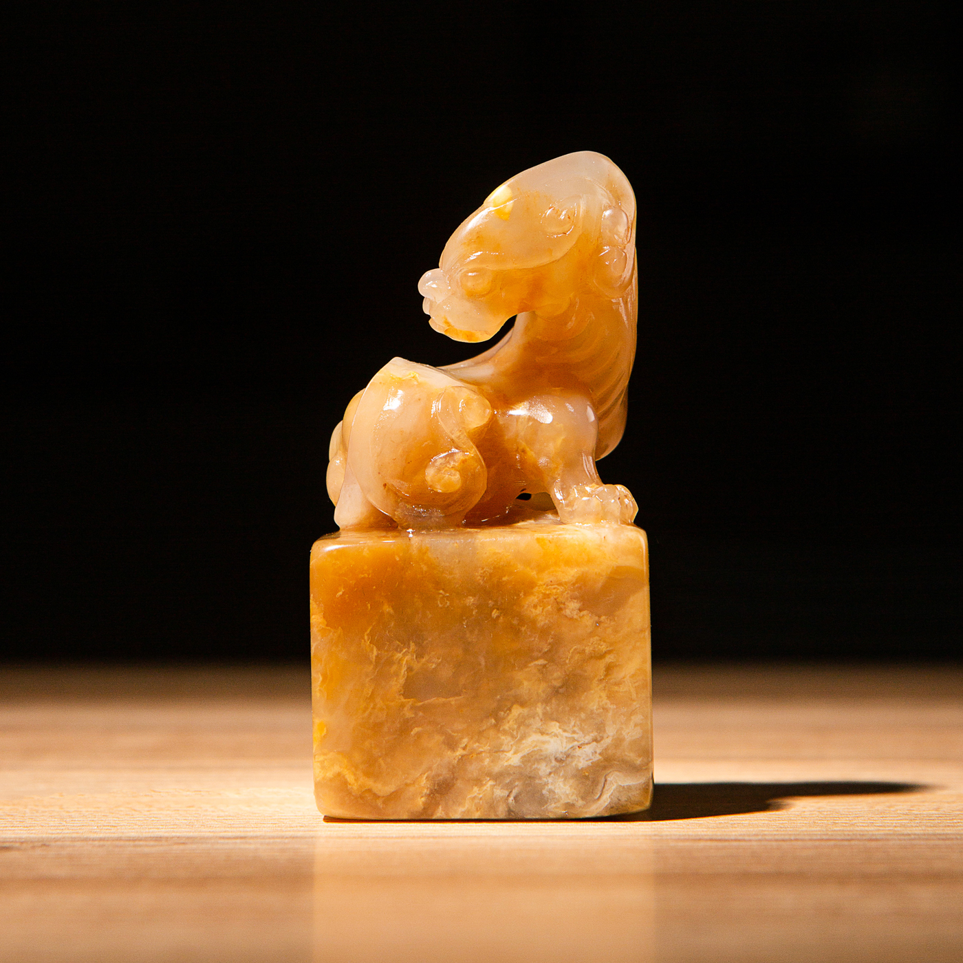 巴林福黄老料雕“螭虎”方章,采用存放几十年的老料,纯手工精雕而成。其雕工精美,质地温润通透,石性稳定。