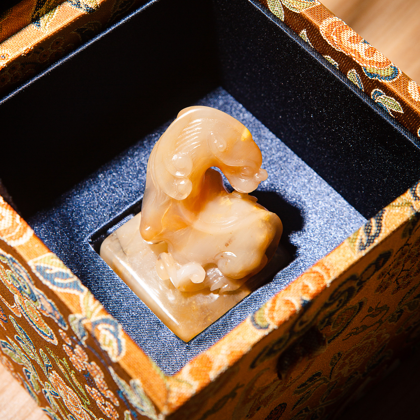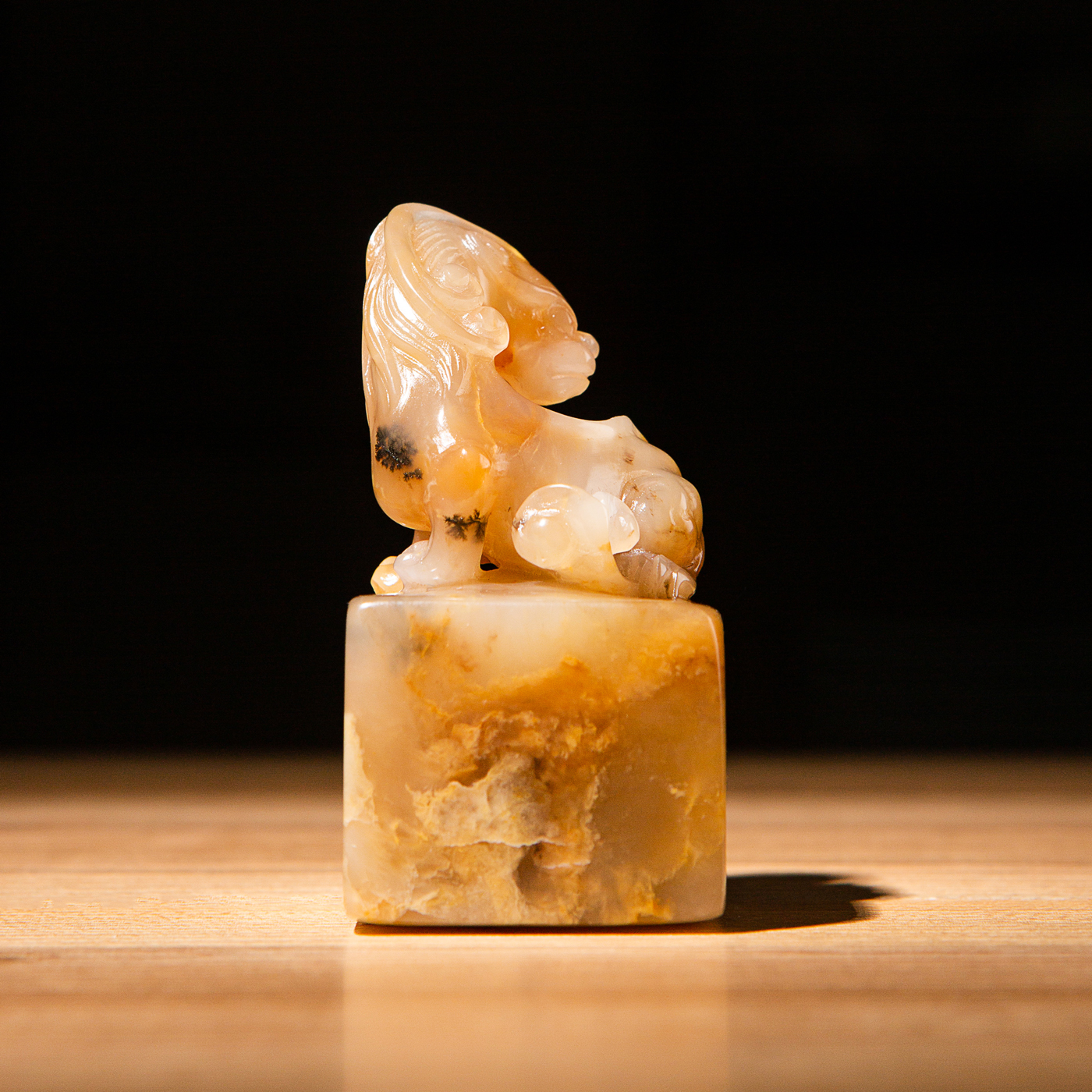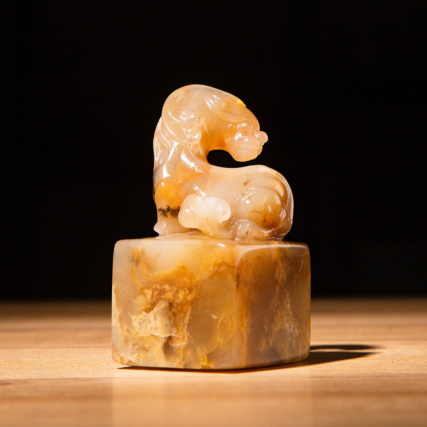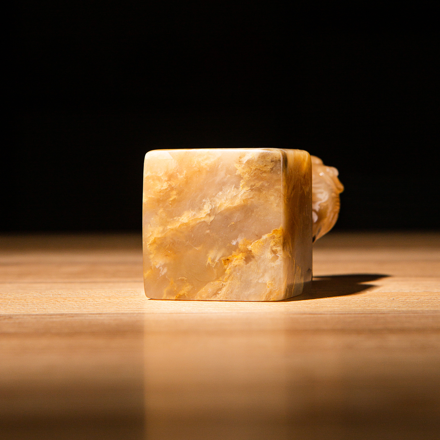巴林福黄老料雕“螭虎”方章,采用存放几十年的老料,纯手工精雕而成。其雕工精美,质地温润通透,石性稳定。