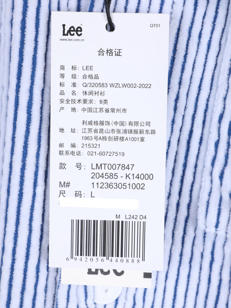 【云粉节】【新品】6楼 LEE 男式长袖衬衫 吊牌价999元