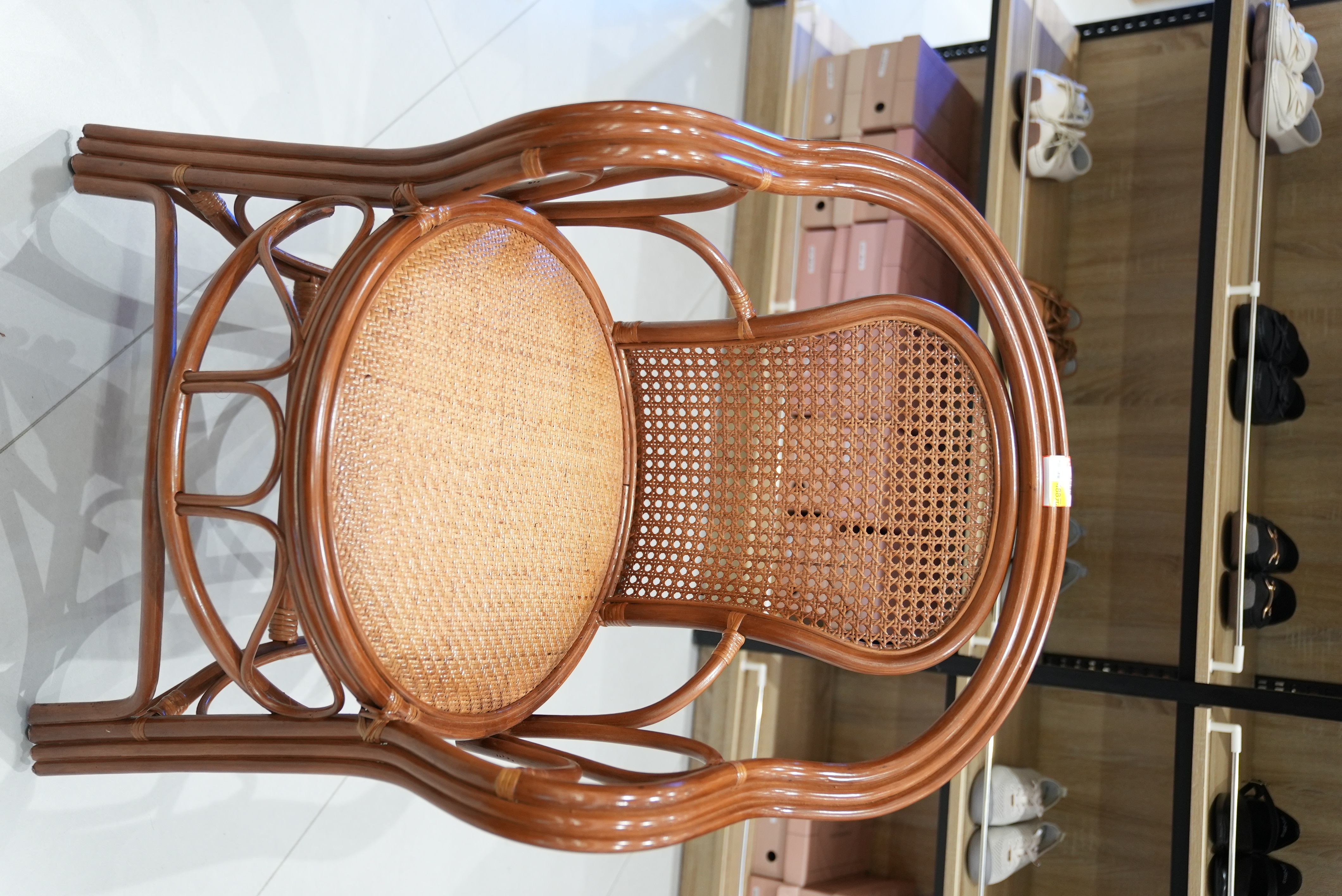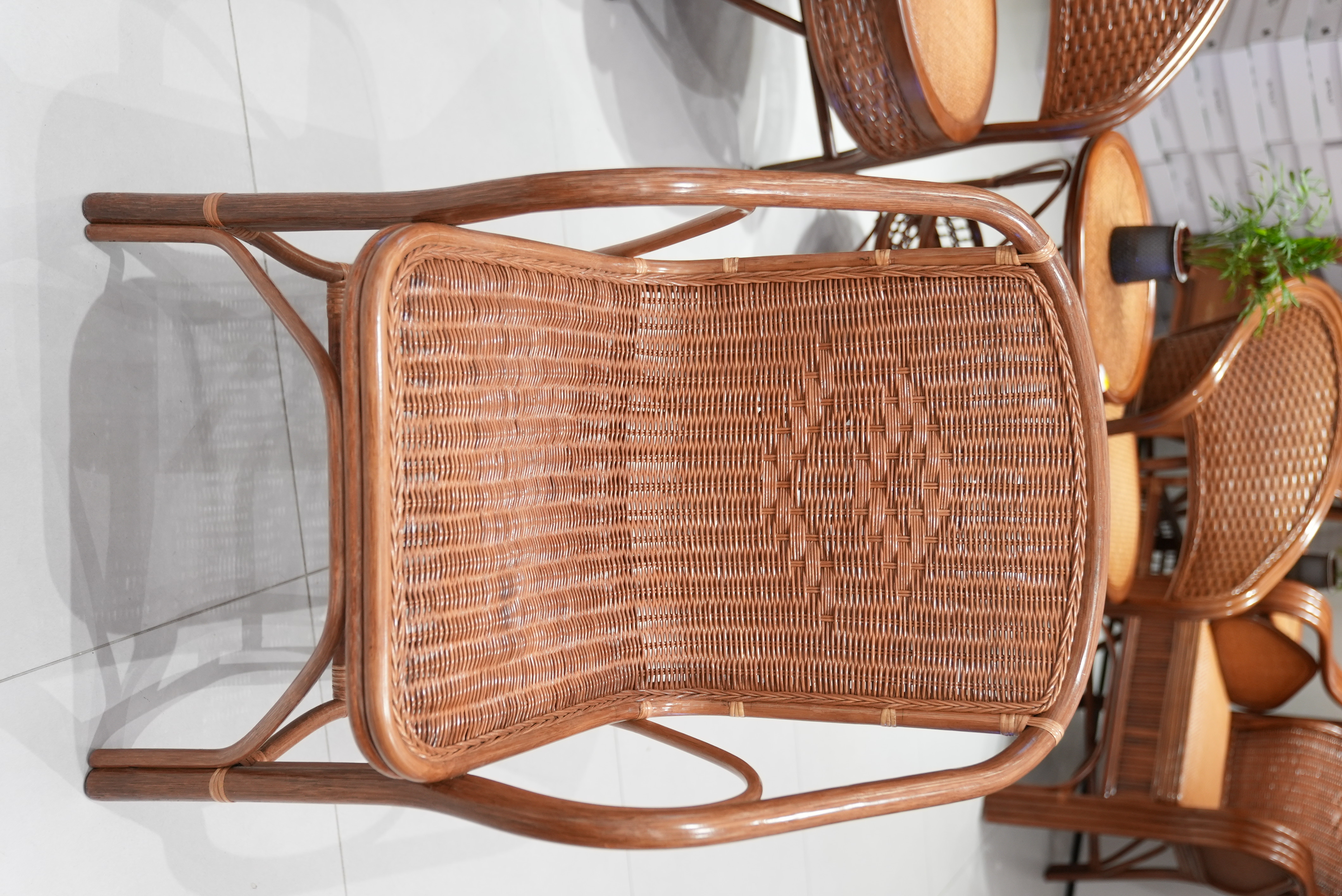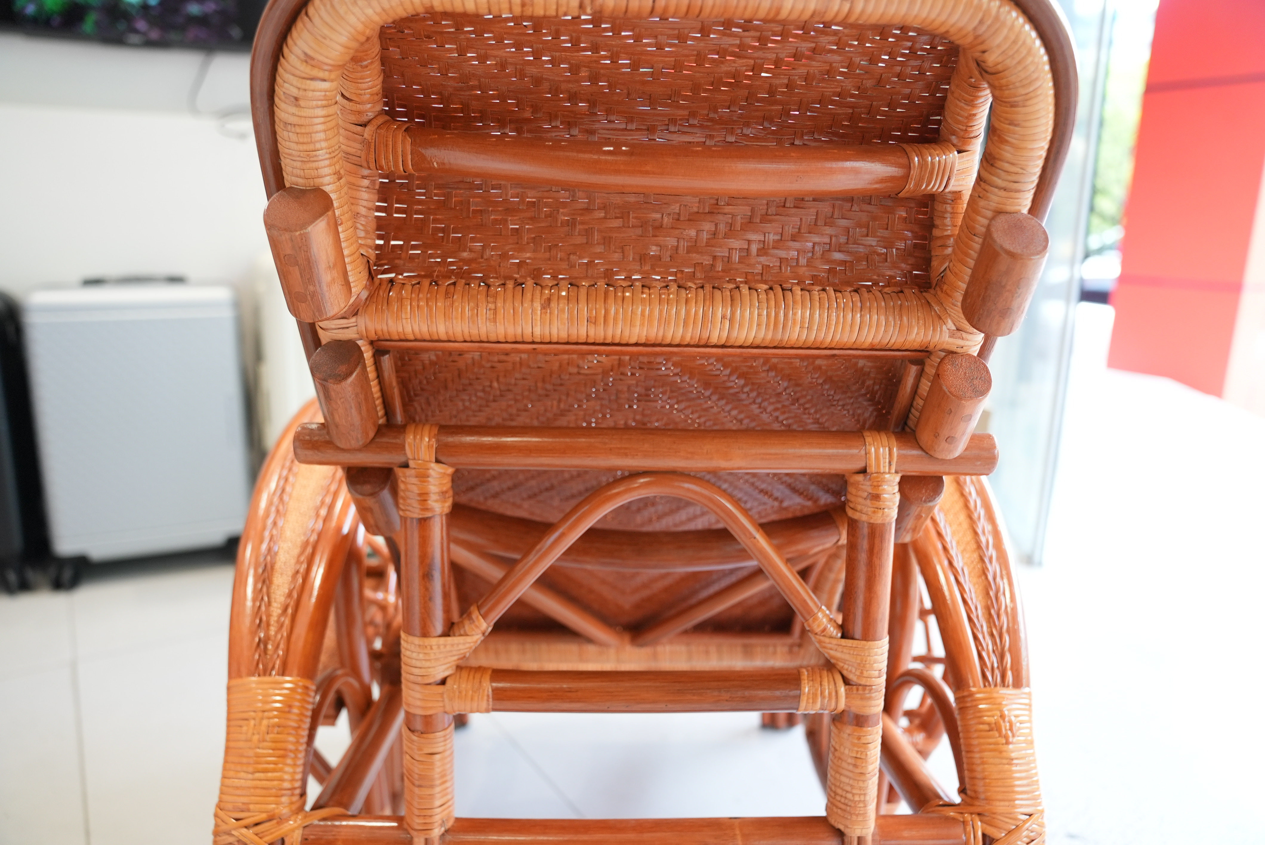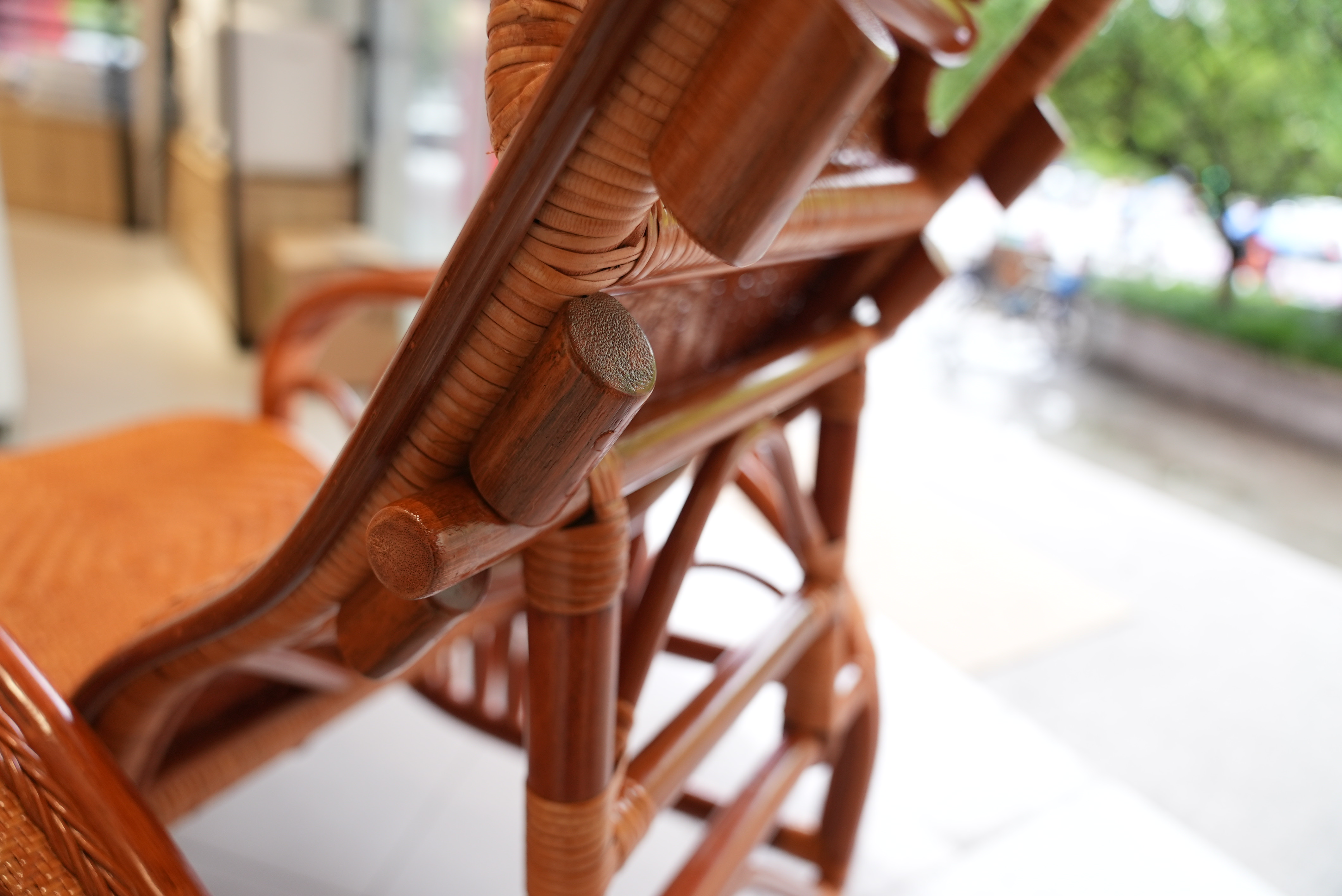 藤条都是实心的,多做底部支撑和框架;藤皮劈成细条后,编成座垫或靠位,透气又轻盈。即使是最重的摇摇椅,我两手也能轻松地拿起和放下。