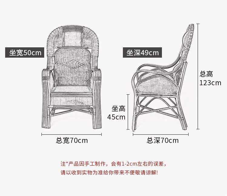手工制作,手工测量,尺寸可能存在偏差。藤椅收到时稍微有点毛刺,那也是正常的,毕竟是天然的材料,纯手工制作的。其他关于维修,保养等注意事项请详读文末“印尼藤制品相关问题”。