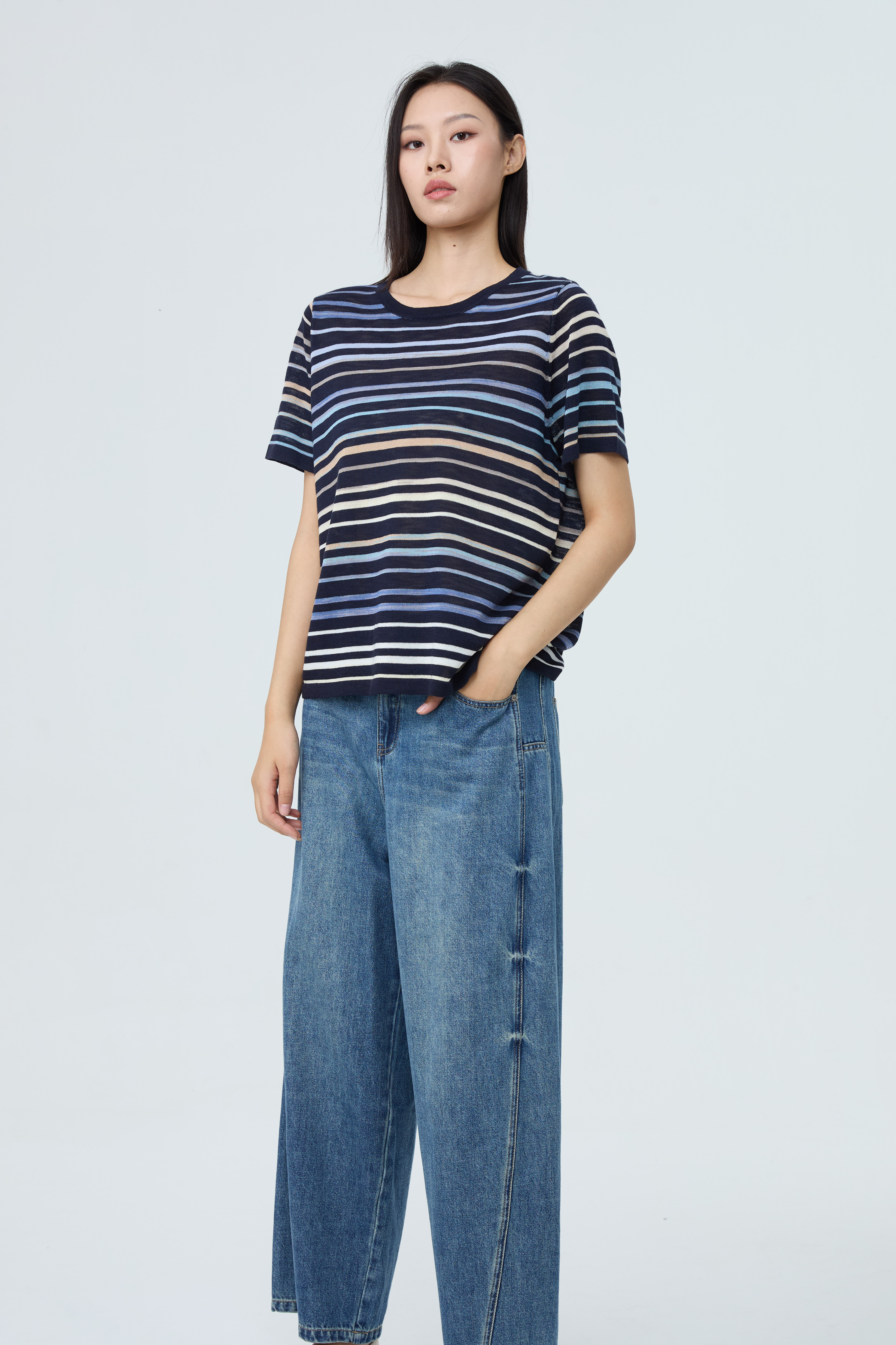 【推荐爆款~】水淼2026夏爆款素雅段染条纹短袖衫2523