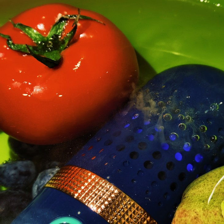 在净化器外形设计上,东菱采用了IPX7级的防水主机,无线轻巧的胶囊造型,不挑容器,不挑容积,无论是厨房的水槽还是洗菜盆,甚至就一个塑料袋都OK!它能用来清洗果蔬、鱼肉、五谷的农残,也能用来清洁餐具残留的病菌,可以说非常多功能了。用的时候也非常简单,按一下开关启动,直接丢水里,一般3-5L水用1次,6-10L水用2两次,它配有一个无线感应充电器,充满电后可以用25次,方便!