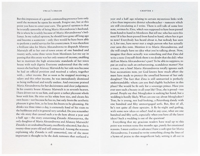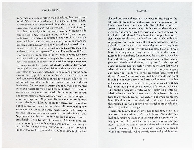 Written soon after Dostoevsky was released from the prison camp that inspired The House of the Dead, Uncle’s Dream shares very little of that novel’s gloomy tone and contains many elements of a light, drawing-room farce. Beneath the surface, however, lies a sharply satirical voice which looks ahead in part to later novels such as Devils.