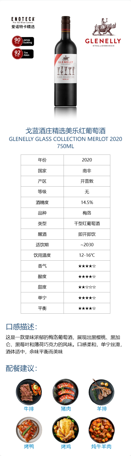 【南非波尔多风优雅美乐】Glenelly Glass Collection Merlot 2020 750Ml 戈蓝酒庄精选美乐红葡萄酒