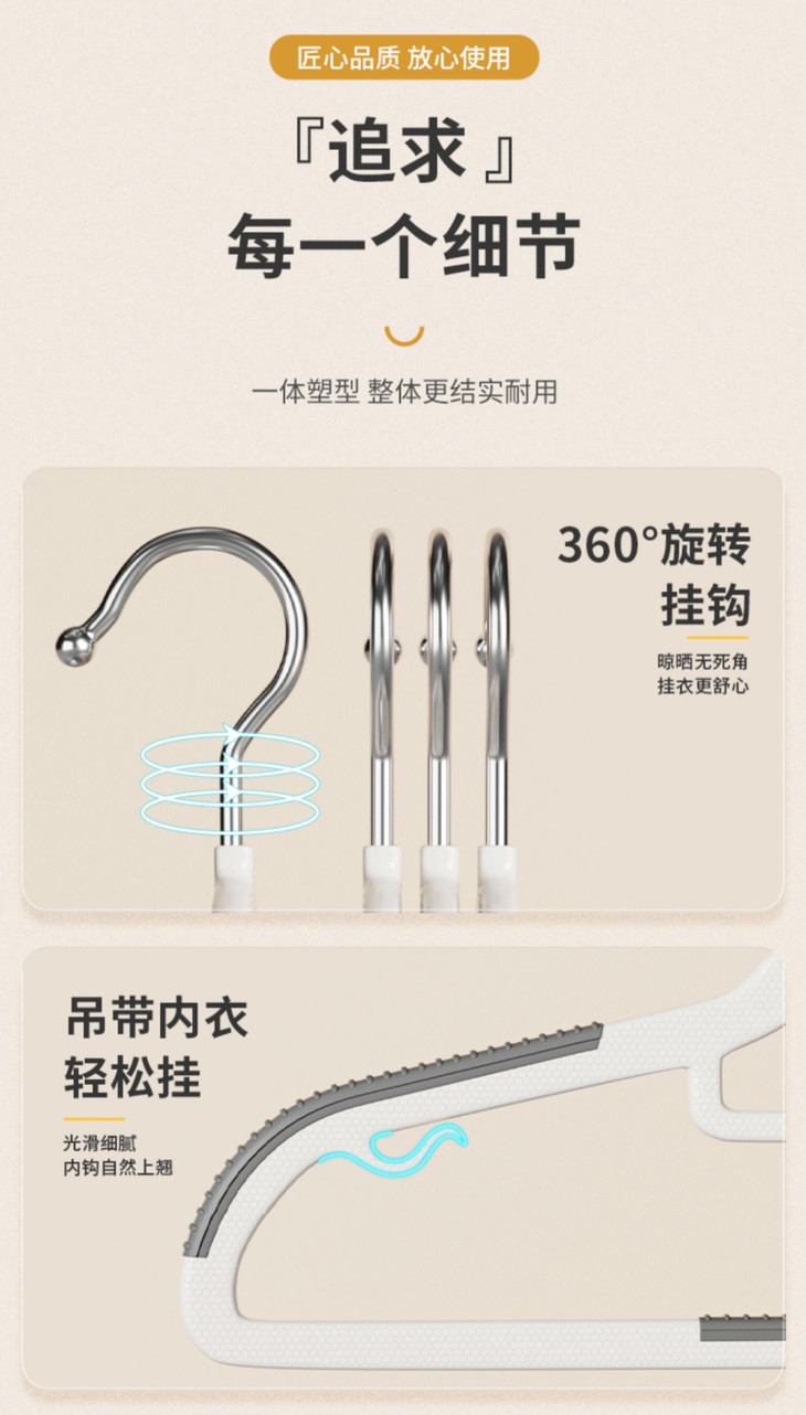 衣架的两侧被设计成人体工学的肩部支撑,很好的解决了长时间晾晒容易鼓胀变形的问题;同时还有加粗耐用的防滑凹槽,能防止衣物滑落;在传统衣架的基础上增加了方便晾挂背心或者丝巾等小物件的防滑挂钩和领带档,下侧也加了防滑,挂裤子也超方便;和普通衣架相比更厉害的是它的360°旋转挂钩加轻薄纤细的体型,不占空间的同时各种犄角旮旯的位置也都能利用起来!
