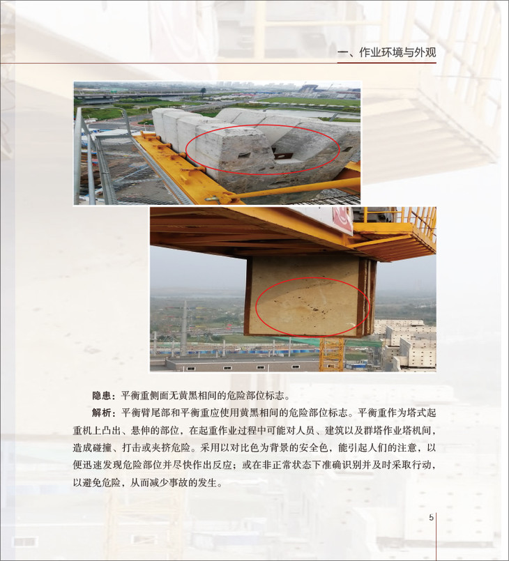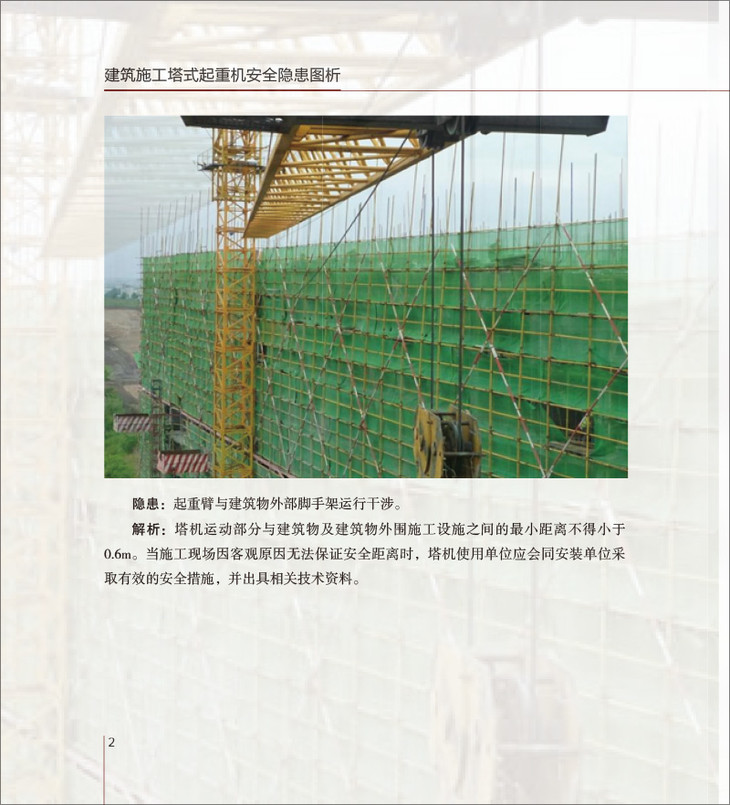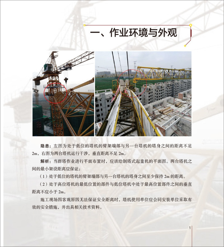近年来,施工现场在用塔机数量激增,安拆、维保、使用、管理人员也随之增加。为便于使用、产权、维保和检测等相关单位的人员更直观地管理和使用施工现场的塔机,排查现场塔机存在的安全隐患,降低事故发生率,我们依据现行标准GB5031《塔式起重机》、GB5144《塔式起重机安全规程》、JGJ305《建筑施工升降设备设施检验标准》等相关标准,结合检验人员常年在施工现场检验塔机的隐患实拍照片,编制了这本《建筑施工塔式起重机安全隐患图析》。