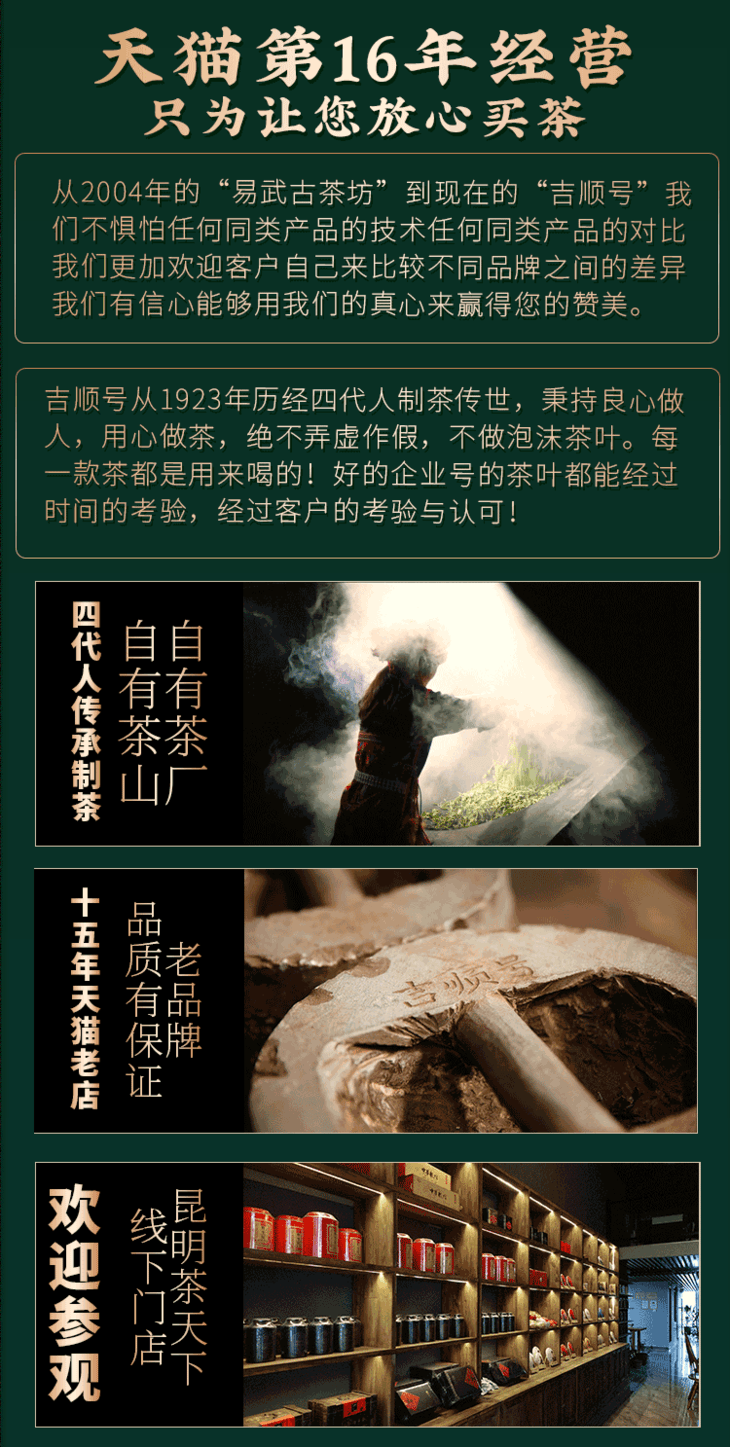 - 云南吉顺号茶业,专业云南普洱茶基地生产销售商。自有基地茶厂及运营仓储物流团队。