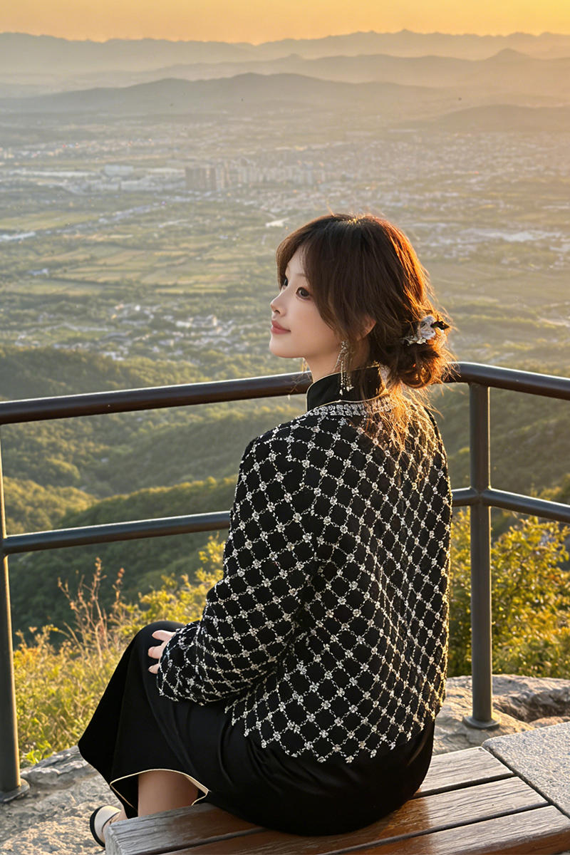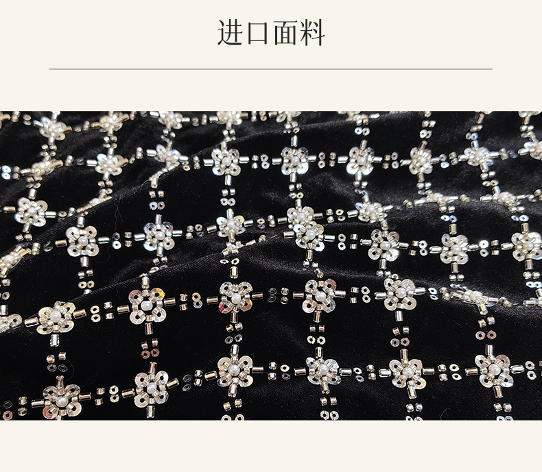 暗纹织就的菱格像揉碎的夜,缀在丝绒肌理里的银钻是漏下的星。立领勾出清冷轮廓,珍珠边缝裹着低调的贵气 —— 是晚宴里转身时,自带柔光的松弛优雅。