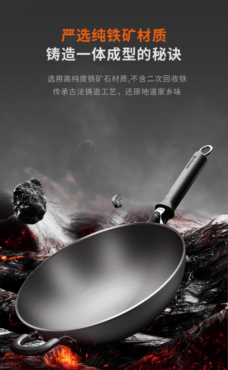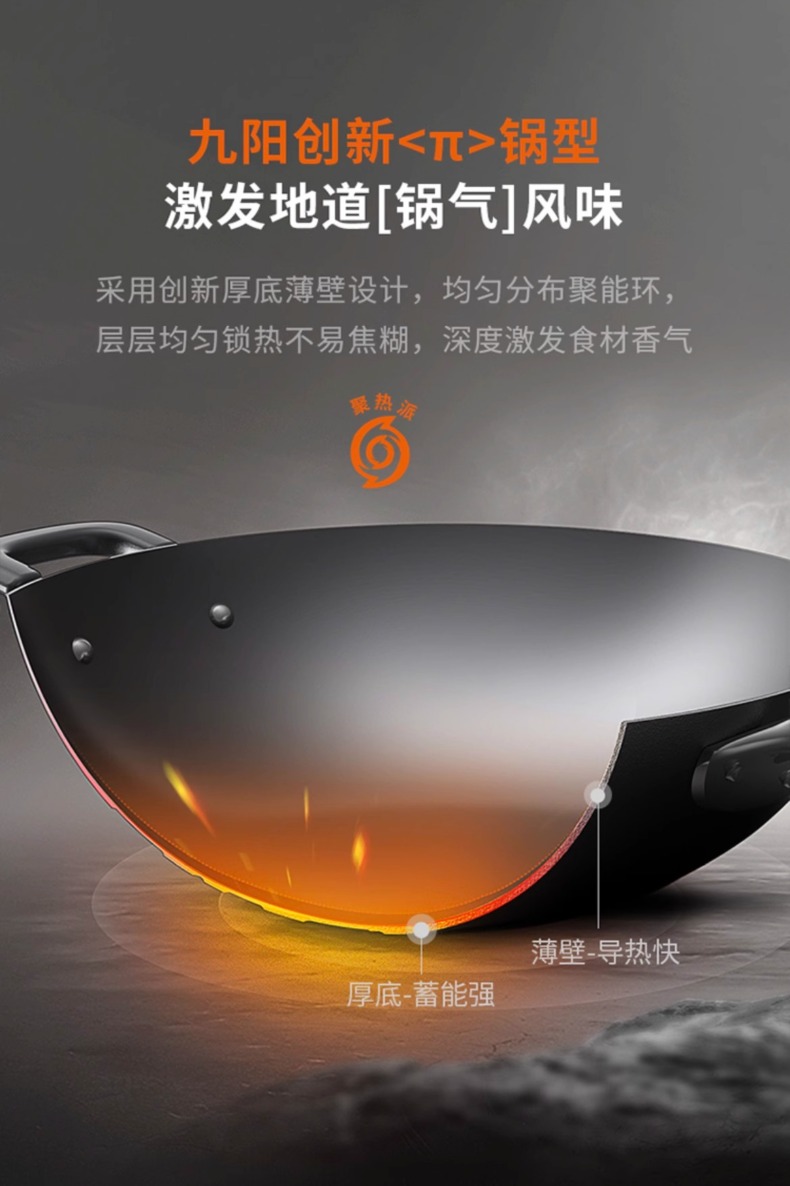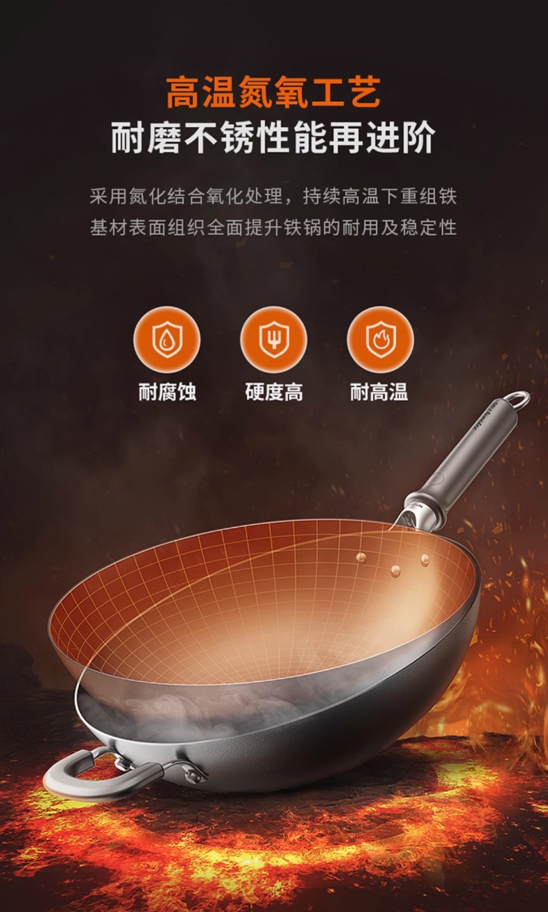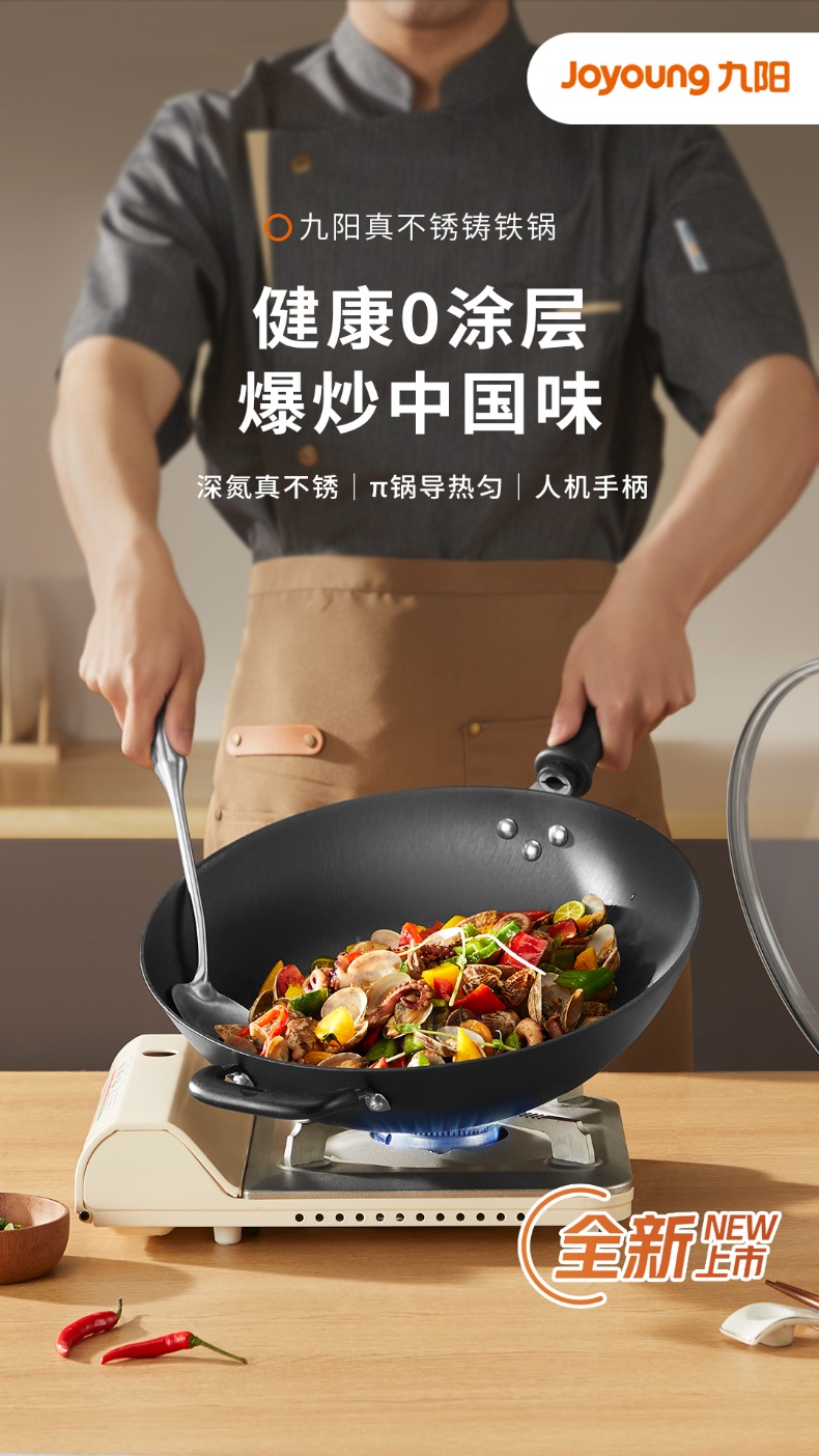 九阳炒锅深氮真不锈家用0涂层纯铁不锈钢平底炒菜锅电磁炉燃气通用32cm