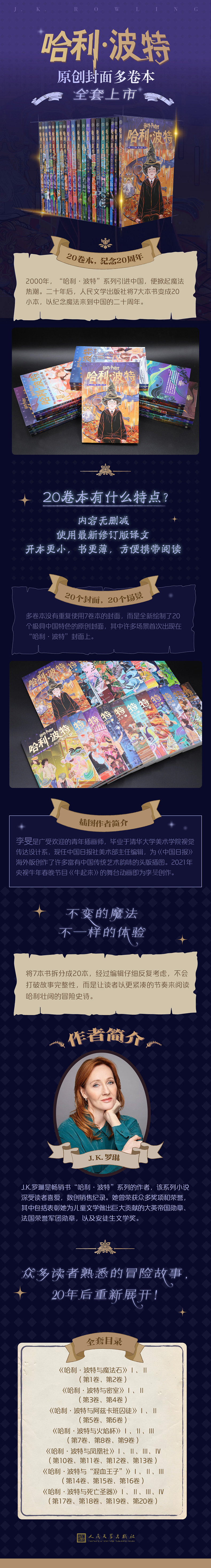 20卷本庆祝哈利·波特来到中国20周年,知名插画家李旻绘制中国风原创封面插画,编辑团队、译者再一次从头至尾修订译文,“恶作剧精灵皮皮鬼”等魔法名词确定统一。