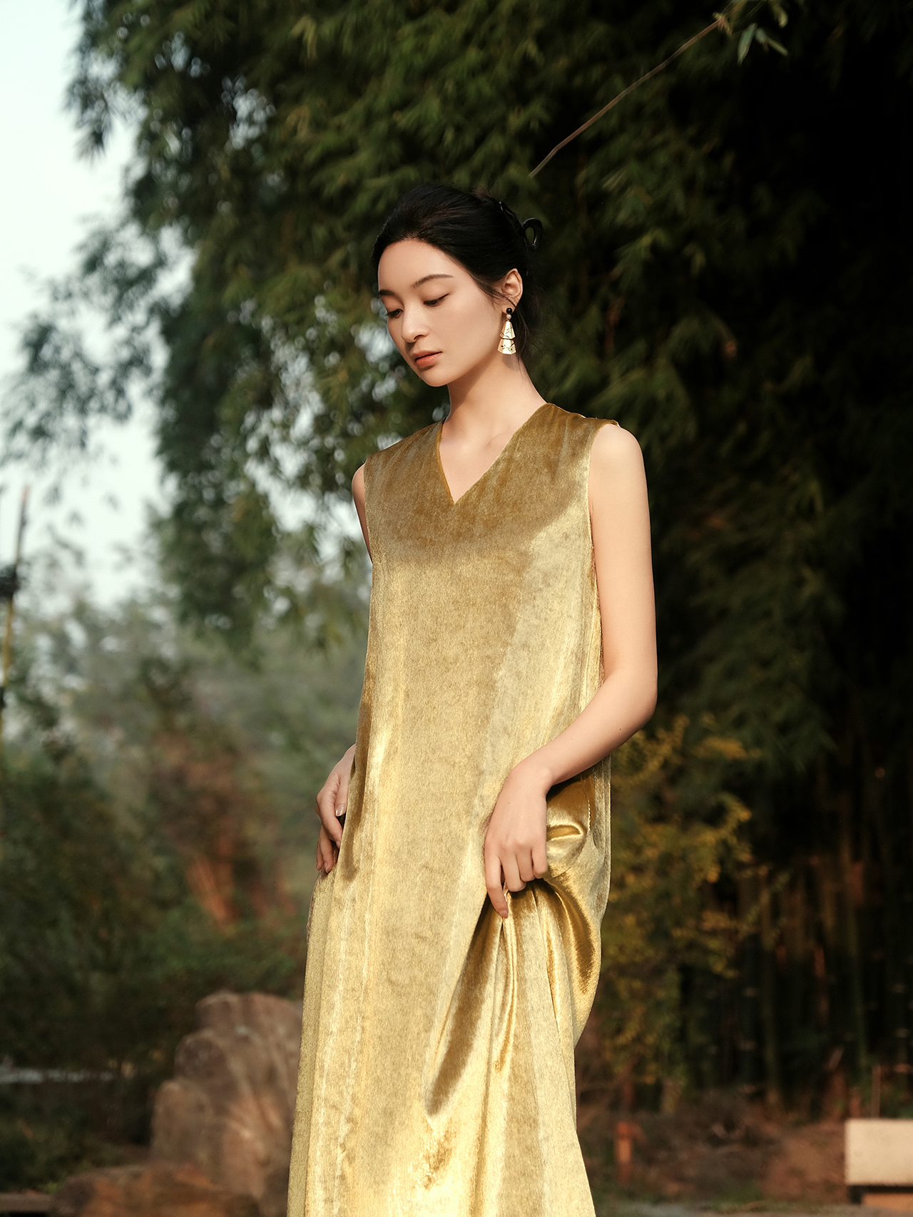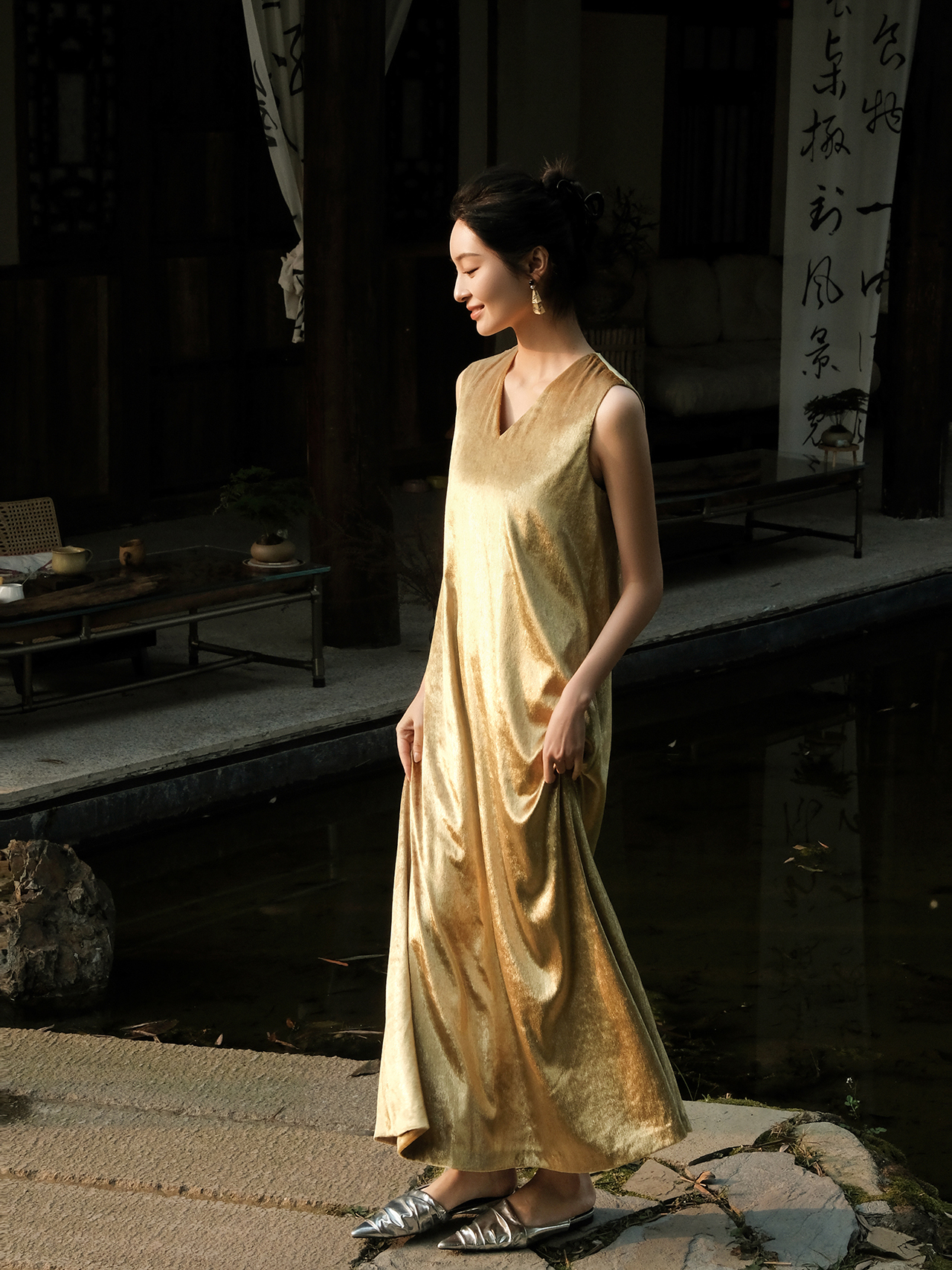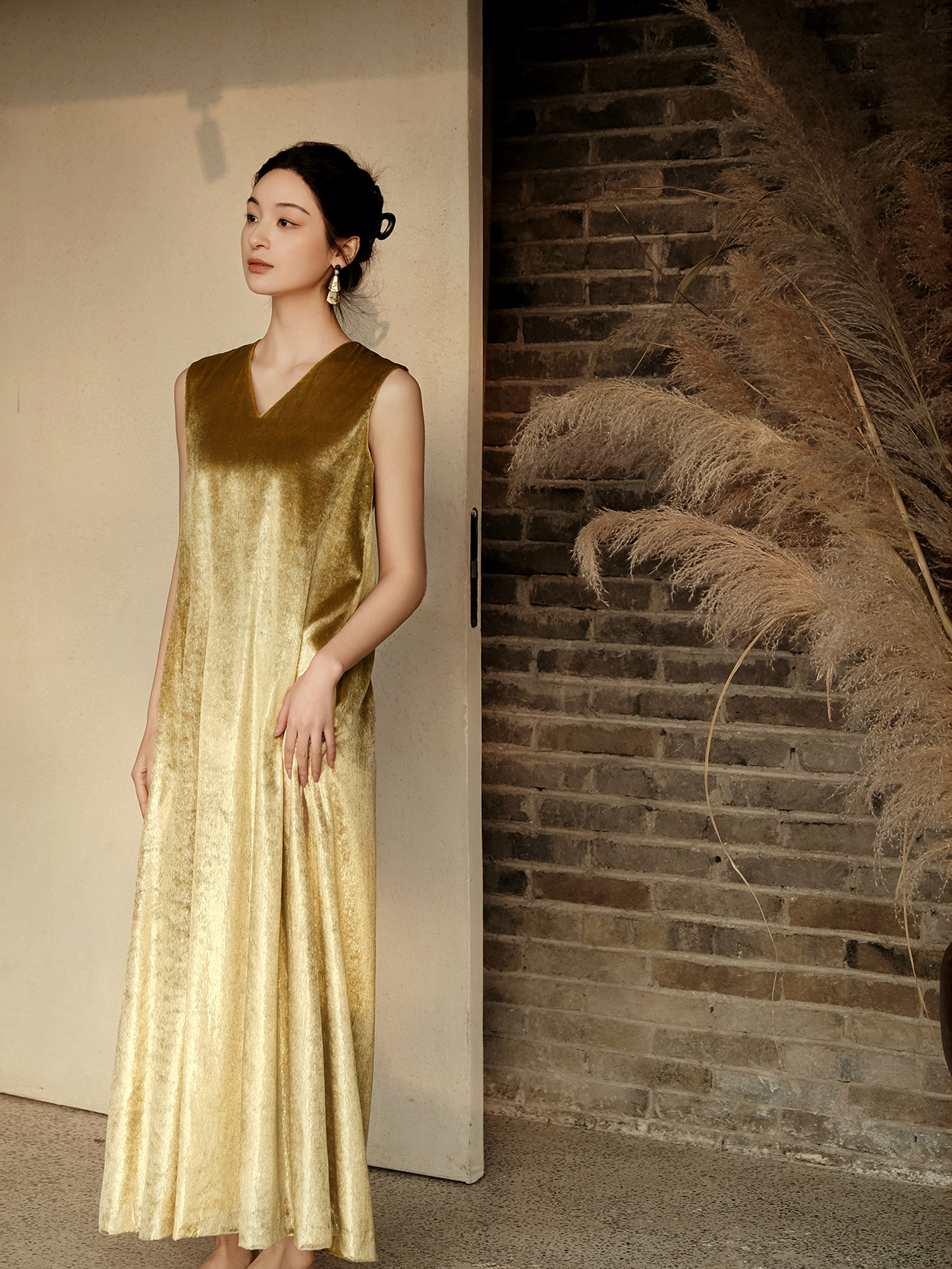 廷前观棠 |檀金-金色亮丝丝绒长裙