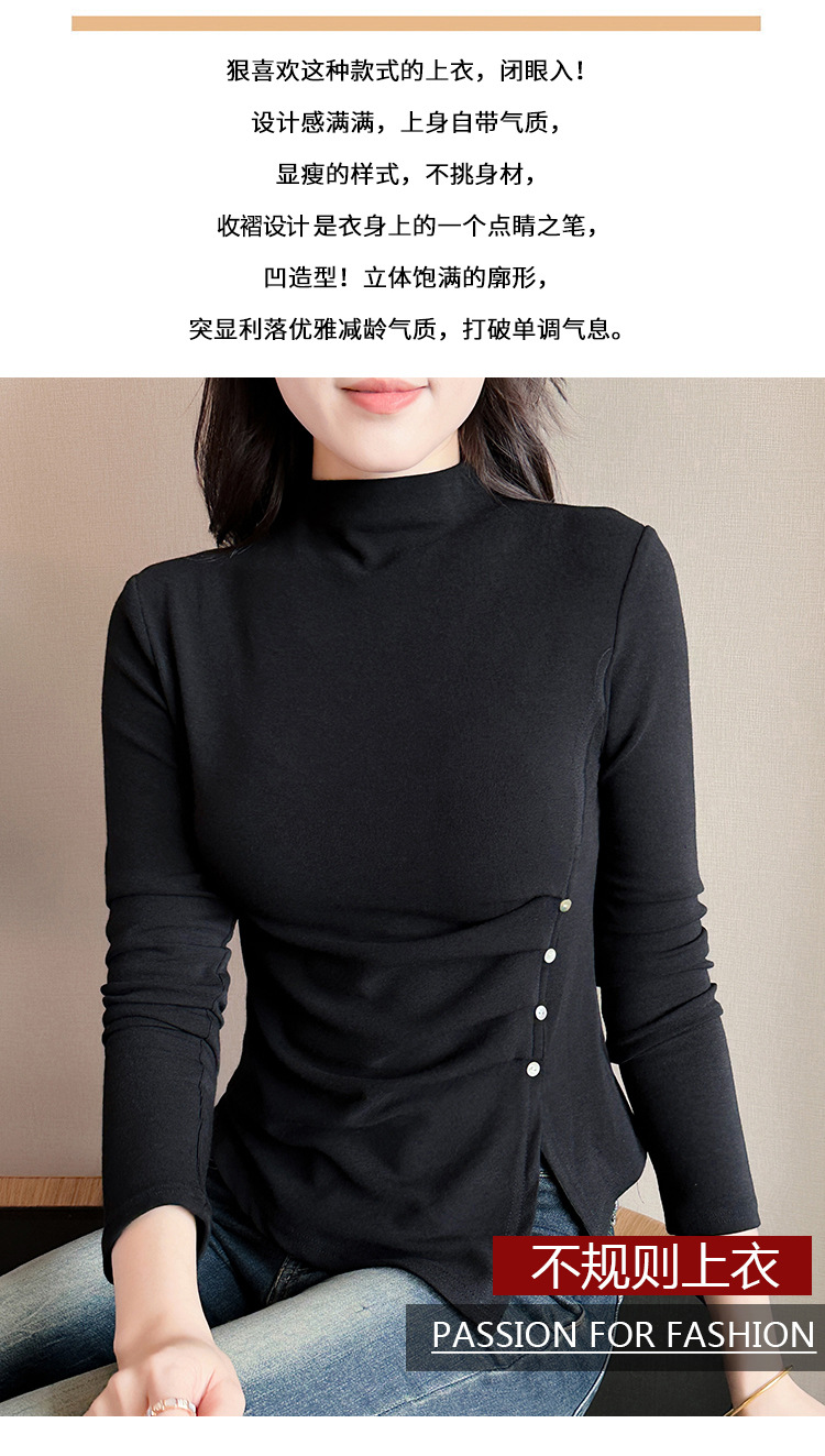 KQL311H9182 磨毛加厚半高领不规则纯色上衣女2025年秋季新款开叉T恤纯色长袖