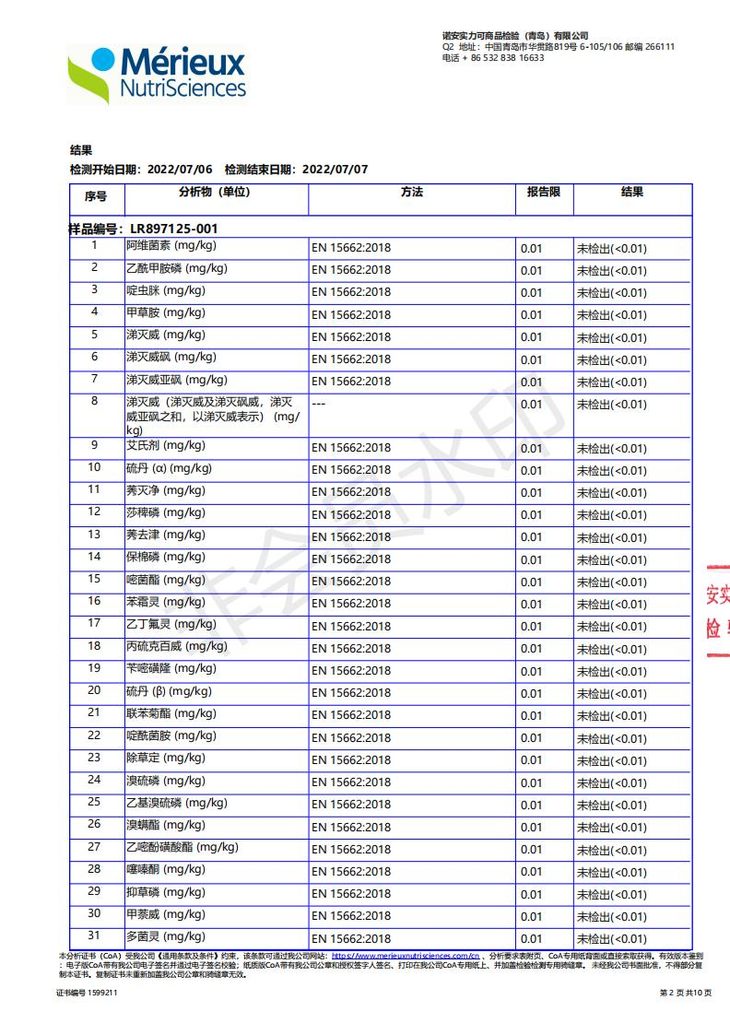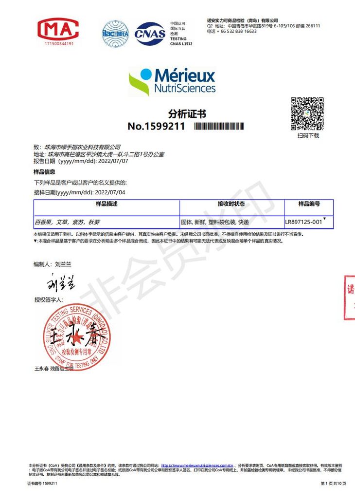 百香果在种植过程中使用酵素、有机肥、花生麸、竹粉、竹醋、草木灰等,上架前绿手指的小伙伴去现场考察,现场采样检测260+农残,全部无检出。2022年七月份绿手指的小伙伴再次去到基地并抽样检测,进行农残检测,也是260+农残无检出。