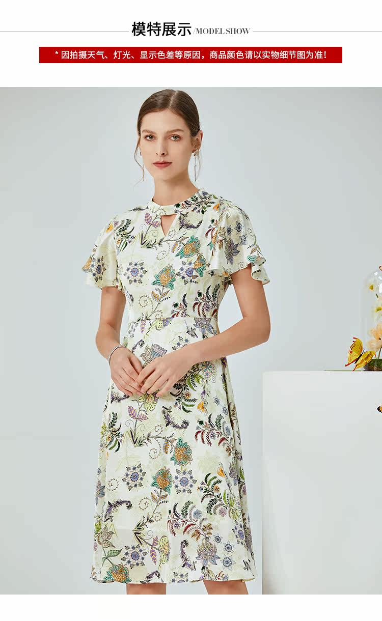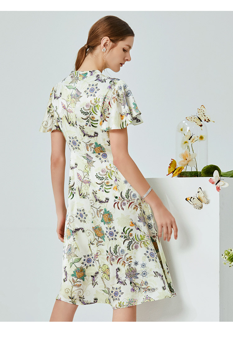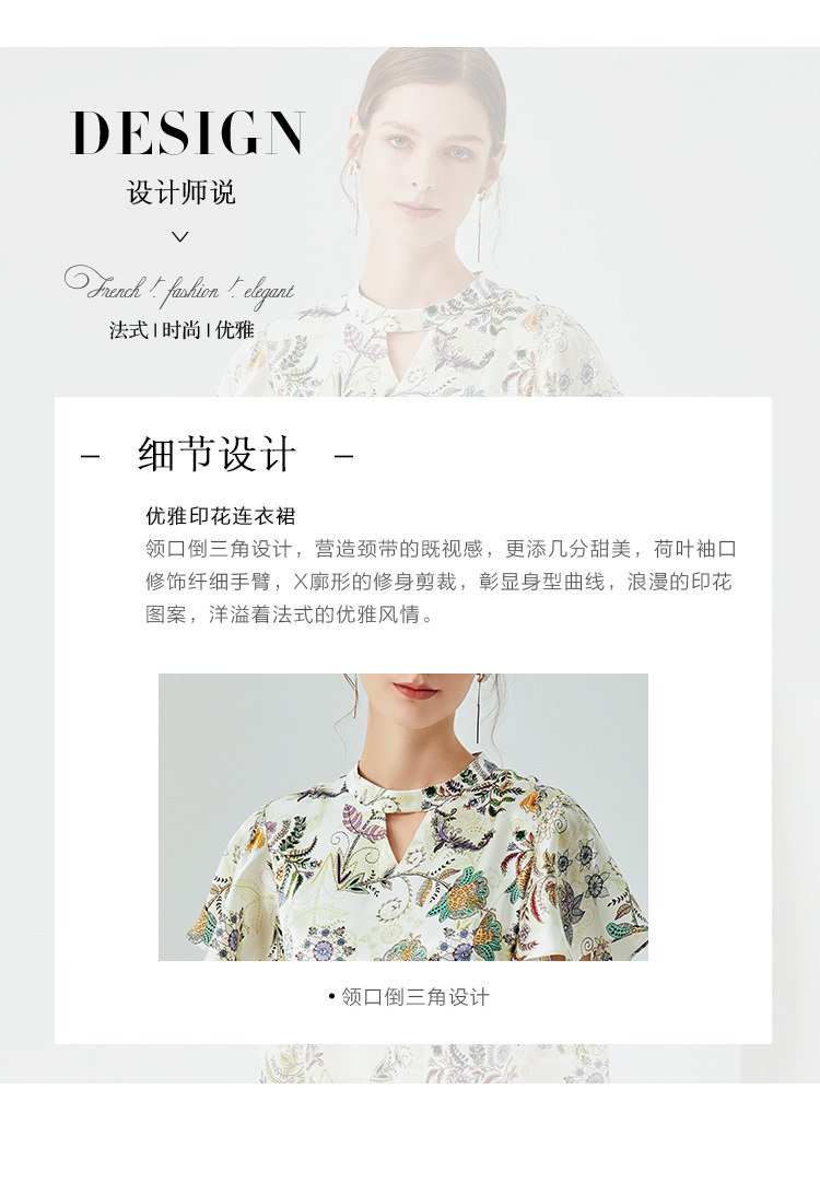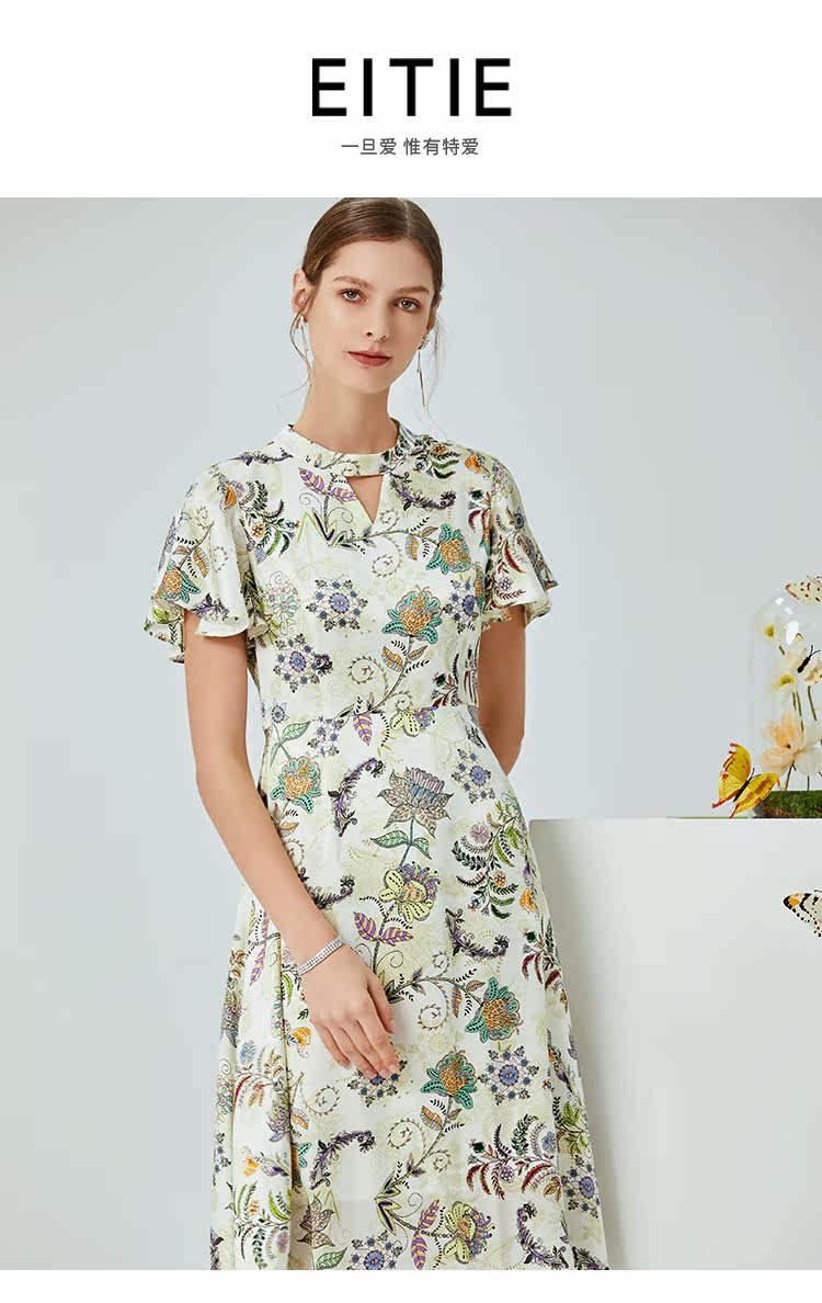 EITIE爱特爱夏季新款时尚清新飞飞袖V领收腰A摆印花连衣裙女B2007414