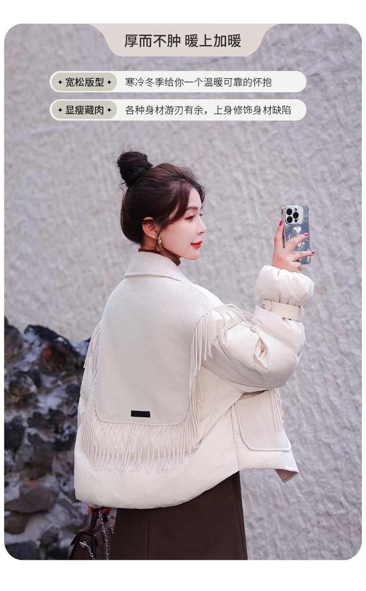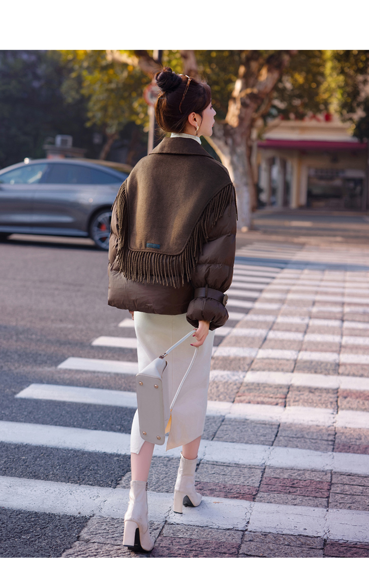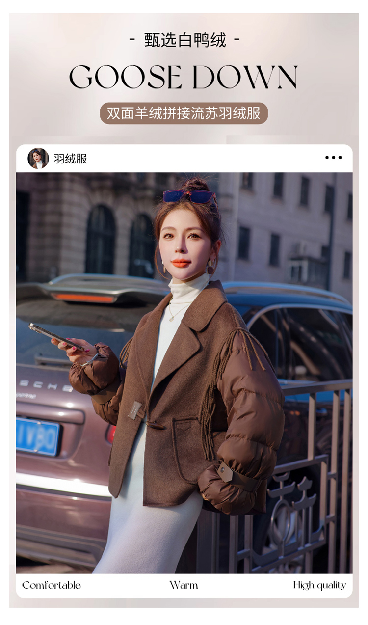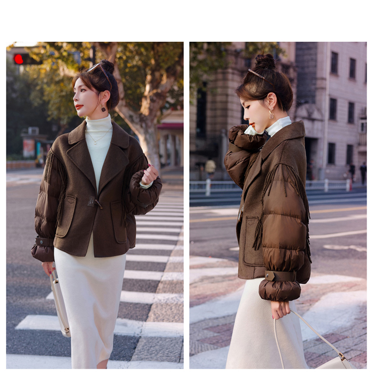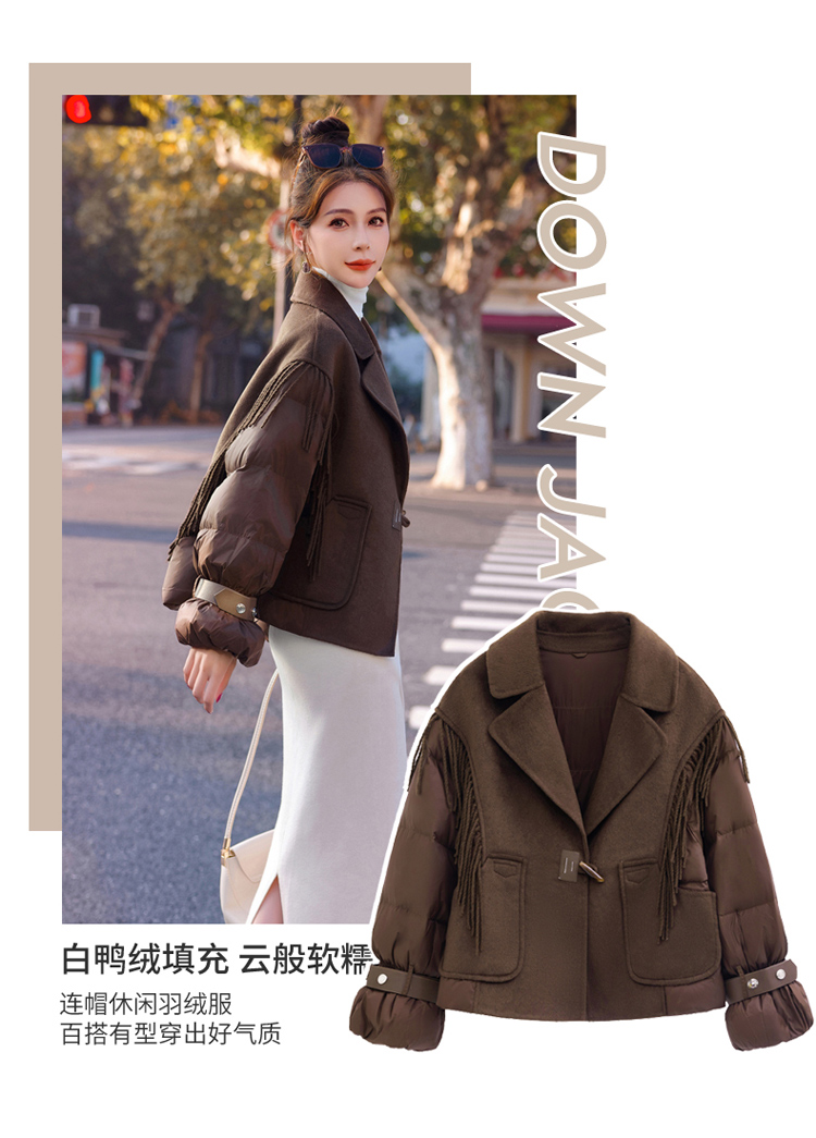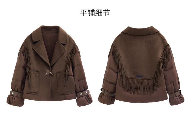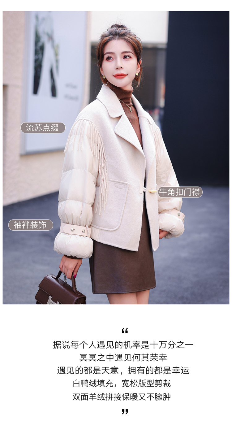 时尚保暖,90白鸭绒双面羊绒拼接流苏牛角扣美拉德羽绒服HR-YJLY8080
