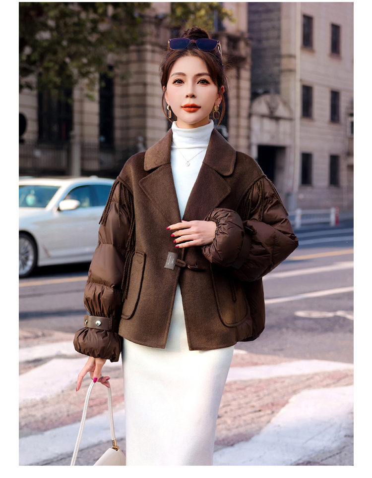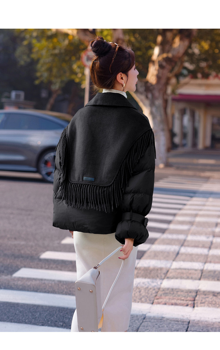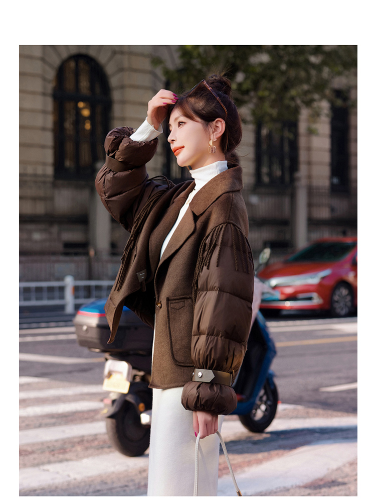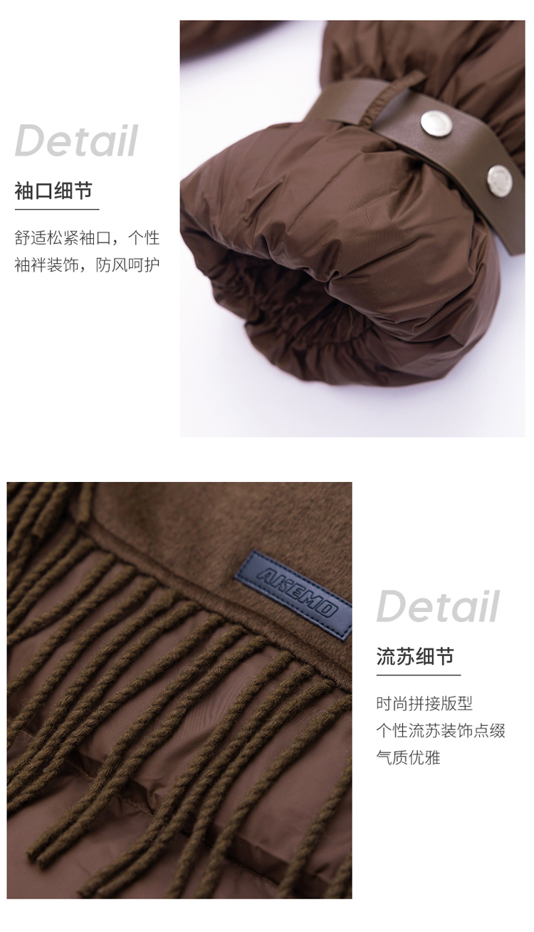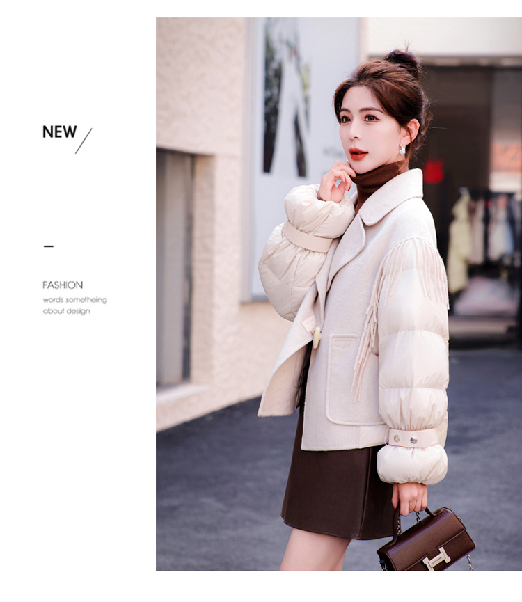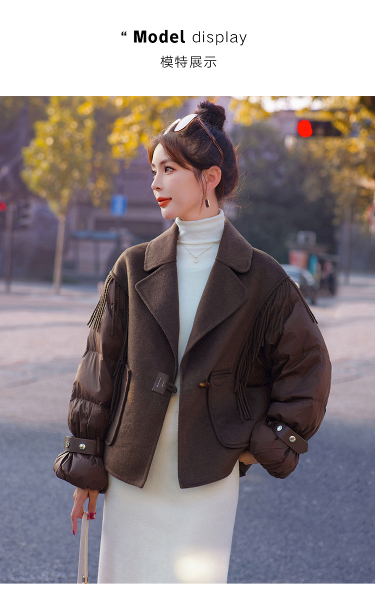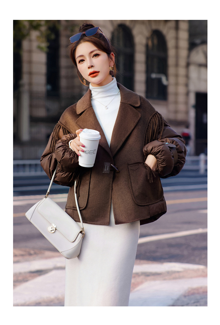 时尚保暖,90白鸭绒双面羊绒拼接流苏牛角扣美拉德羽绒服HR-YJLY8080