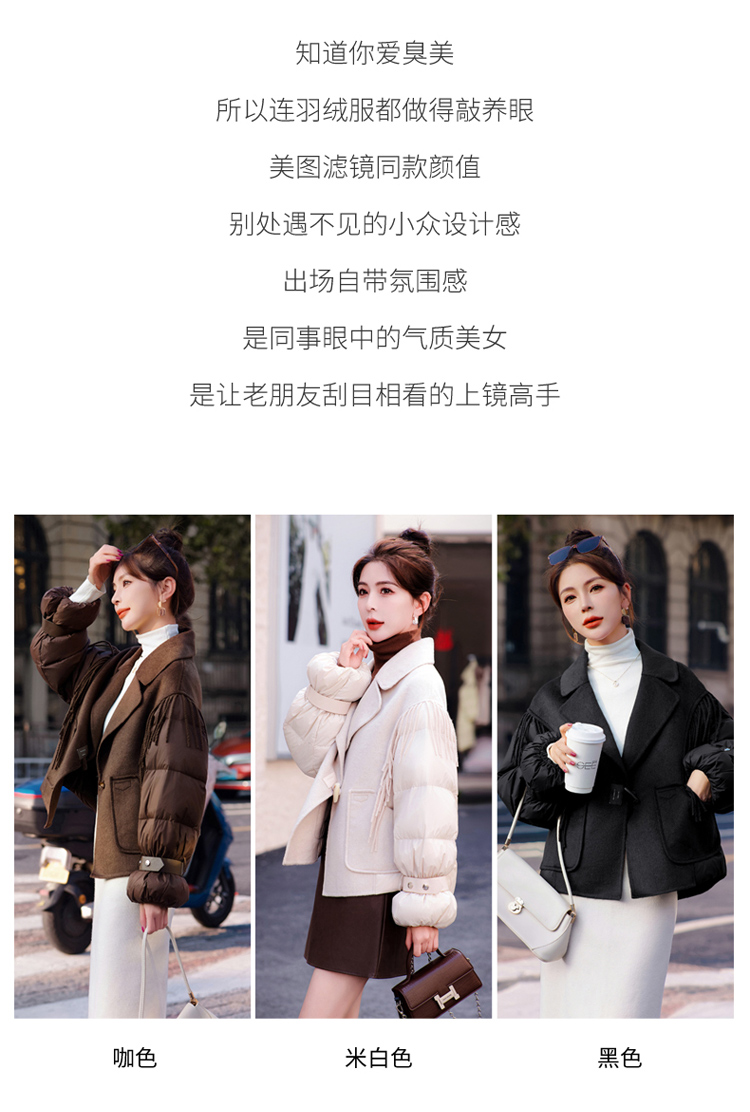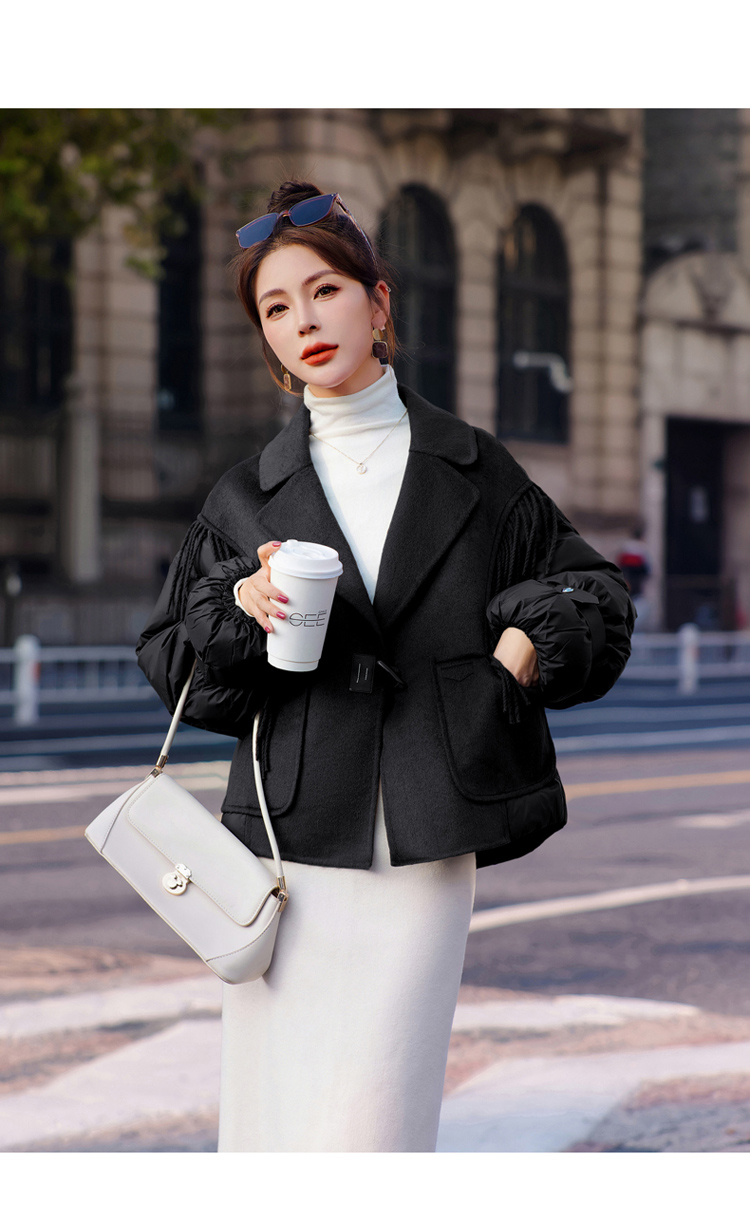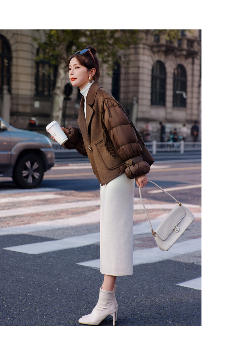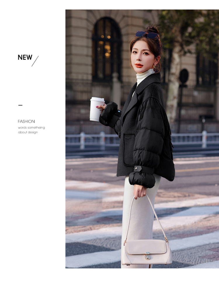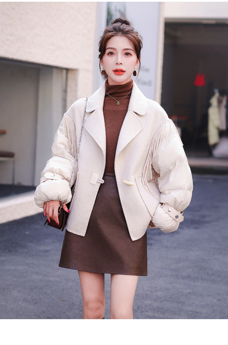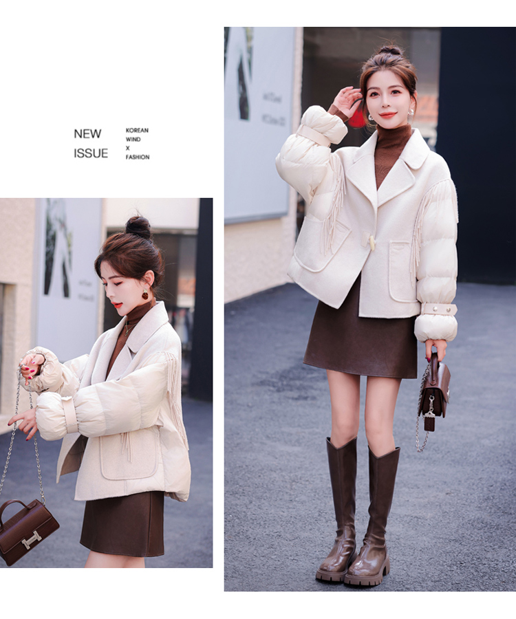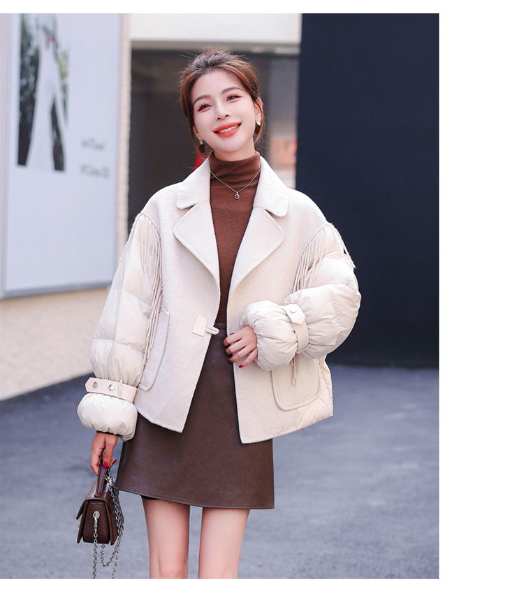 时尚保暖,90白鸭绒双面羊绒拼接流苏牛角扣美拉德羽绒服HR-YJLY8080