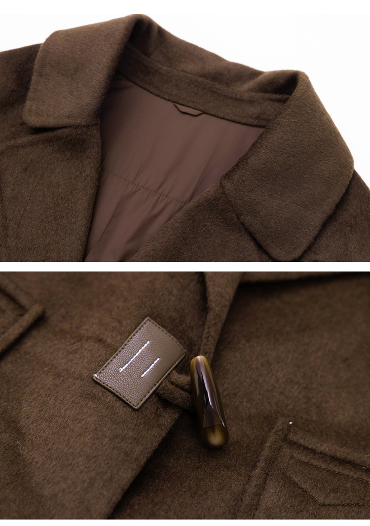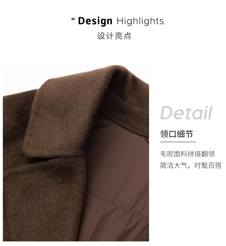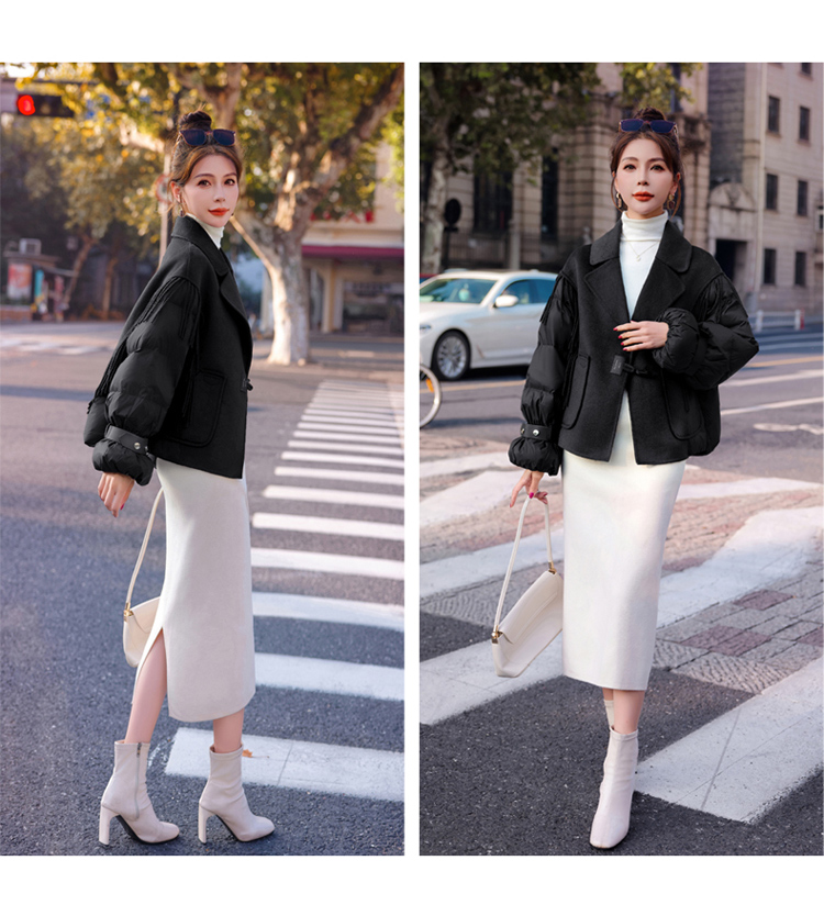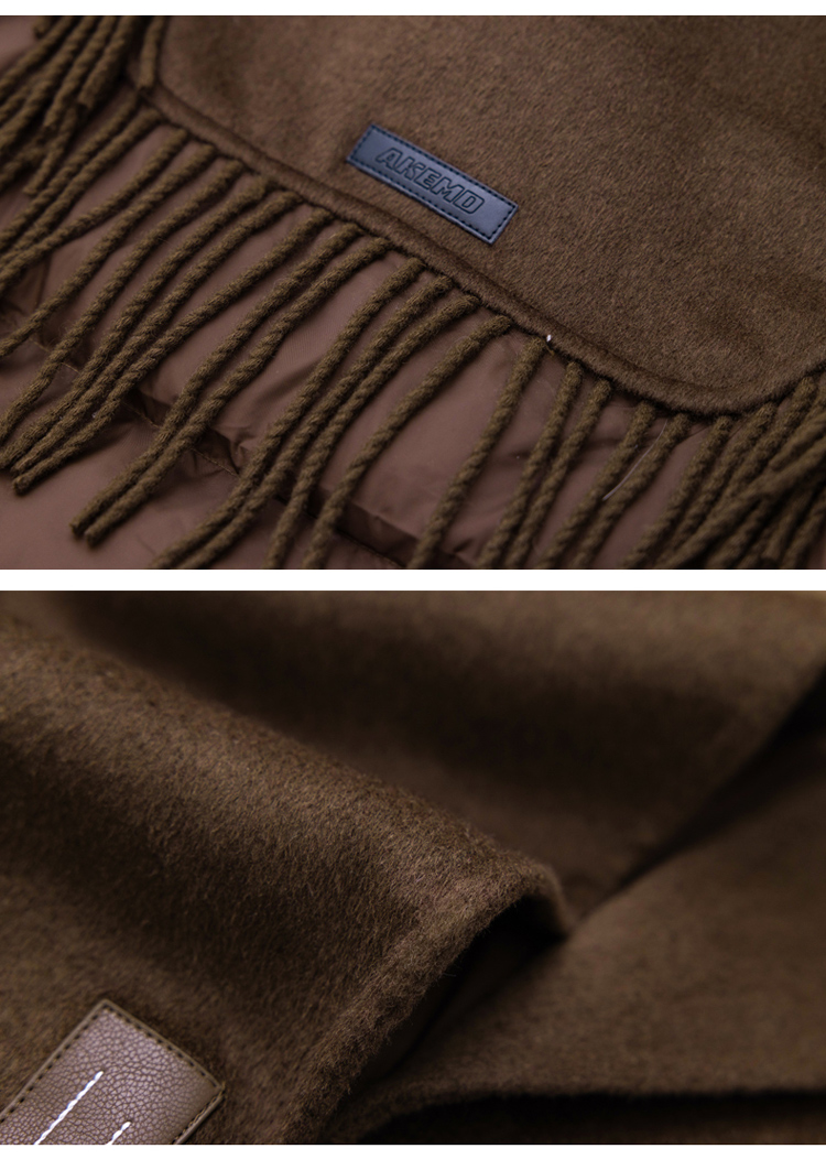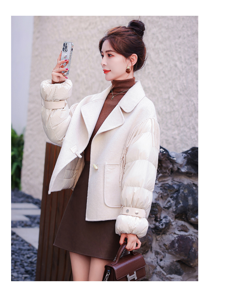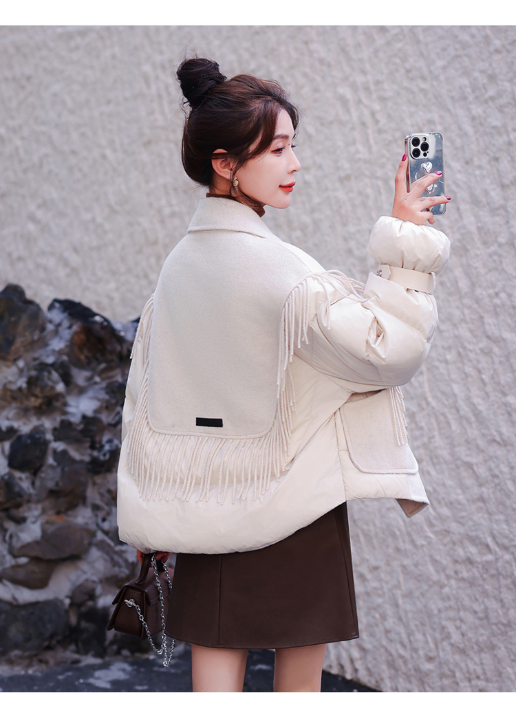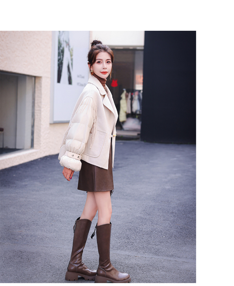 时尚保暖,90白鸭绒双面羊绒拼接流苏牛角扣美拉德羽绒服HR-YJLY8080