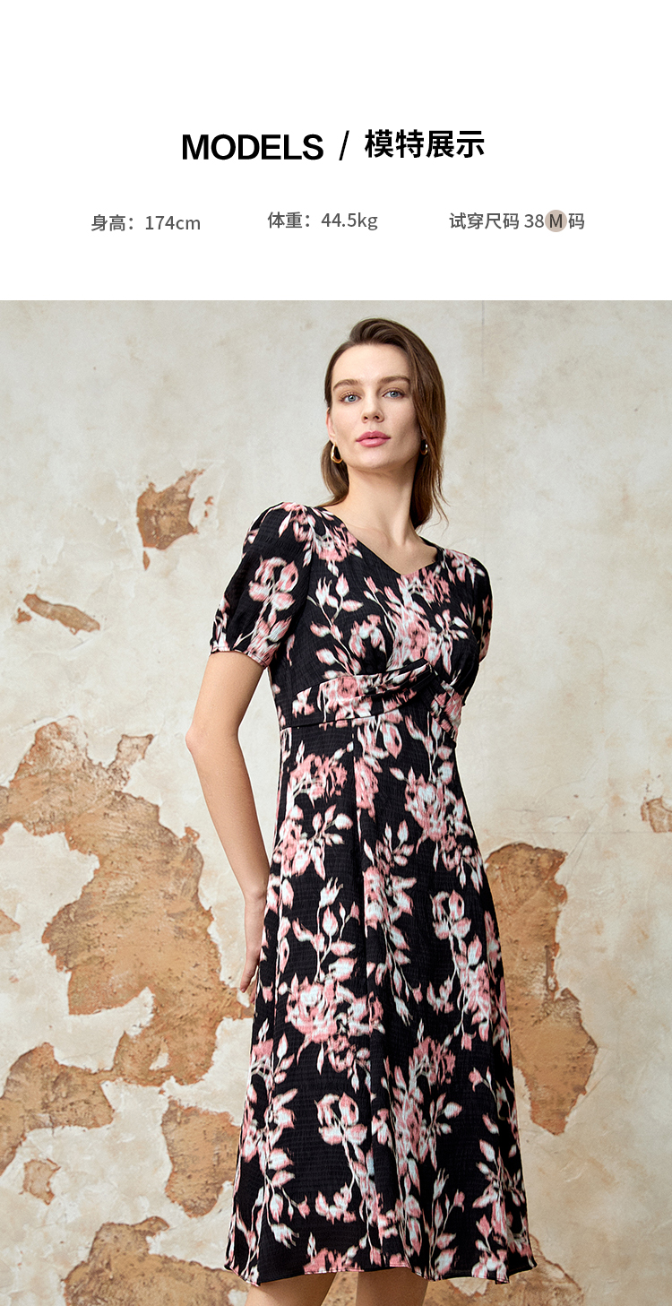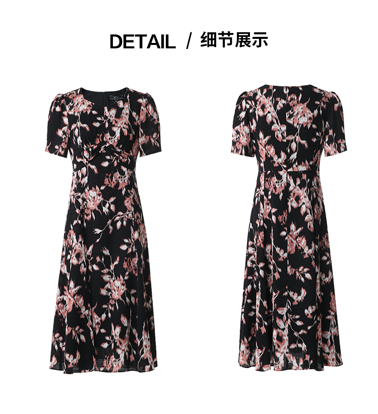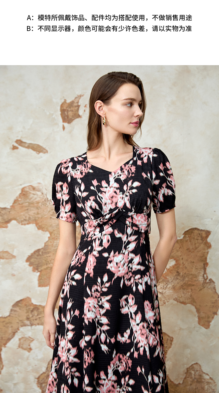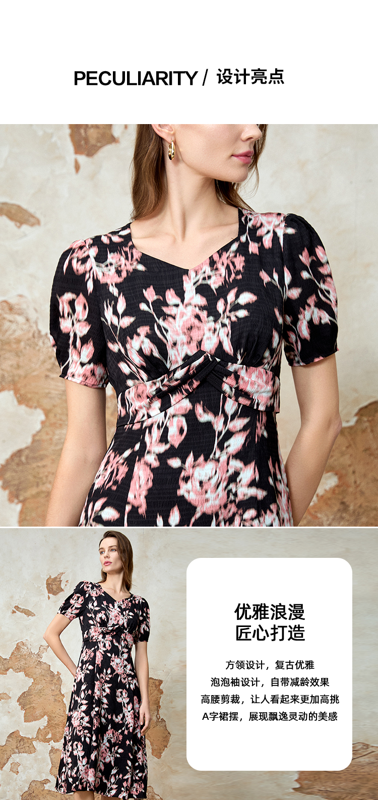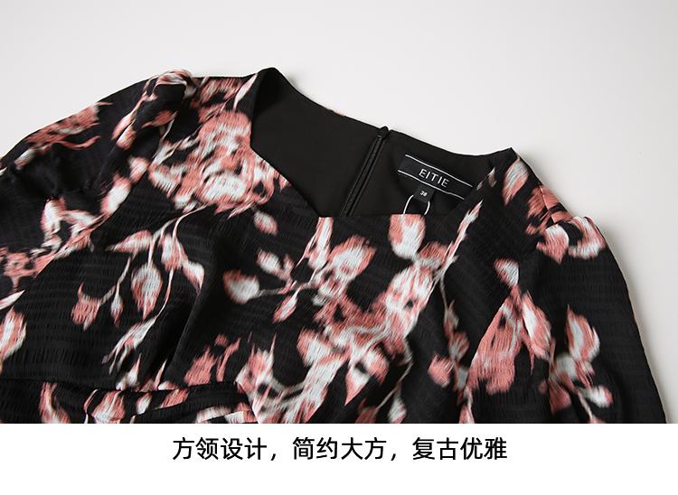 EITIE爱特爱复古鸡心领收腰印花修身连衣裙春季新款8107827