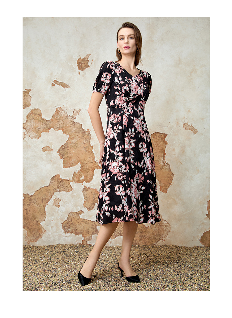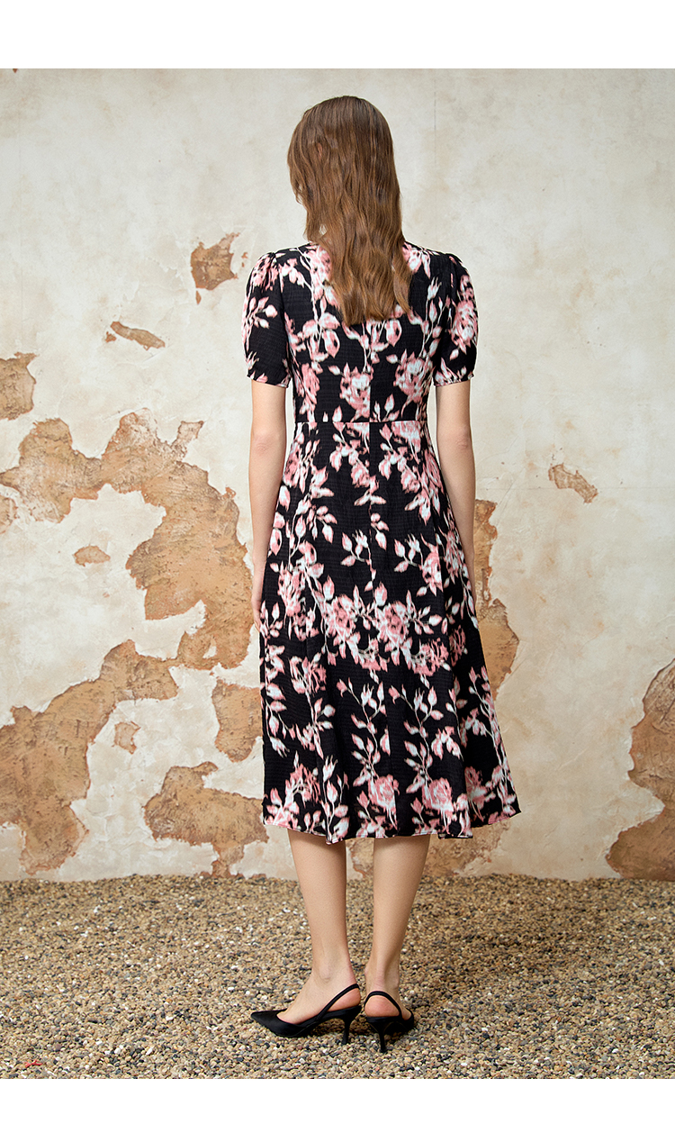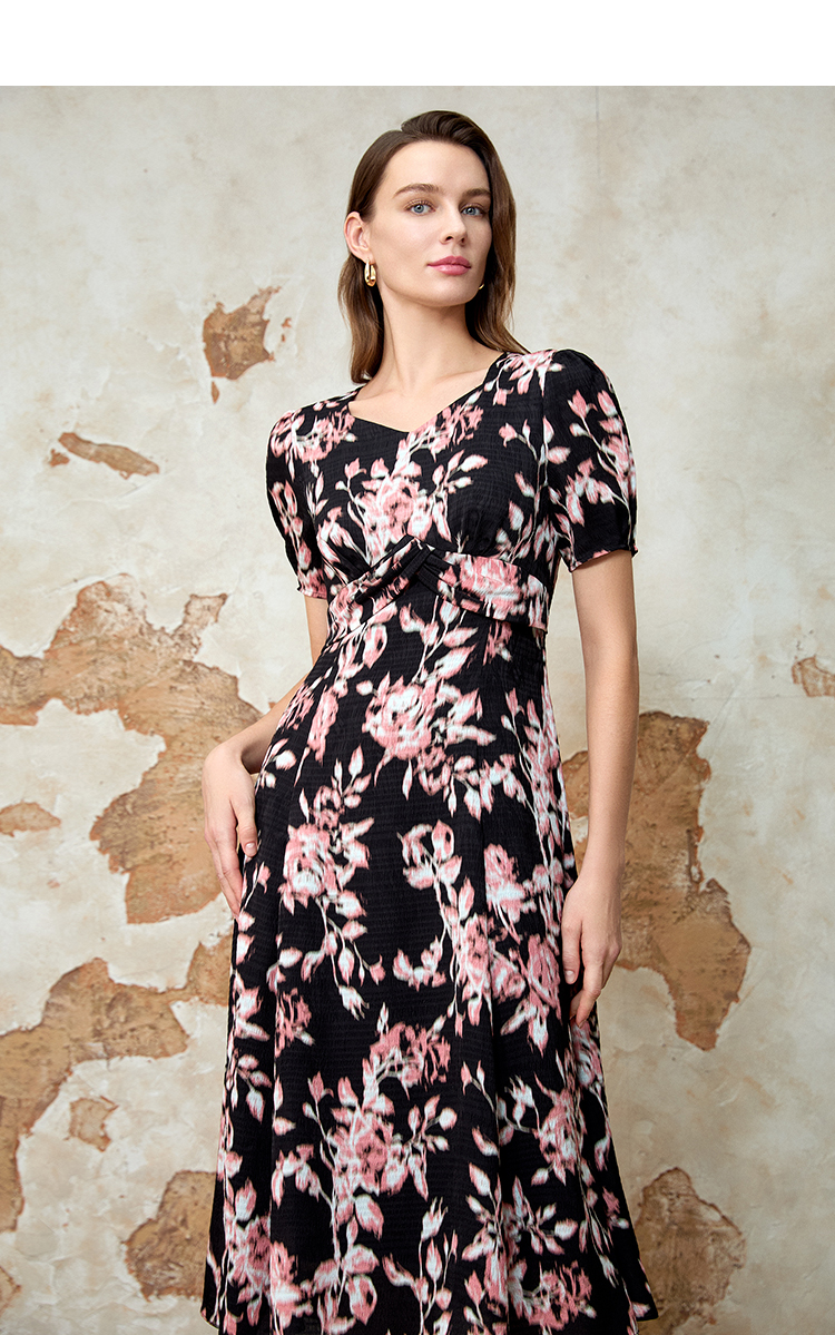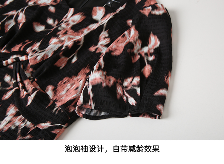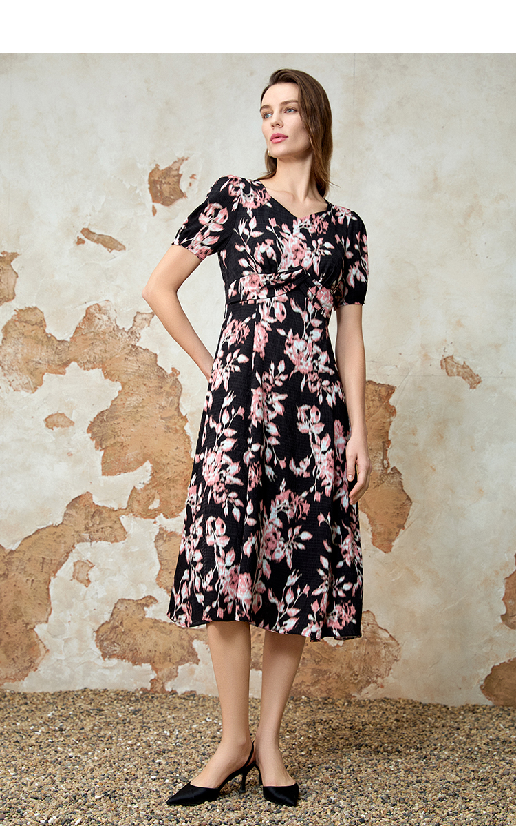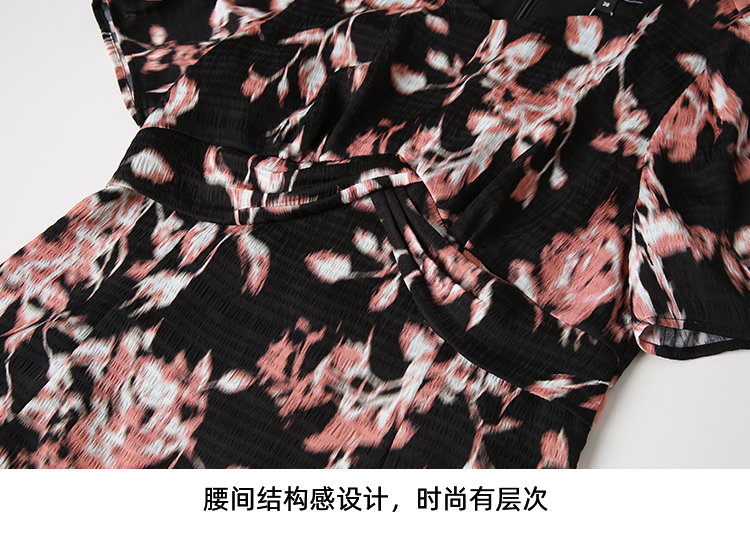 EITIE爱特爱复古鸡心领收腰印花修身连衣裙春季新款8107827