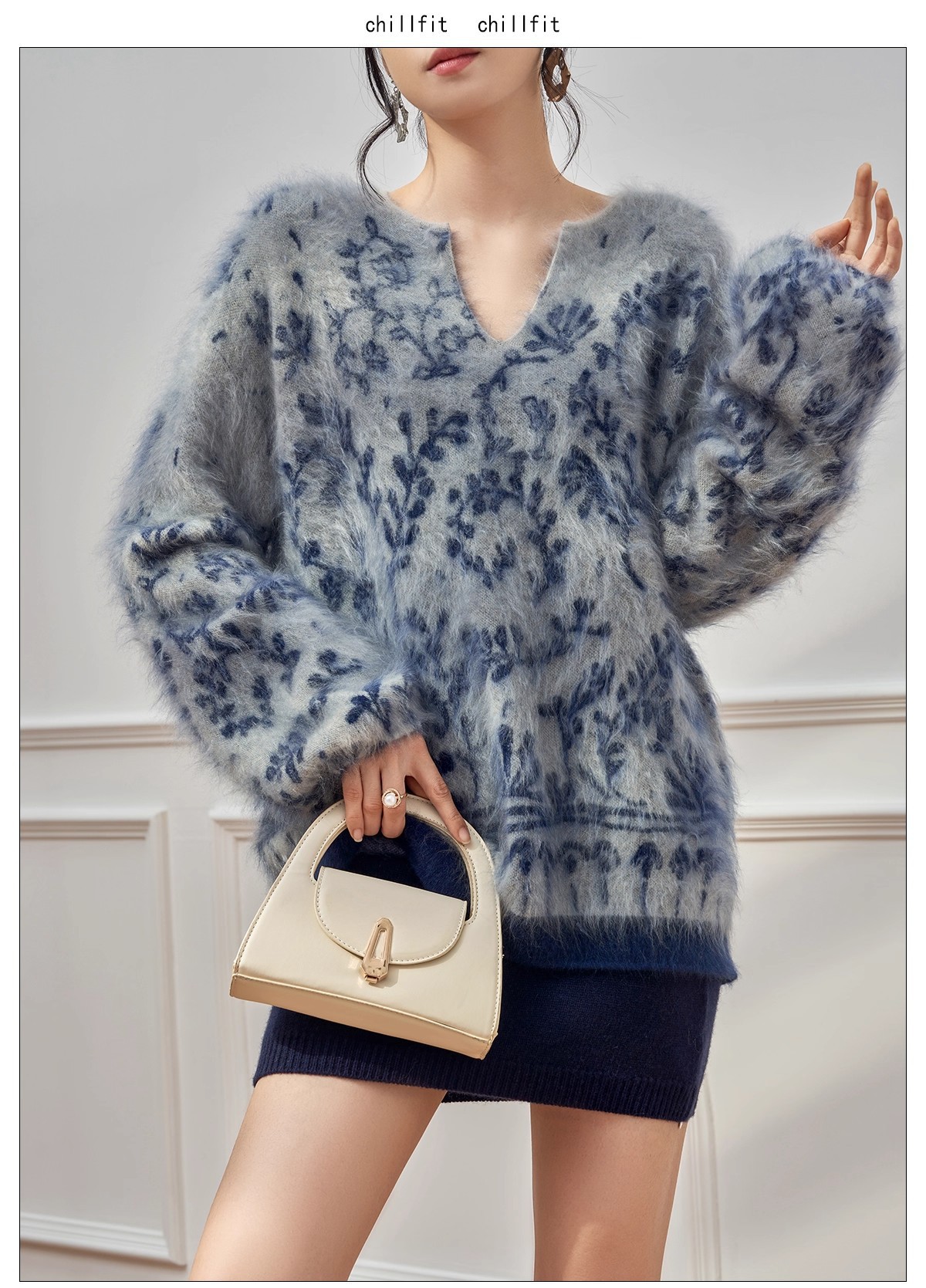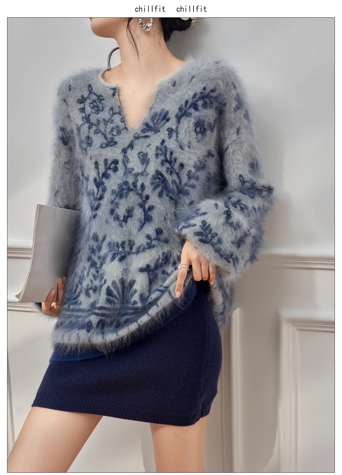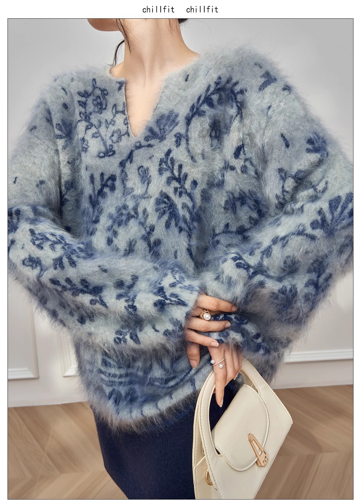 羊毛拉绒v领上衣蓝色慵懒风软糯保暖针织衫高级感复古青花瓷毛衣