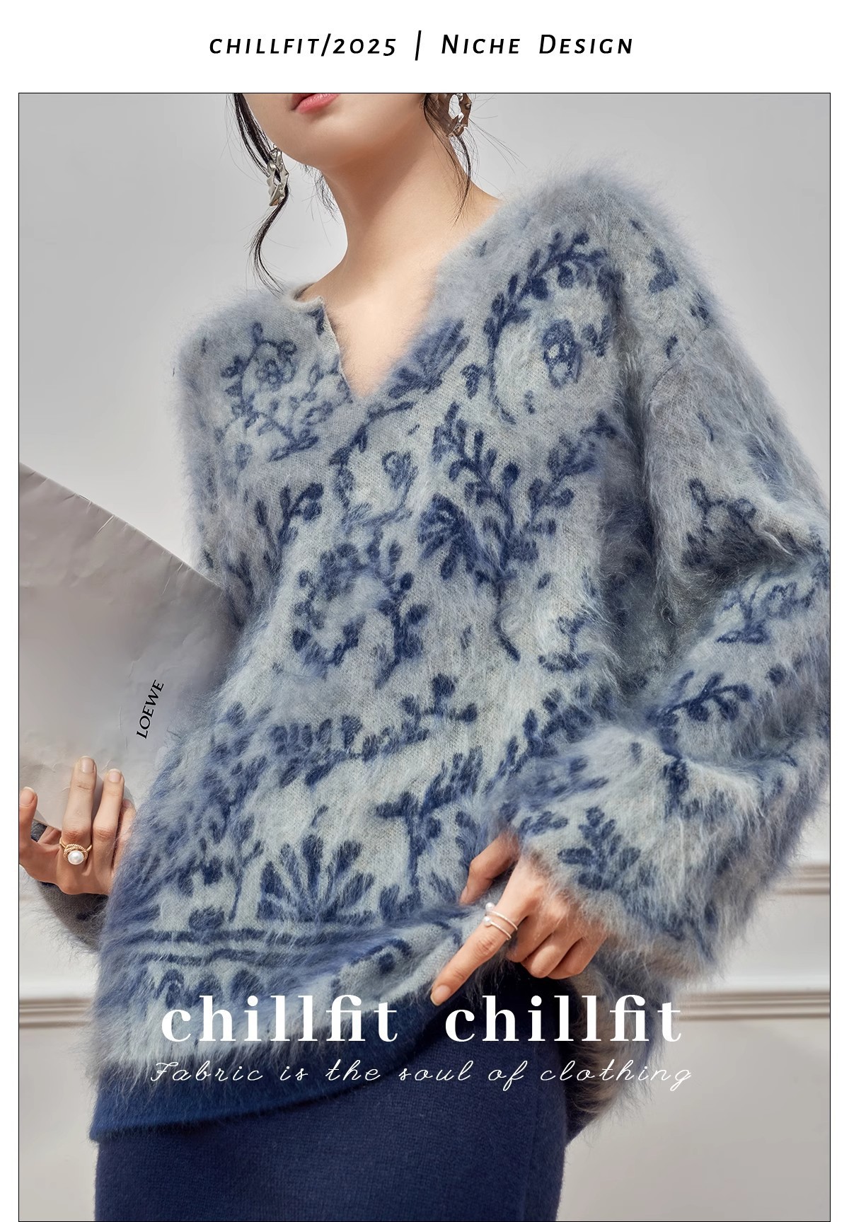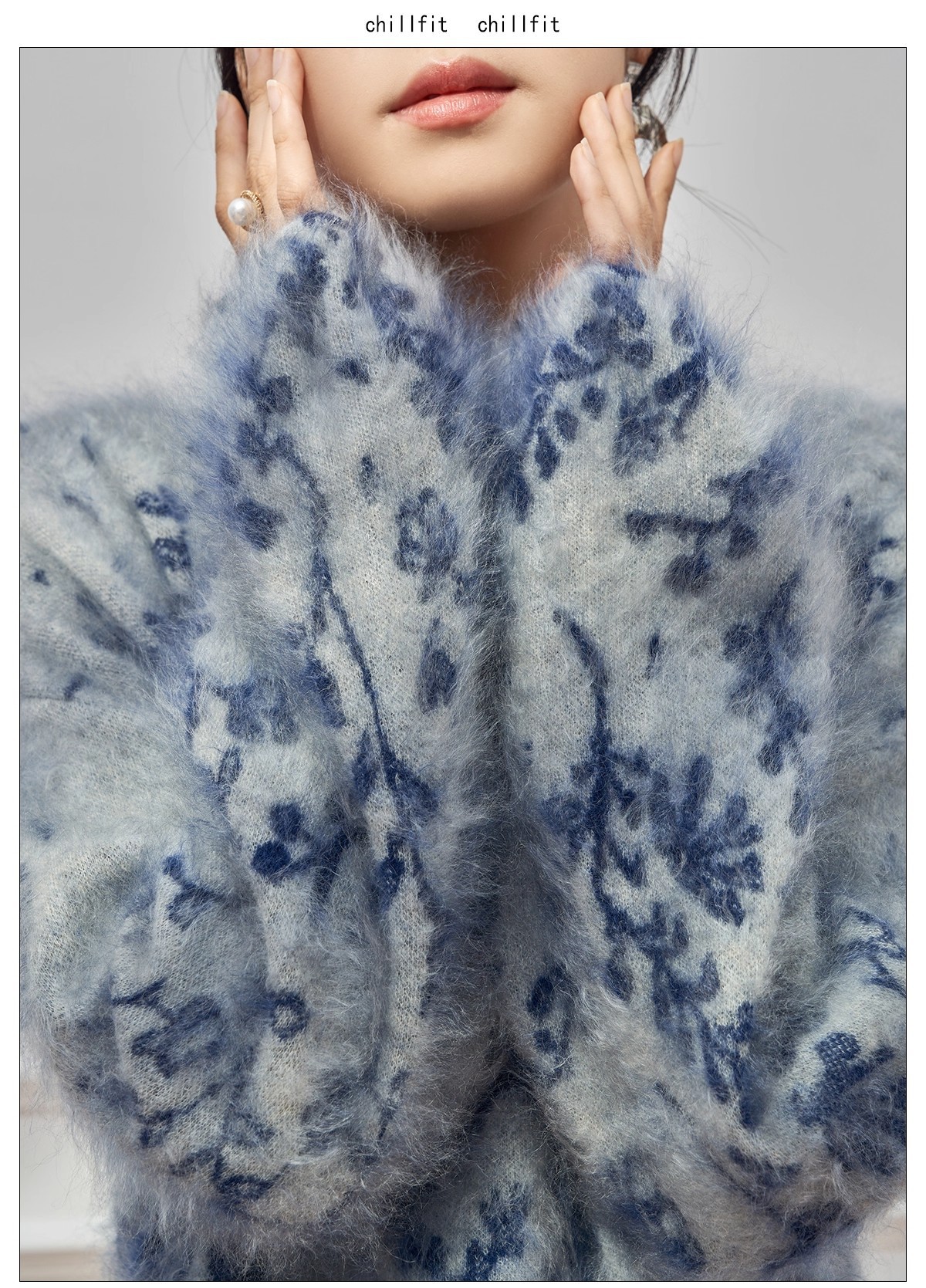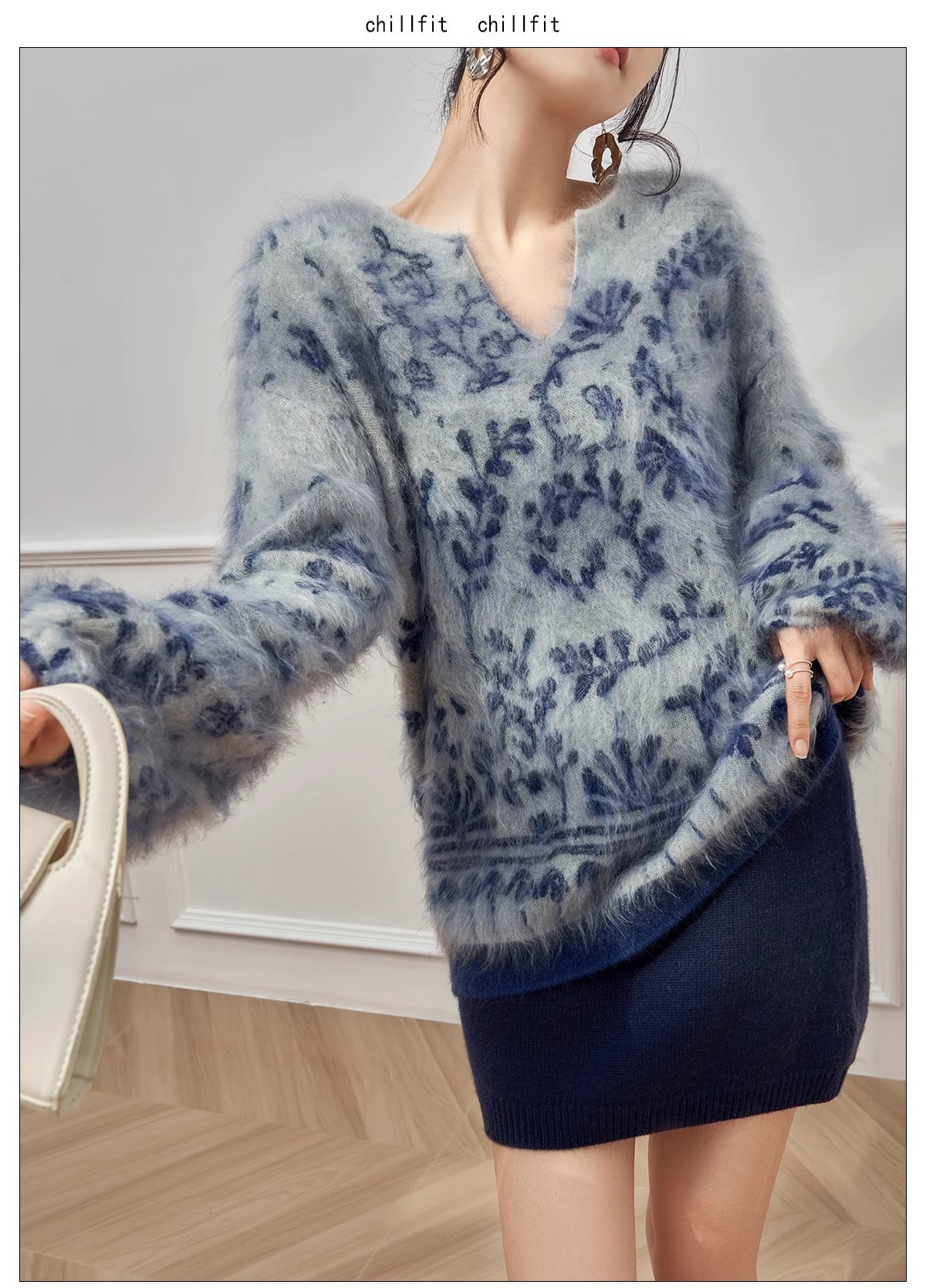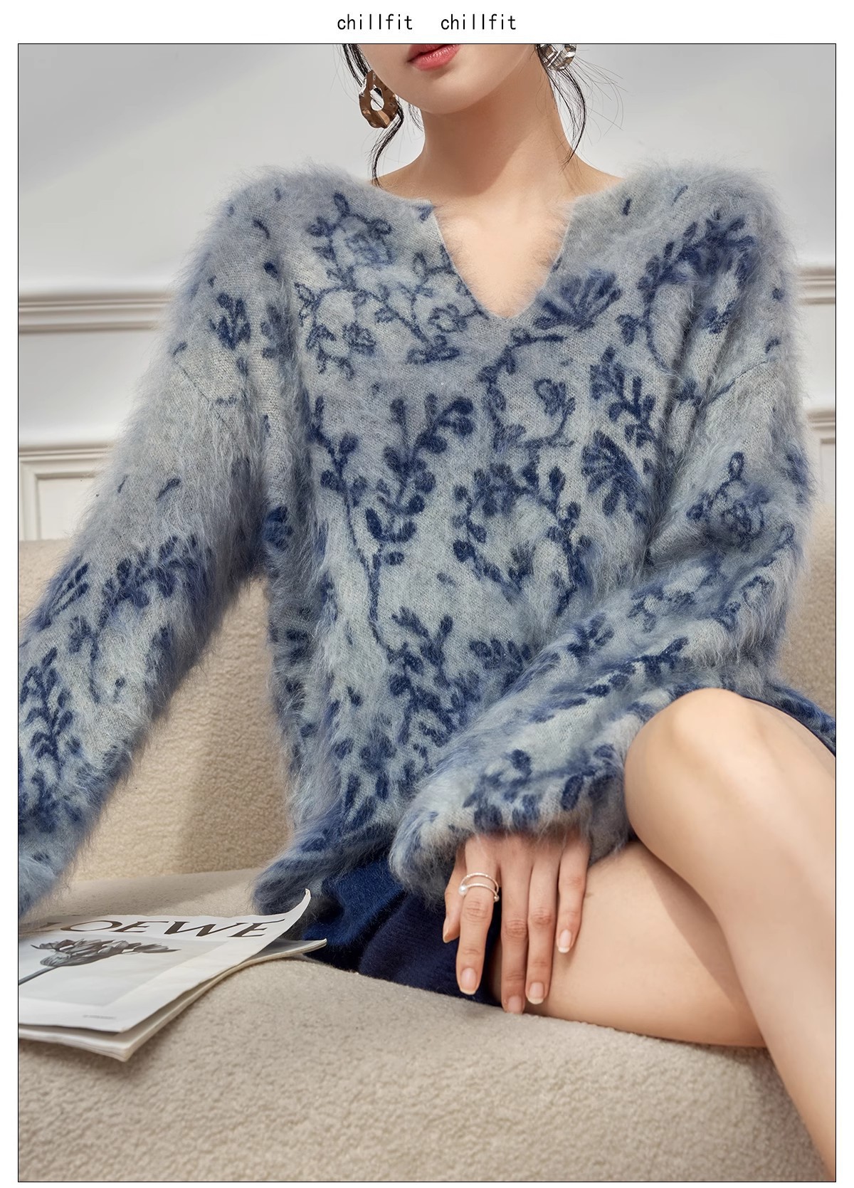 羊毛拉绒v领上衣蓝色慵懒风软糯保暖针织衫高级感复古青花瓷毛衣