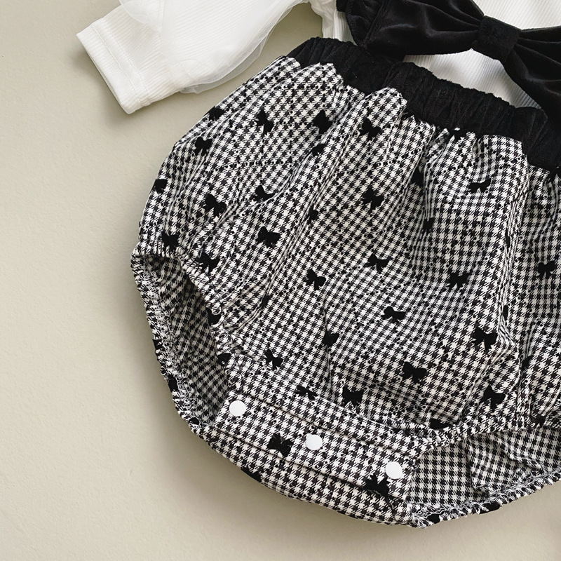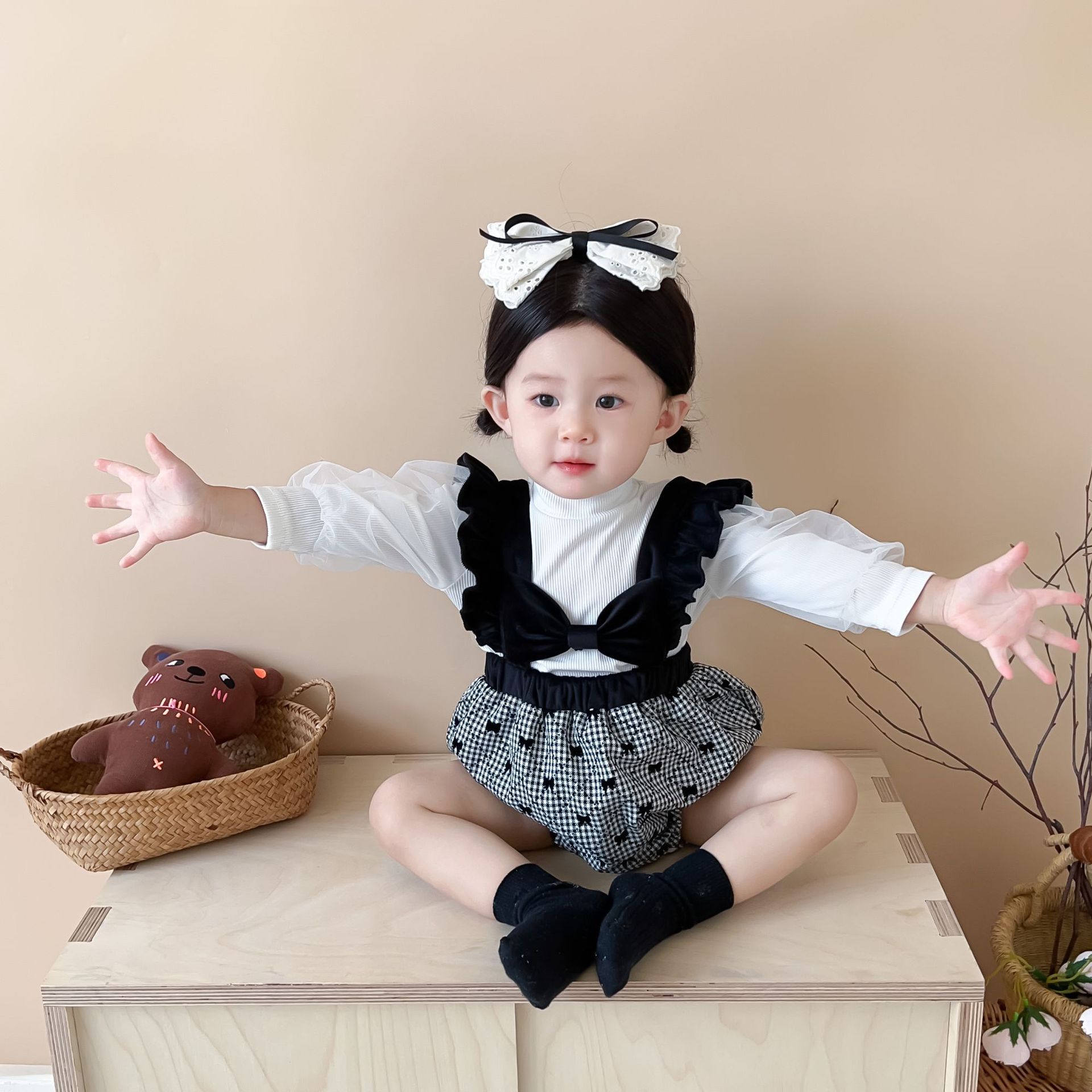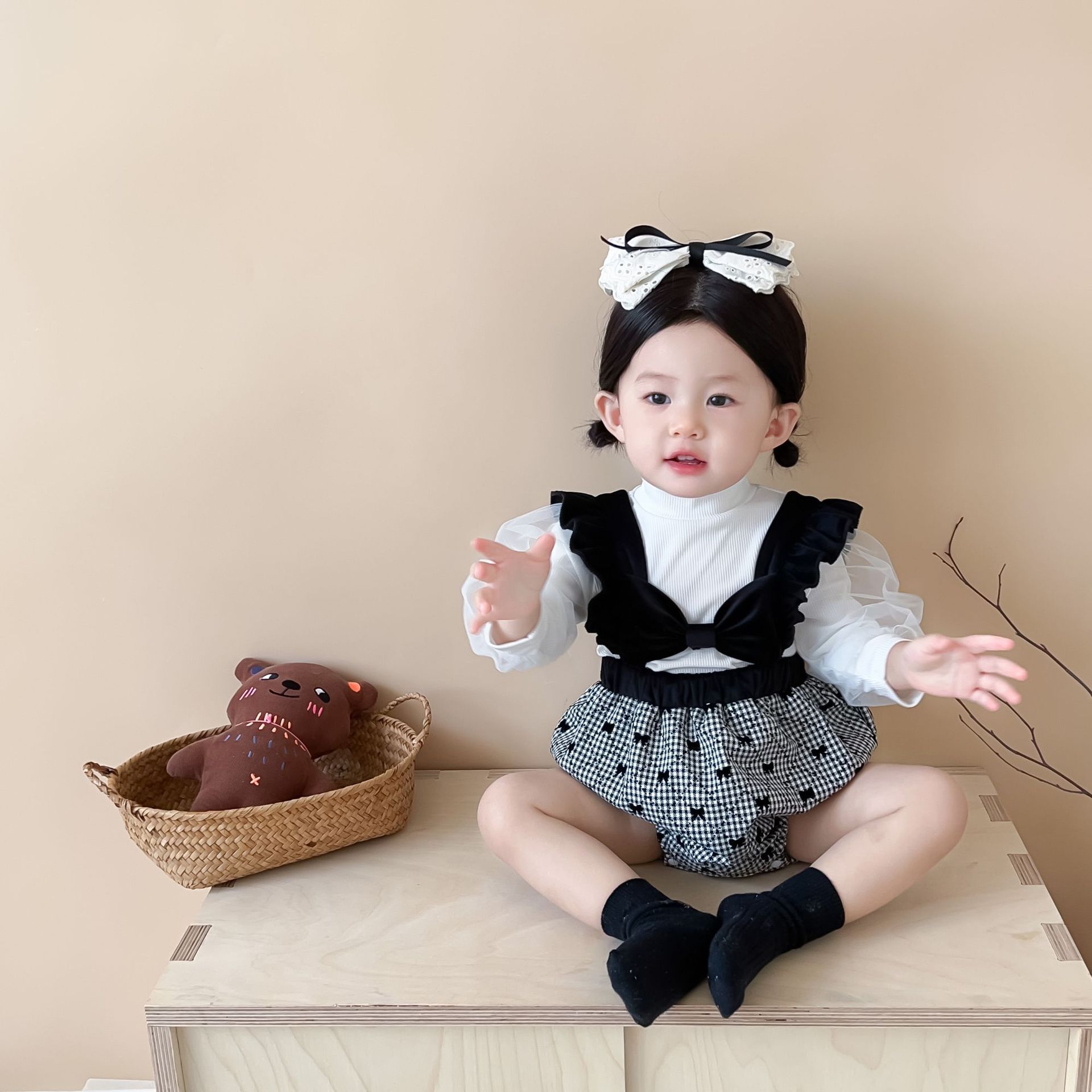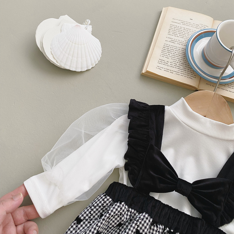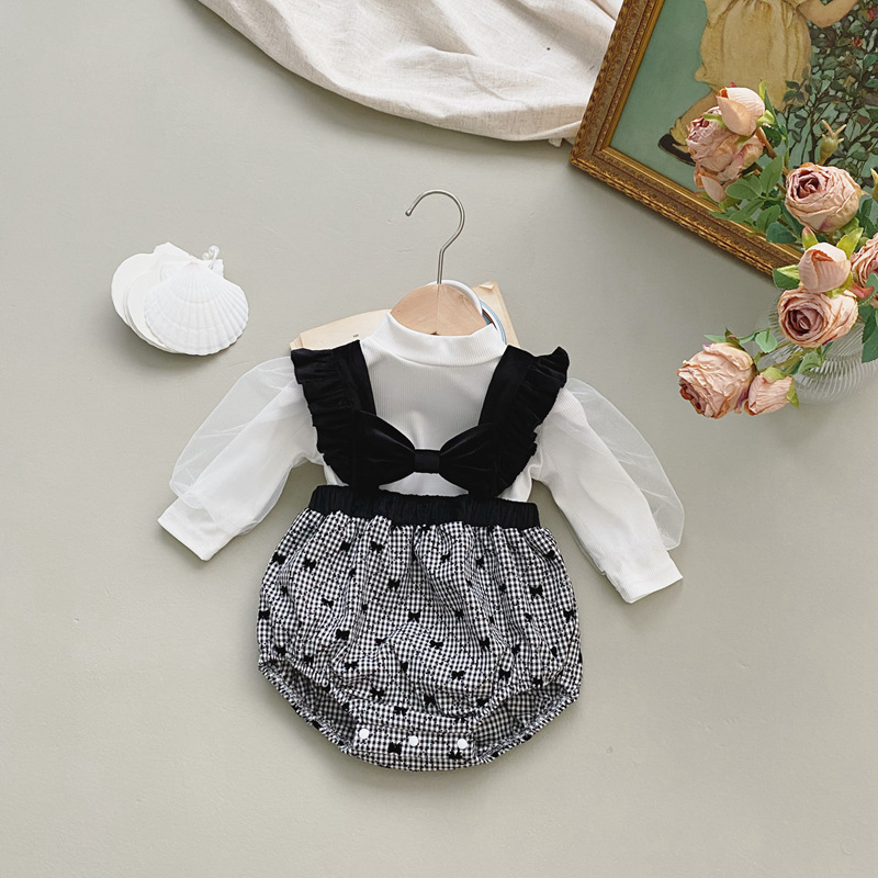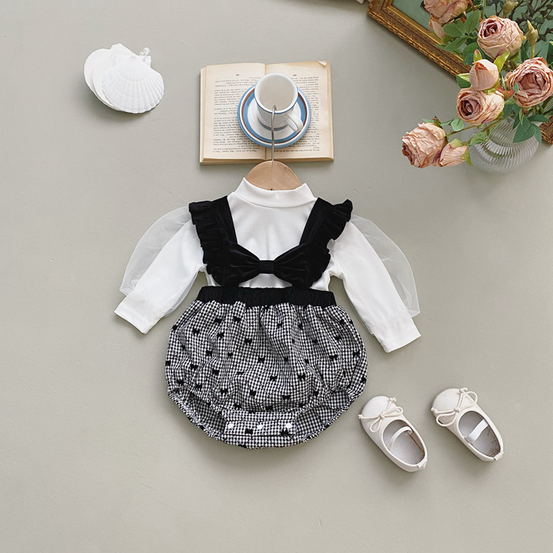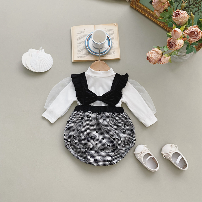 【柔软的面料,亲肤般的触感!】婴儿衣服秋款千鸟格蝴蝶结背带包屁哈衣套装婴儿泡泡袖打底两件套